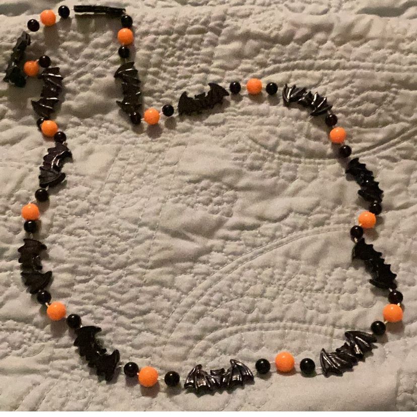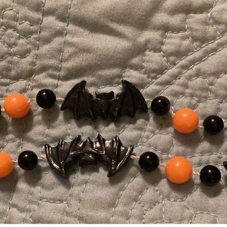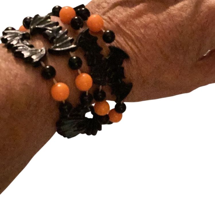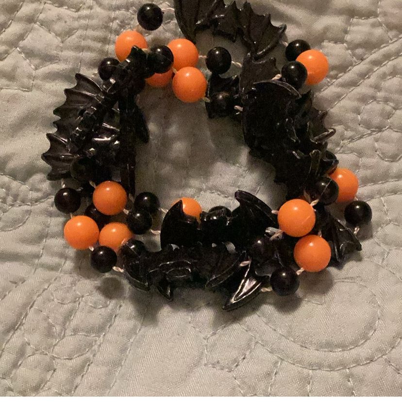 Halloween black bats, and black and orange beads plastic but it’s cute for Halloween. You can make it into a bracelet if you want if you can see the pictures I have it on my wrist.