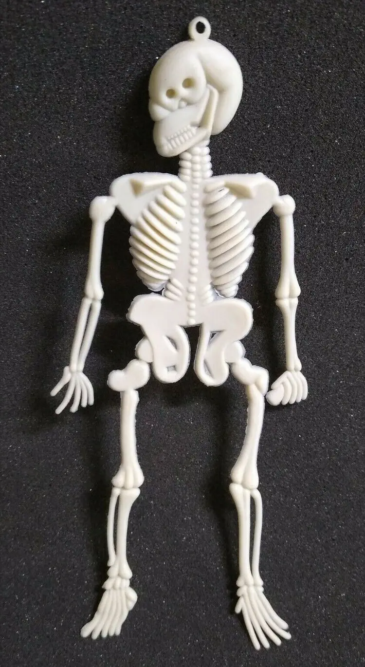 Original new old stock vintage item circa 1960's. Soft flexible plastic white color skeleton. The back is marked "Made in Hong Kong" but hard to see in photos. Size is 9" tall. Hoop on top for hanging.