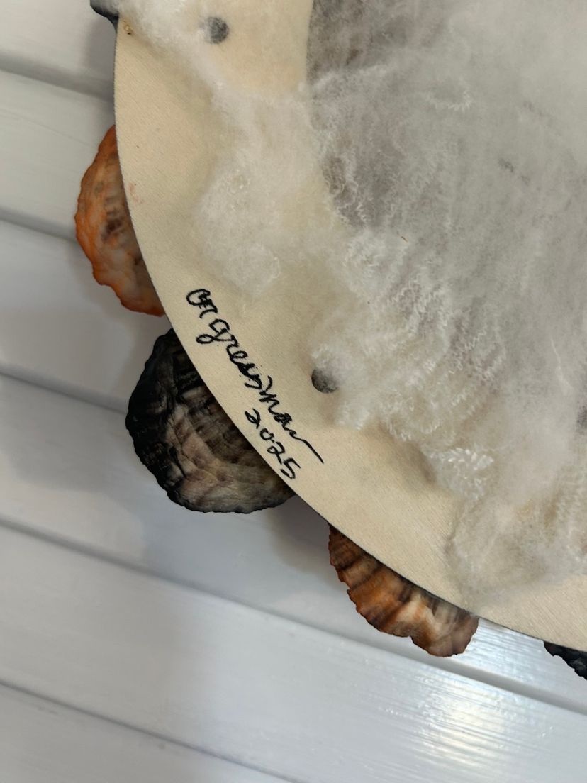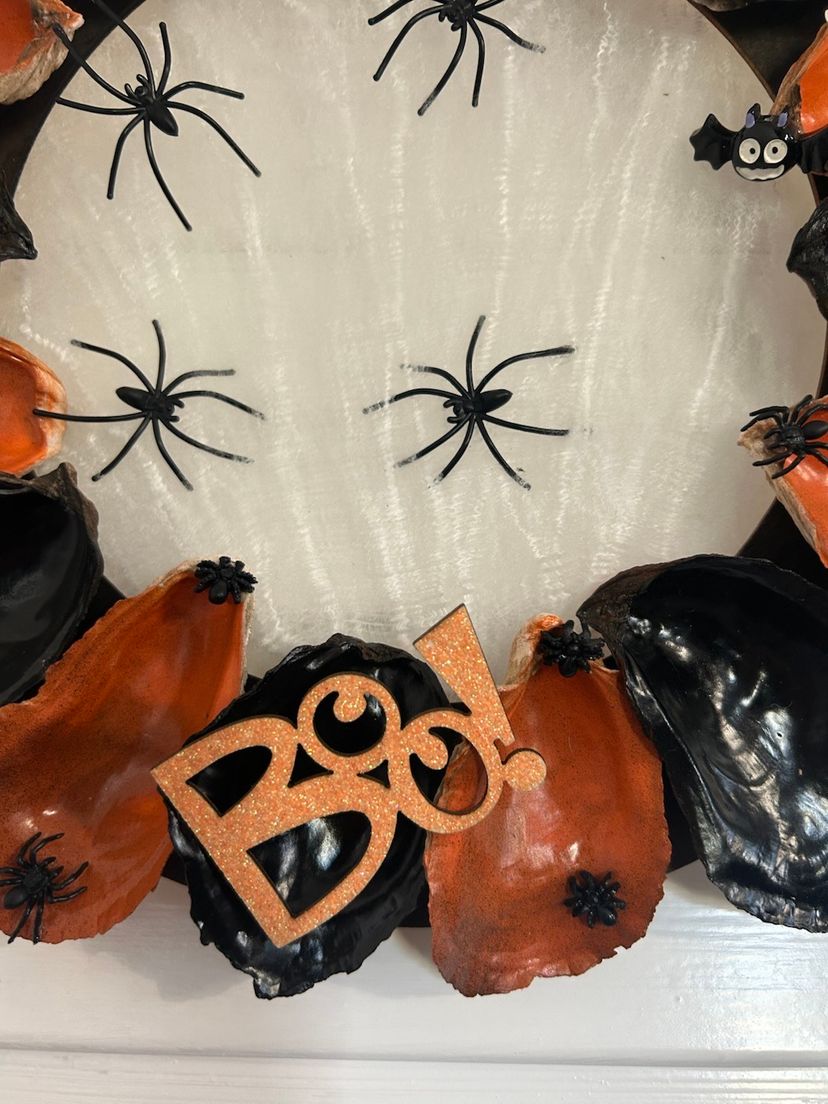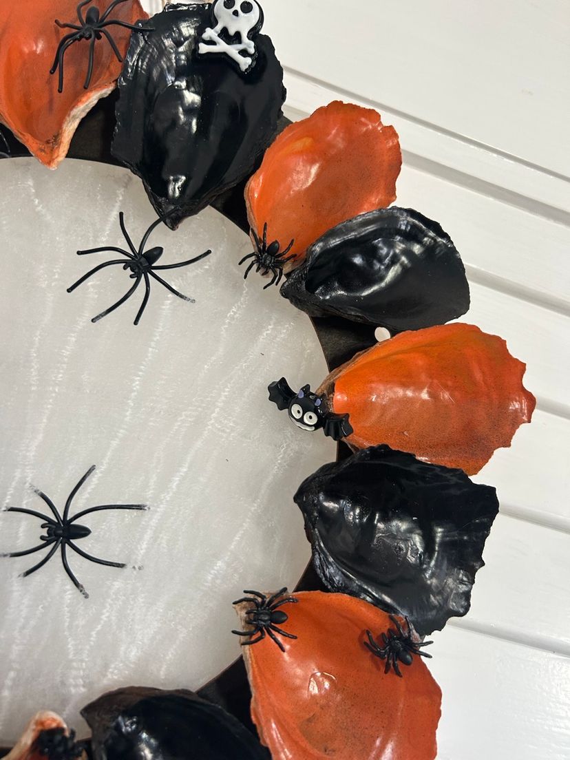 These are oyster shells that I have painted trying to obtain an eerie vibe, added spiders and web to finish it off. One of a kind.