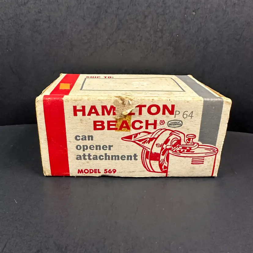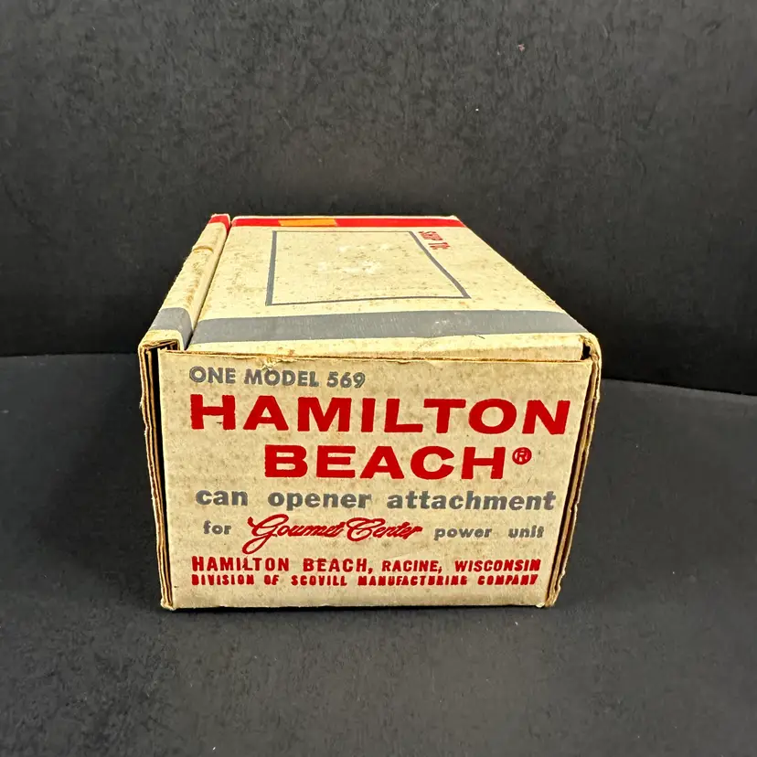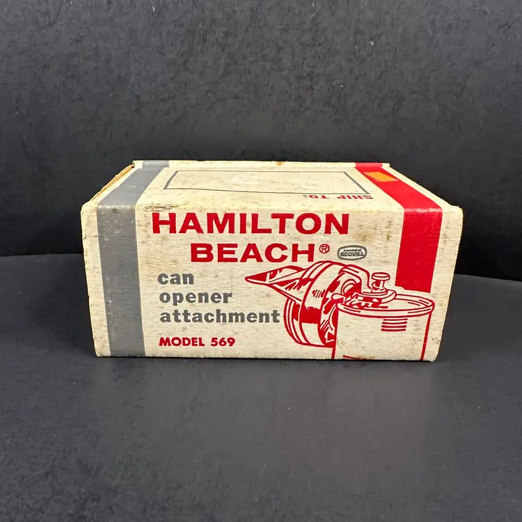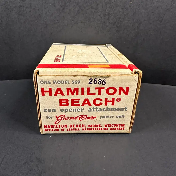 Hamilton Beach Gourmet Center Can Opener Attachment Model 569 NOS in original but opened packaging. Can opener is still in original plastic inside open box. Please see photos for all the details.