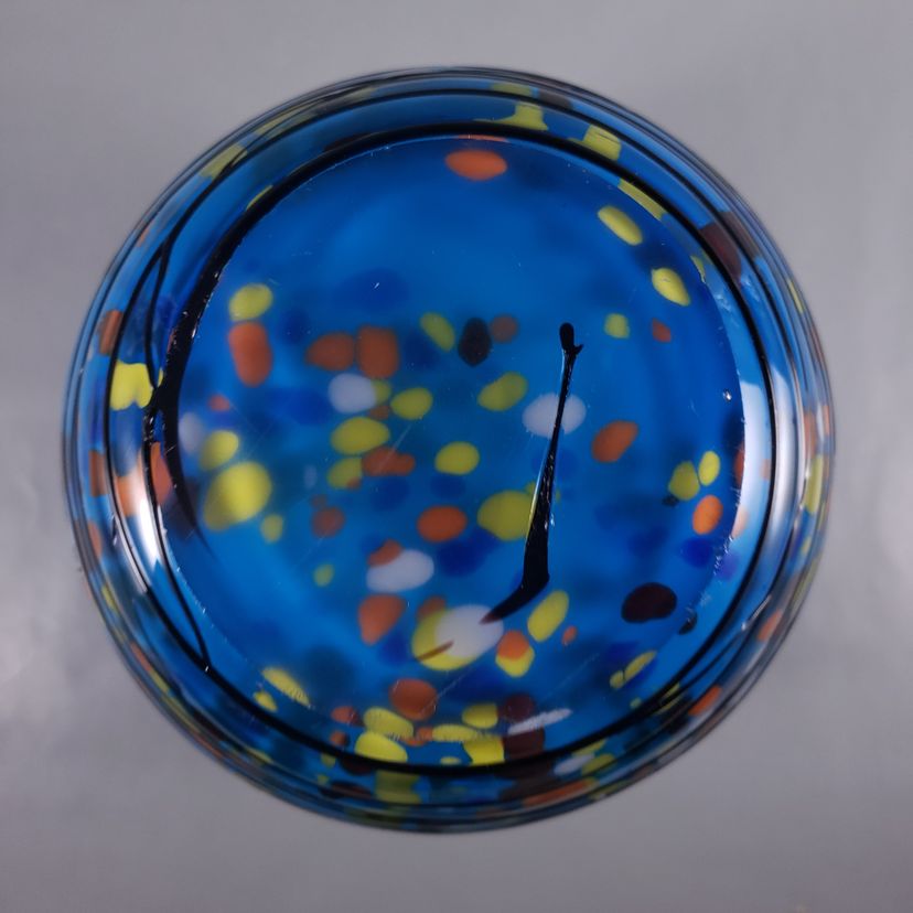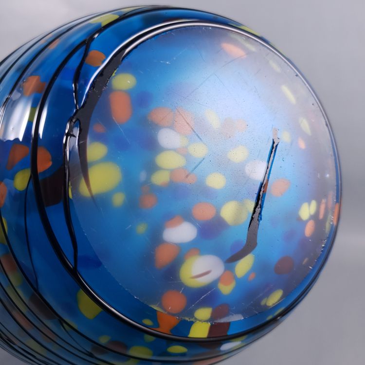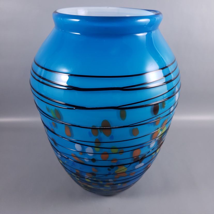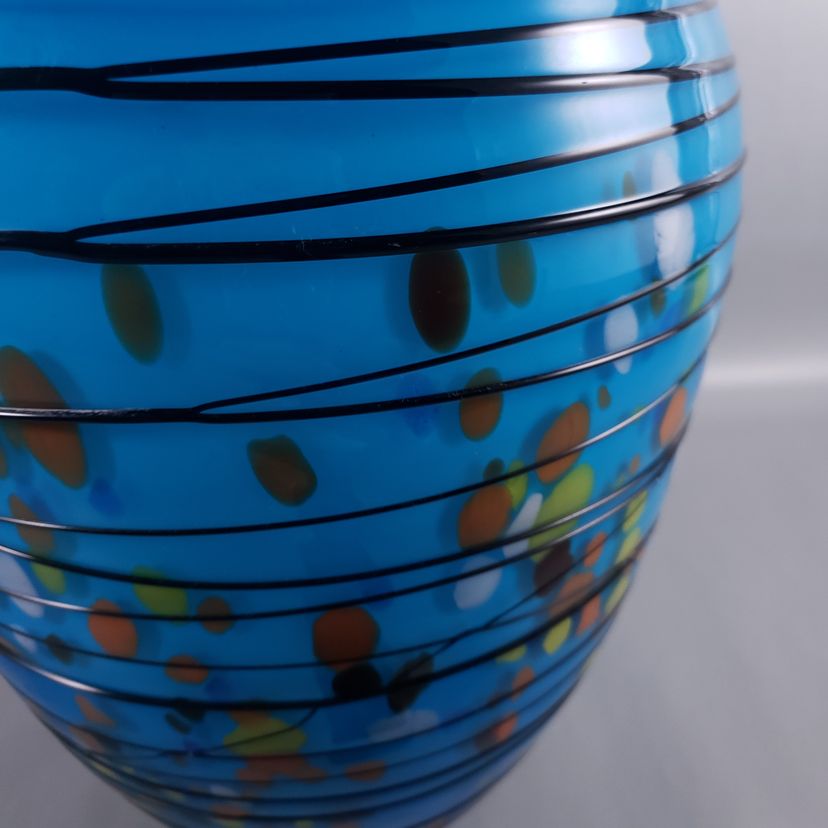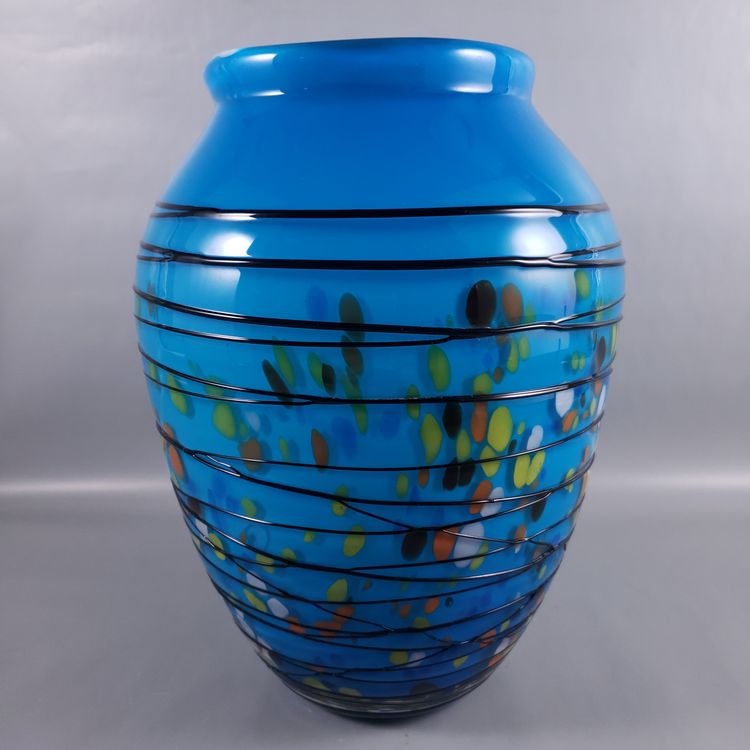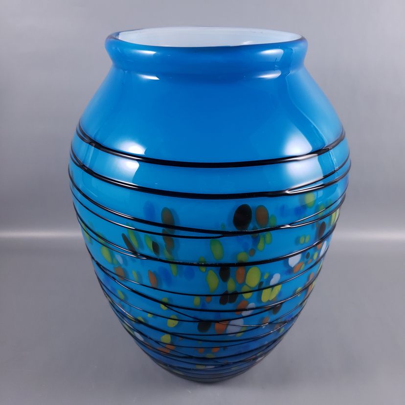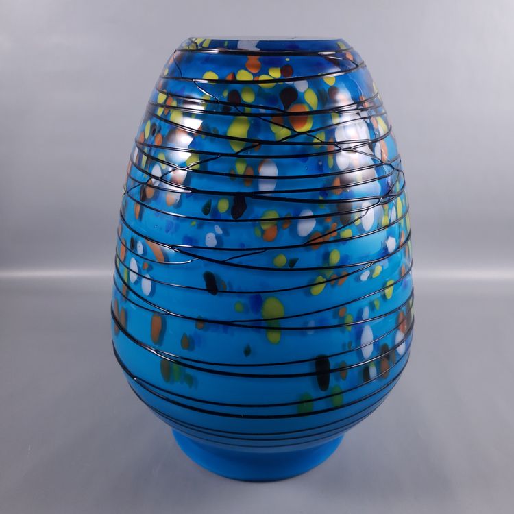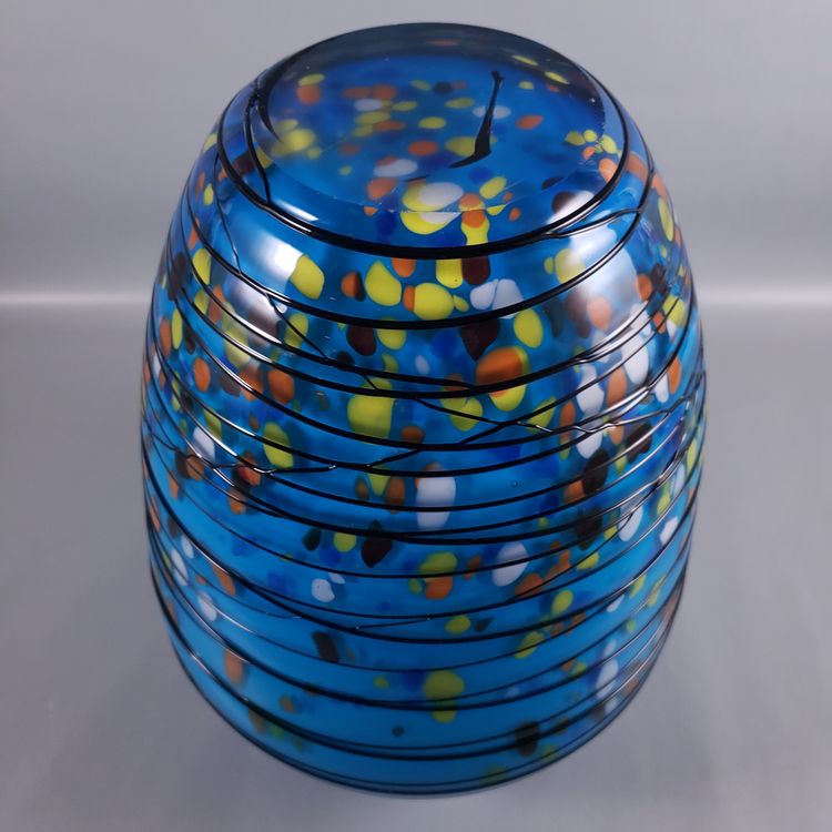 Hand Blown Colorful Confetti Black Threaded Blue Cased Large ART GLASS VASE