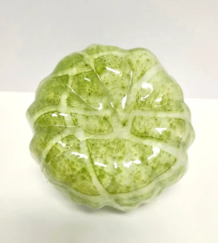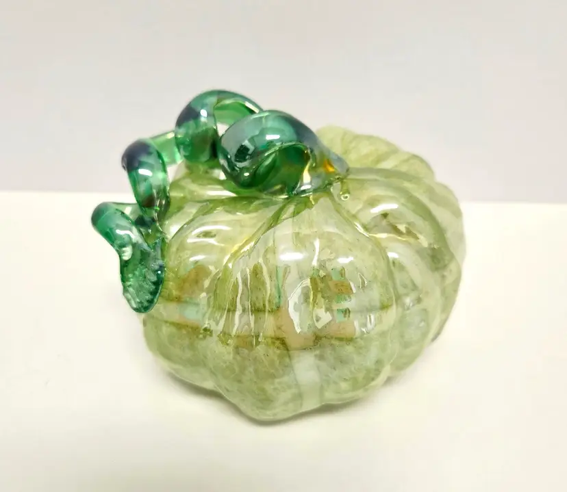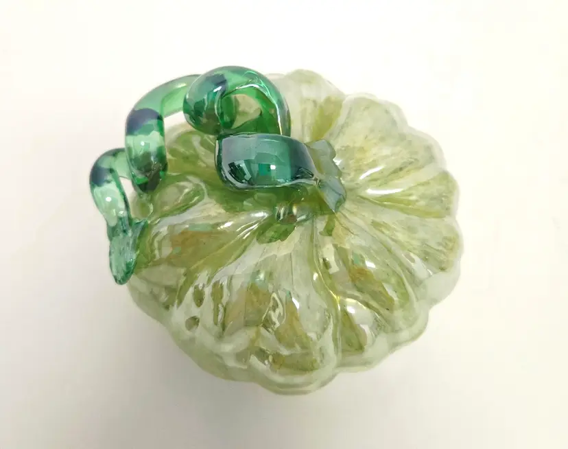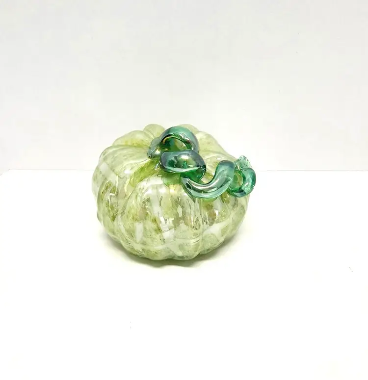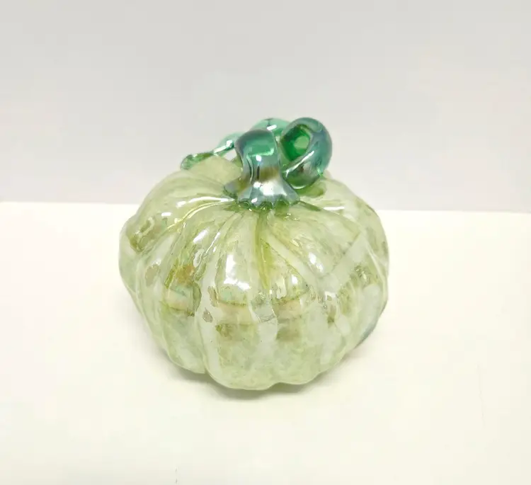 Hand blown iridescent glass pumpkin. Light green with design and emerald green stem. Beautiful and unique piece to add to your fall decor. Good condition, as seen in photos.