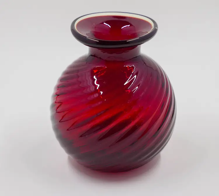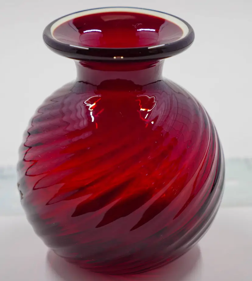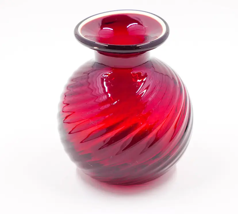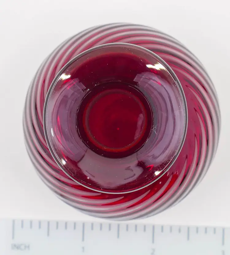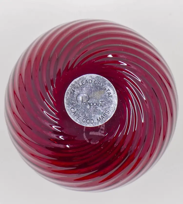 A small, 3" tall x 2.5" wide vase made of deep red, or ruby, lead crystal in excellent condition. The body of the vase is hand-blown and features a swirling, ribbed pattern that is both decorative and textural. The neck is tapered with a flat, flared rim. The bottom has a silver foil sticker that reads Pairpoint, 34% Lead Crystal, Cape Cod, Mass.