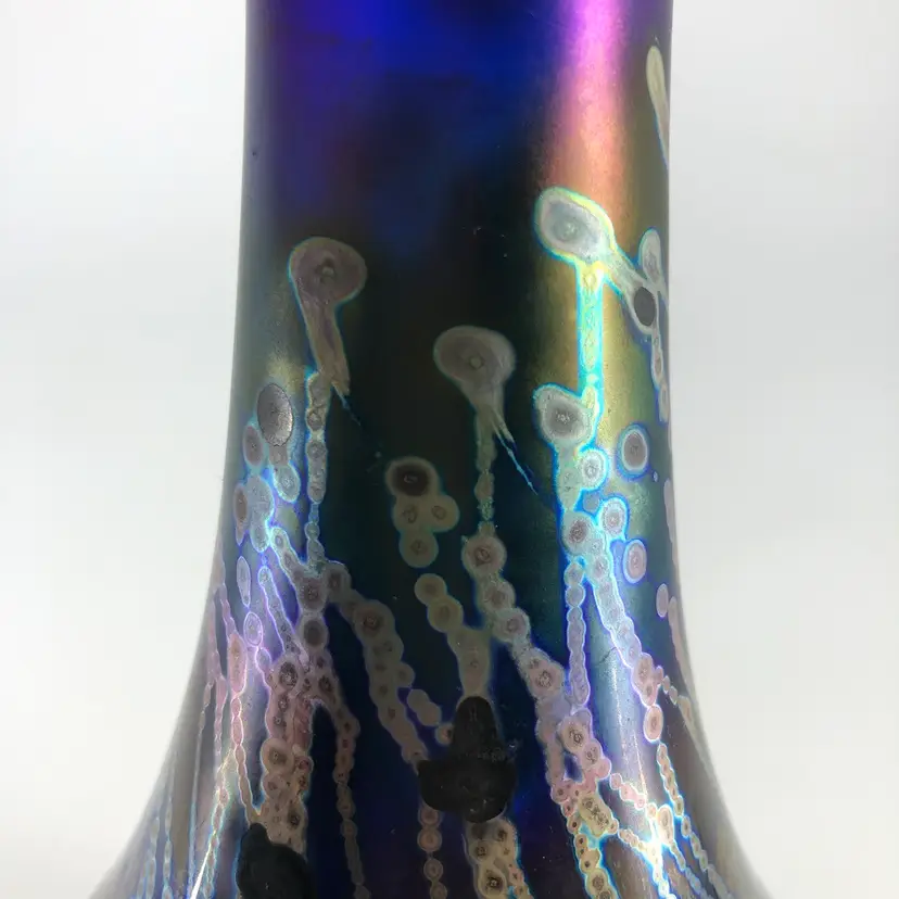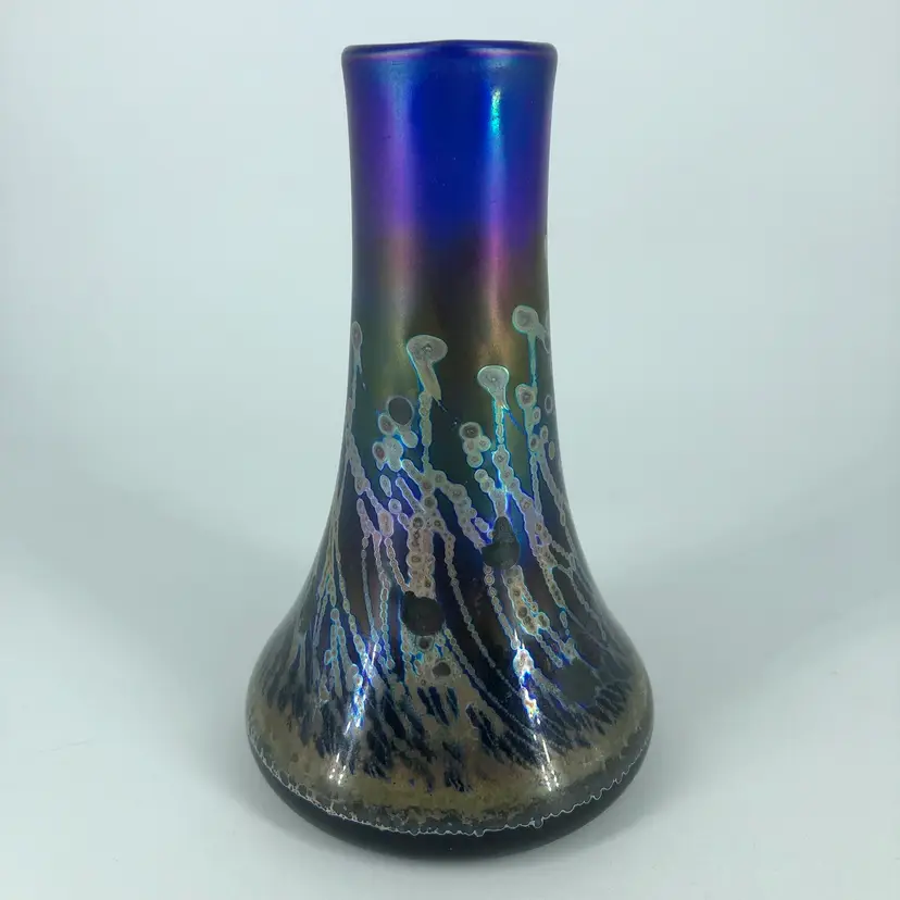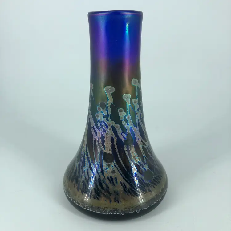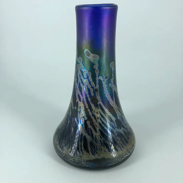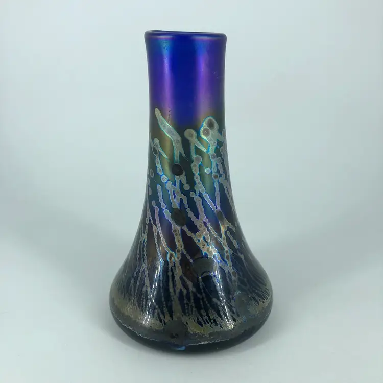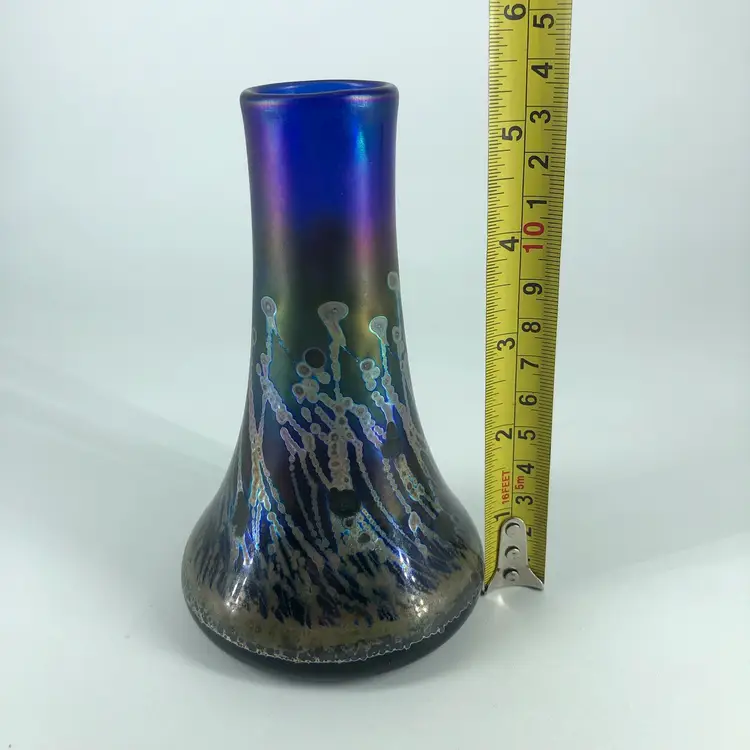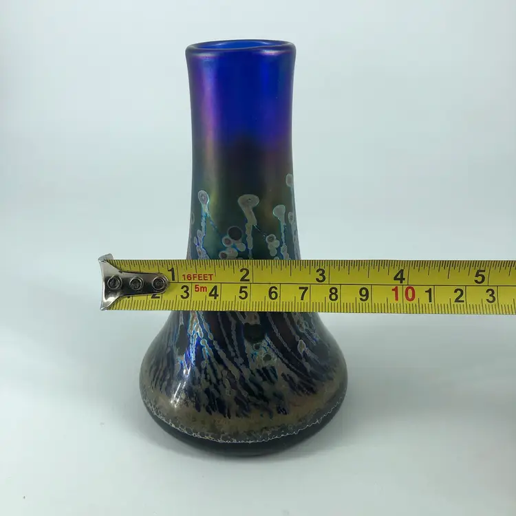 Hand-Blown Robert Coleman Iridescent Blue Art Glass Vase Signed RC