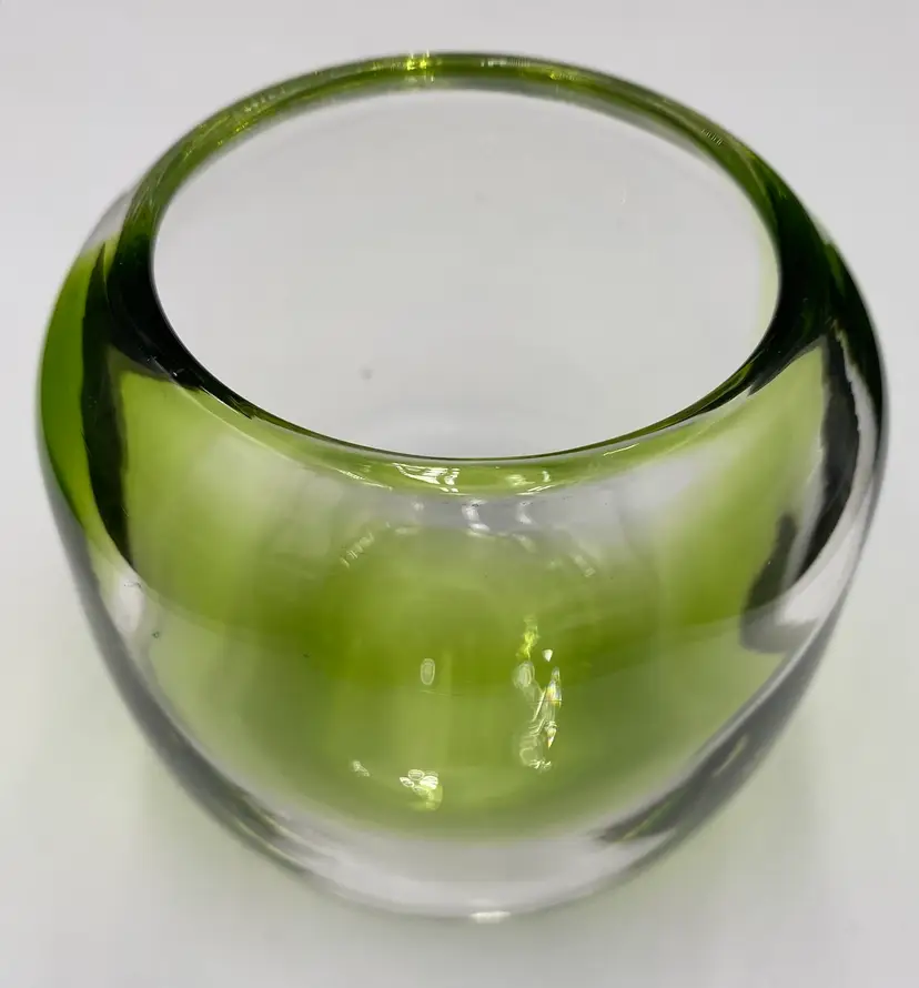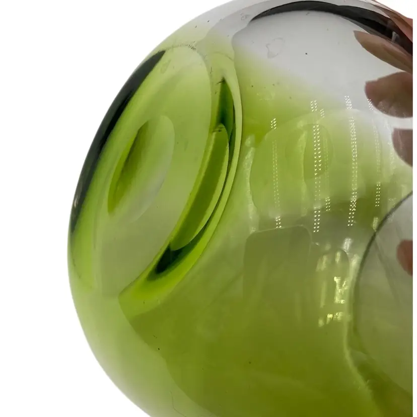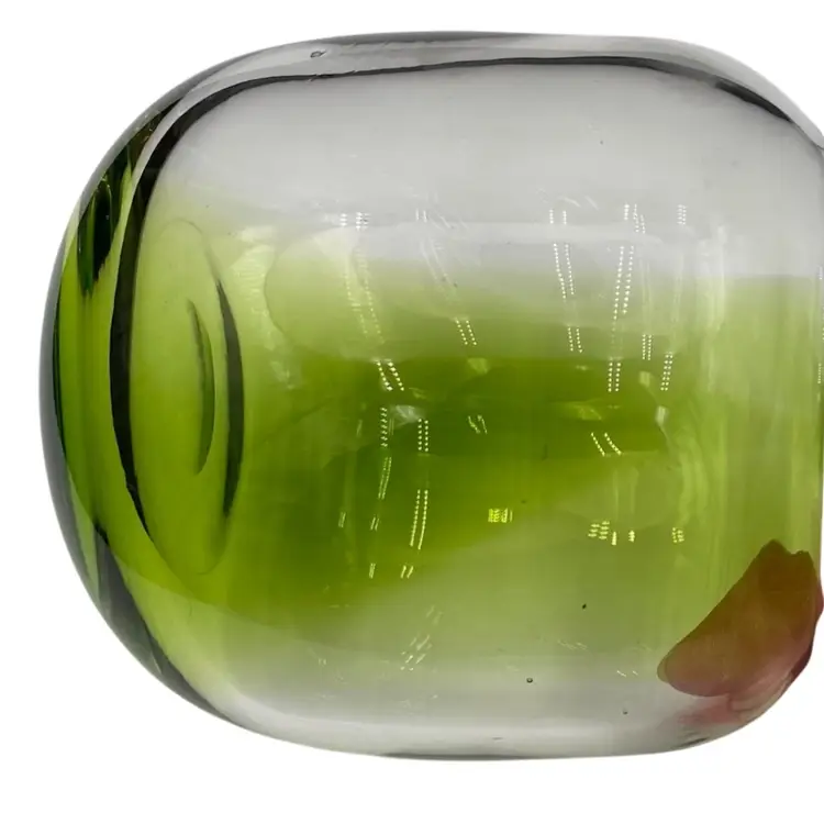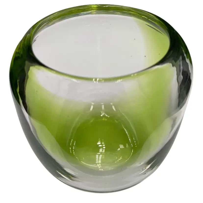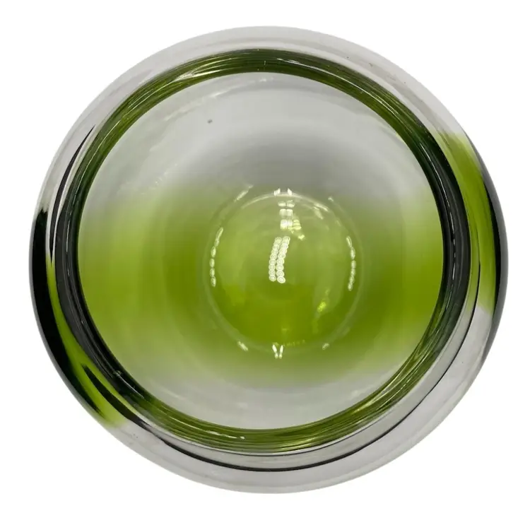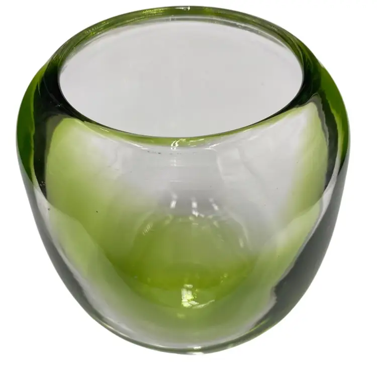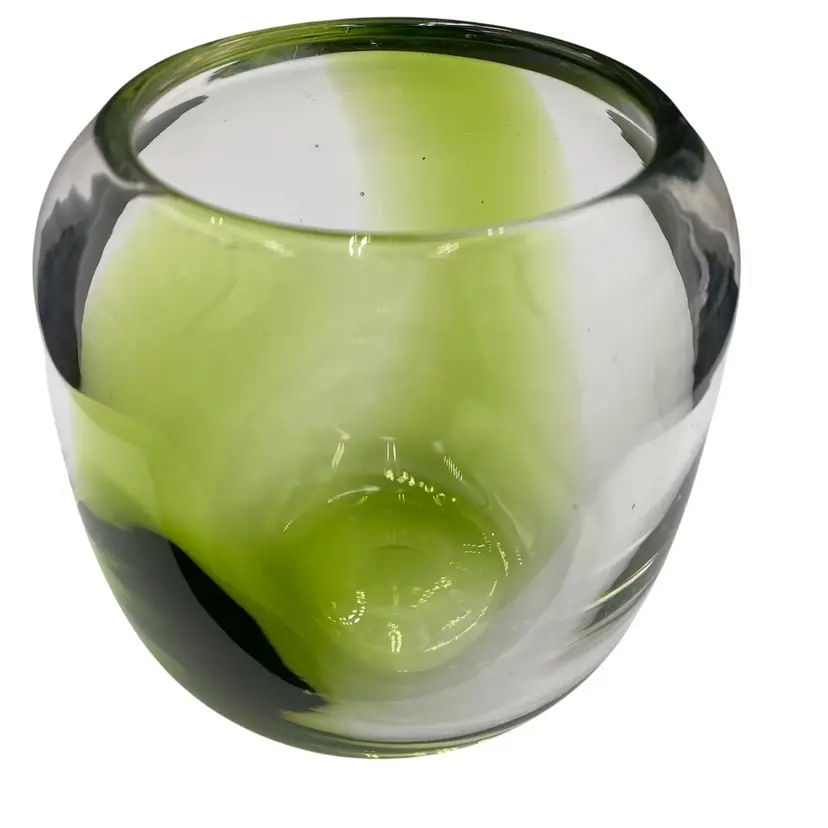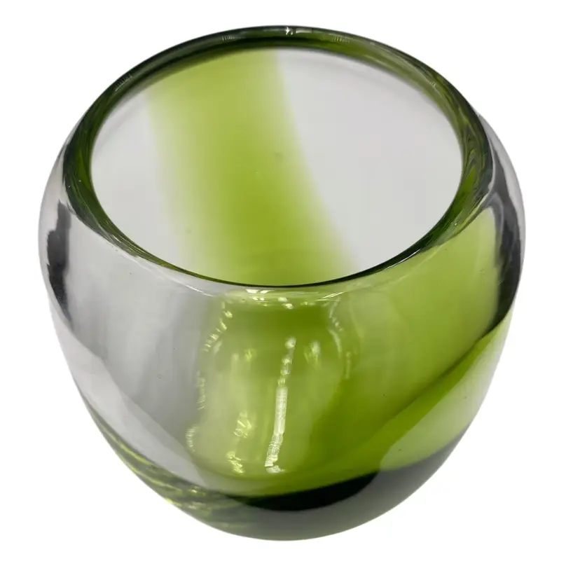 This hand-blown small vase is a sleek addition to any contemporary art glass collection. The vase features a beautiful abstract pattern in bright green alternating with clear glass and a polished base. Measuring 4.1 inches in height and 4.25 inches in width and weighing 1 pound and 2.9 ounces, this vase is substantive. It would be lovely with short-stemmed fresh or silk flowers.