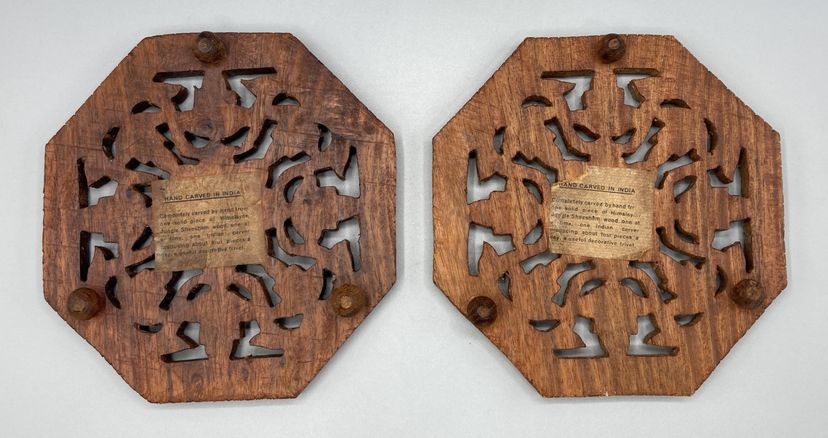 These trivets are in excellent condition. Carving is very detailed. The trivets measure approximately 6" across.