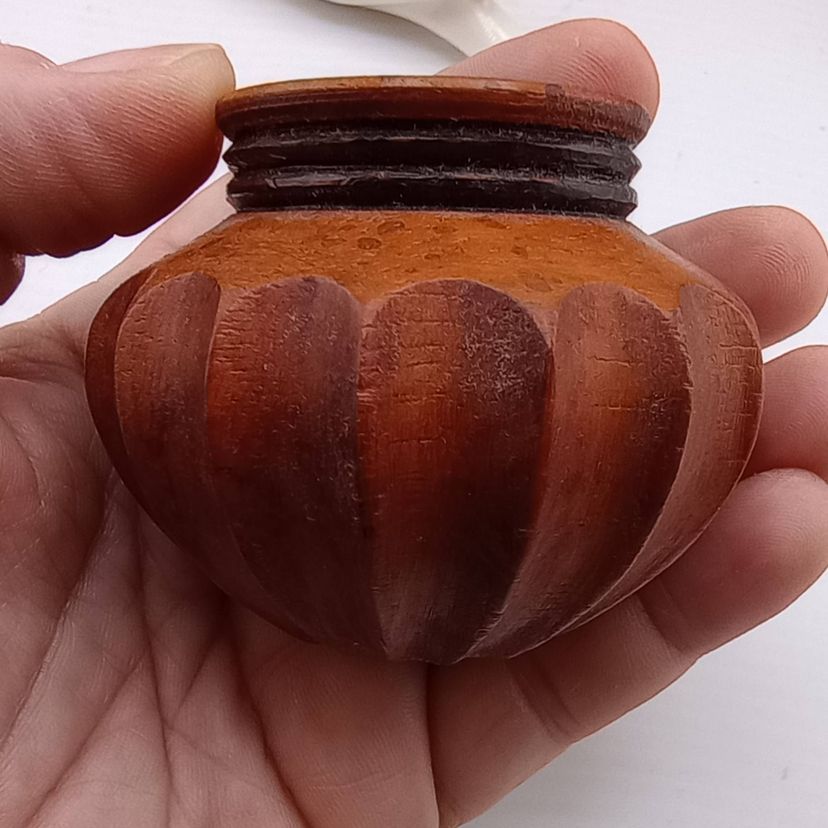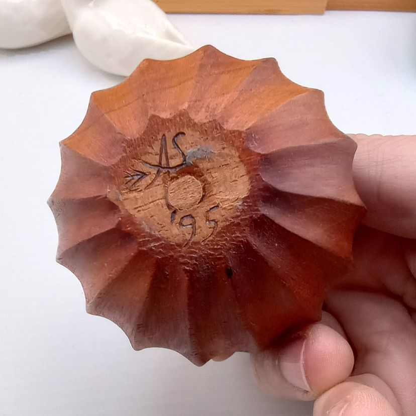 This is a beautiful hand-carved mini pot signed by the artist. It's in excellent vintage condition with no noted flaws.
