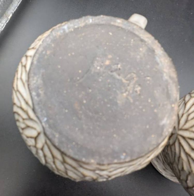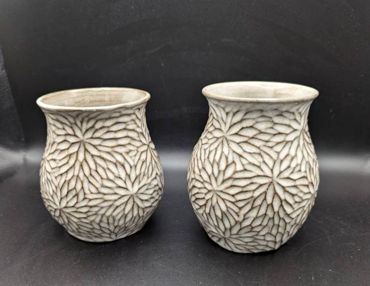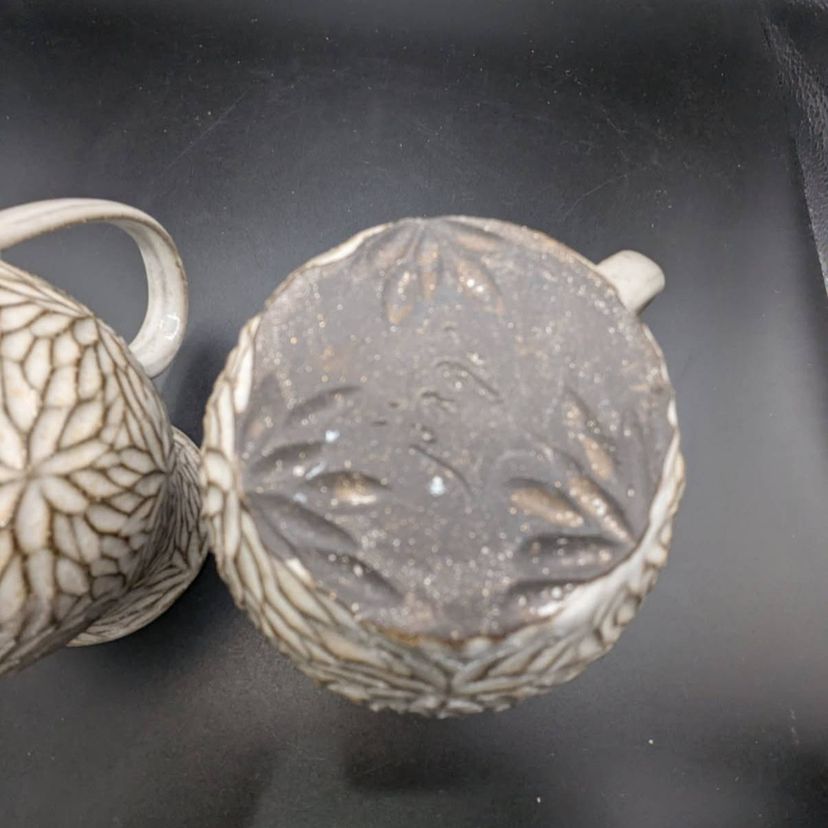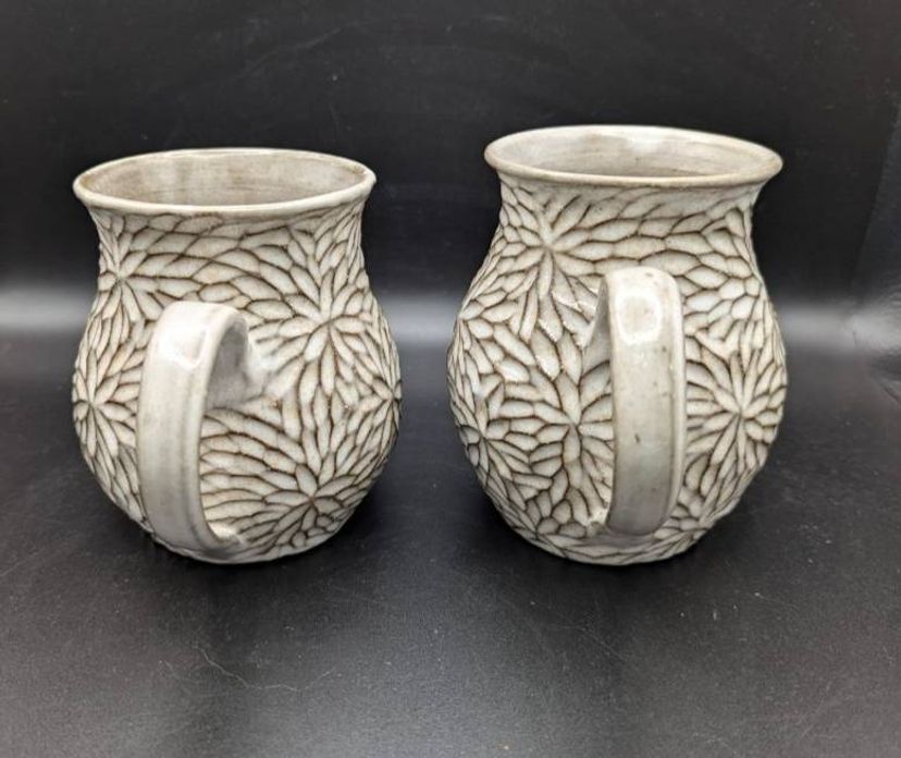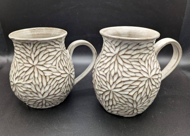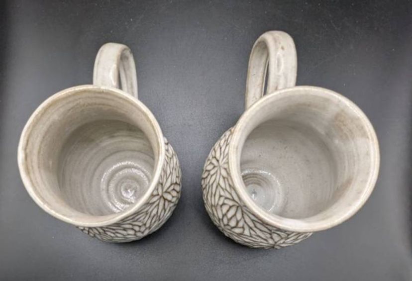 Jiaqi Lin is a ceramic artist - Based in Michigan She creates wheel thrown functional stoneware pieces. These mugs are hand carved with an intricate pattern of petals.