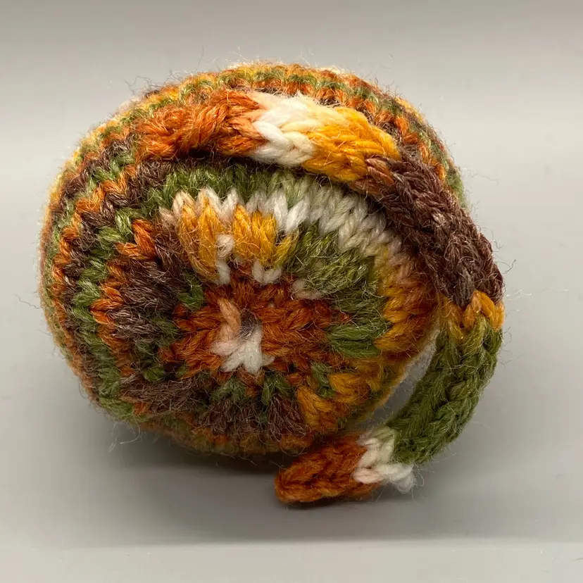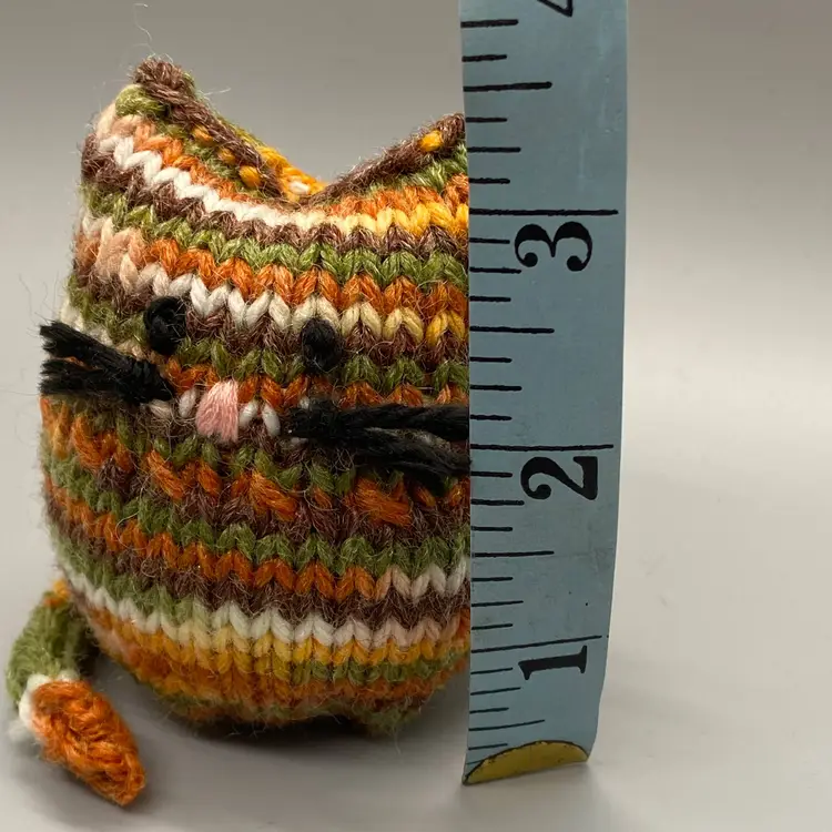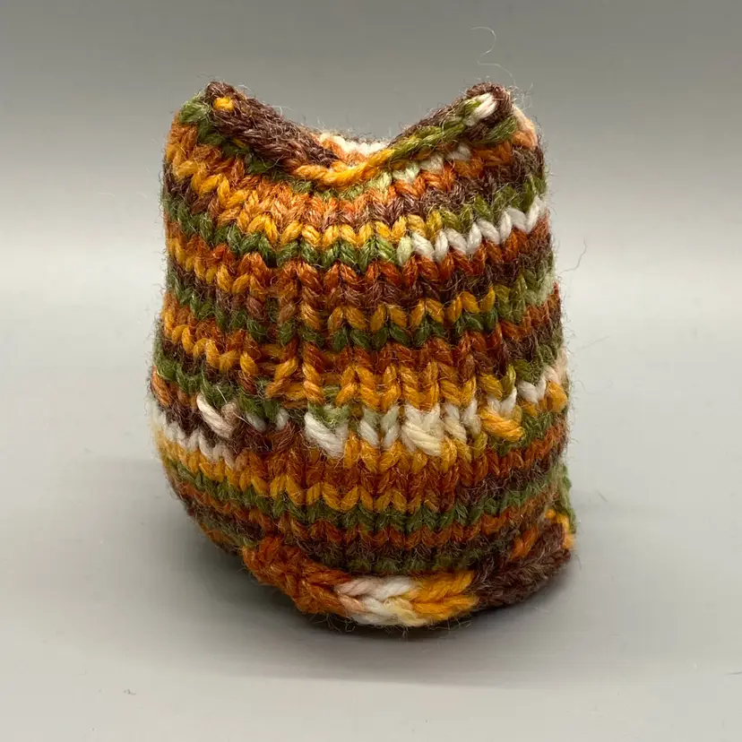 hand knit acrylic yarn browns, green, cream, gold fall colors embroidered face approx. 3.25" tall sits easily on shelf or table add to your fall decor