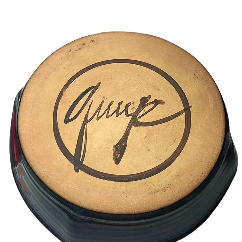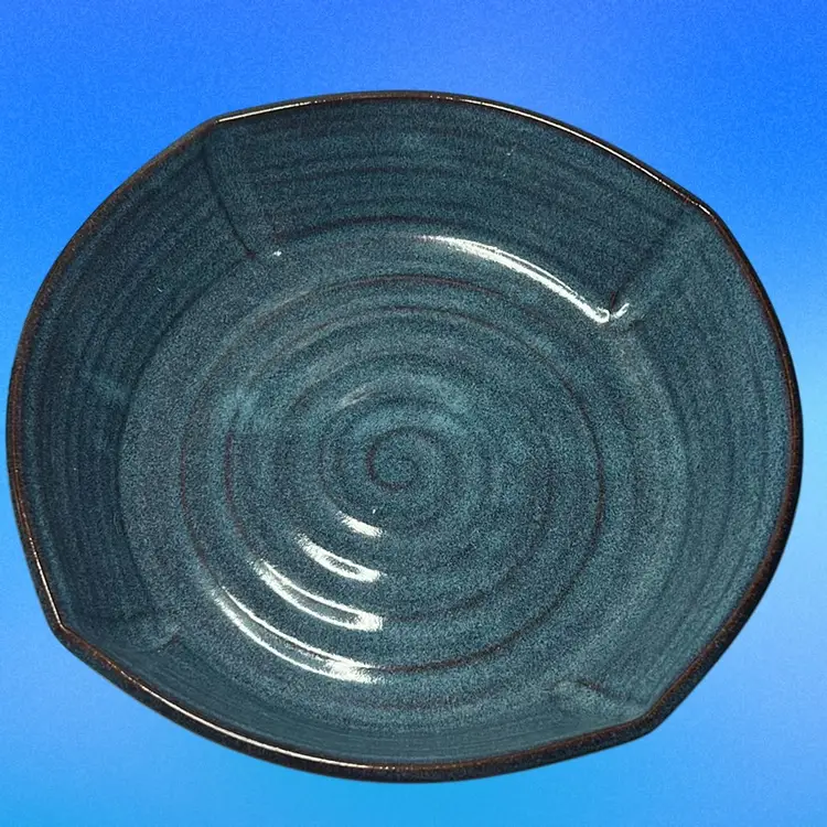 It is an organic unique shaped bowl with a slightly upturned rim and 4 inside indentations. It has a swirl glaze inside the bowl. No damage and measures 2.5” tall & 10.5” wide