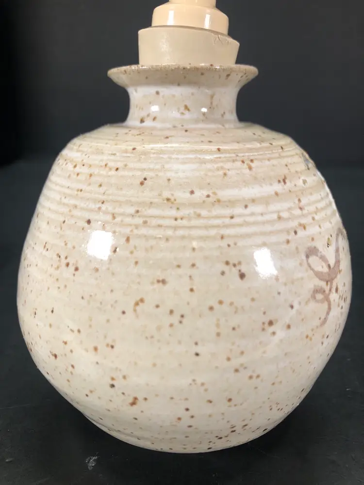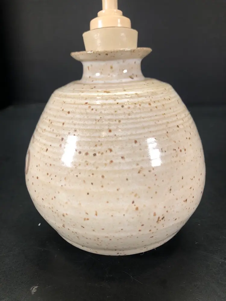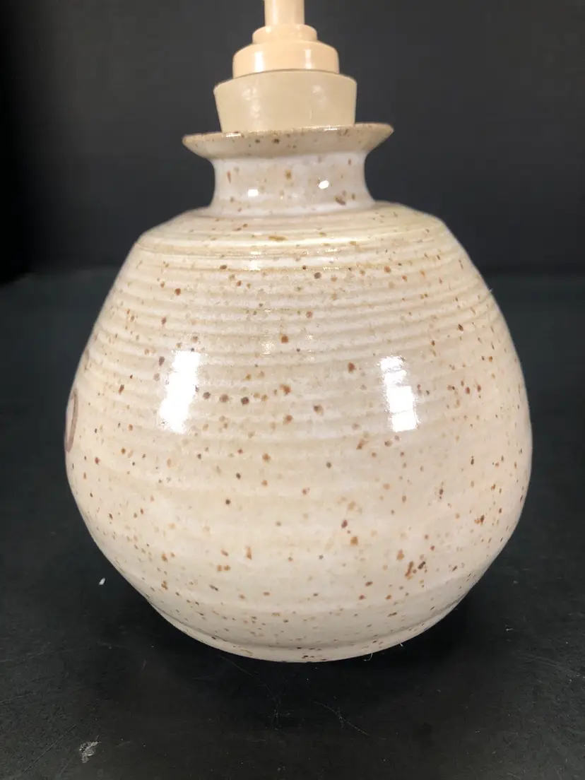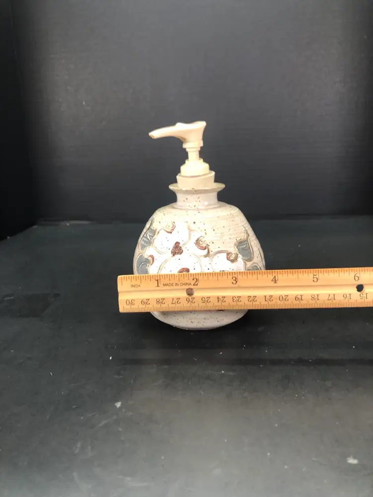 This is 6” tall and 4” across at widest part. It is signed but unsure of the mark. Possible IHT. The dispenser part has a chunk taken out. See photos.
