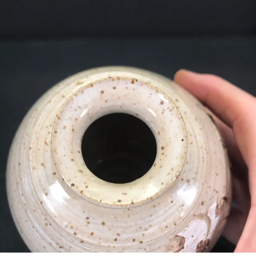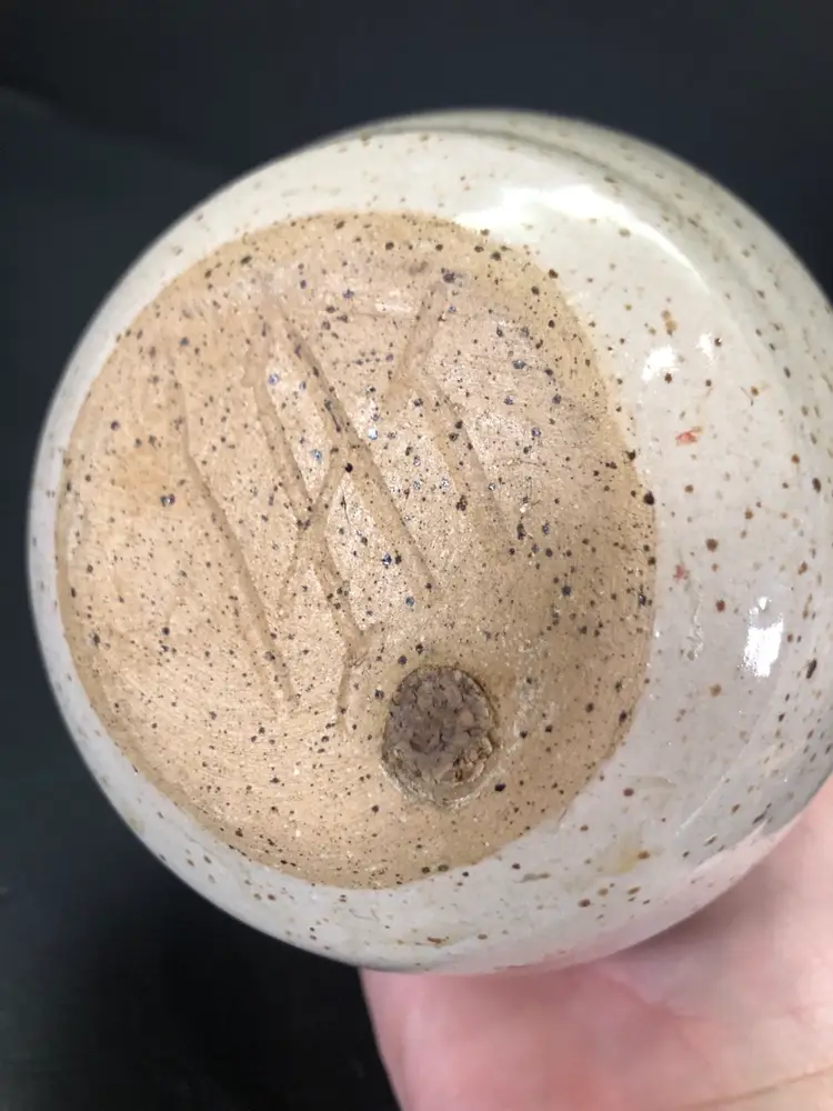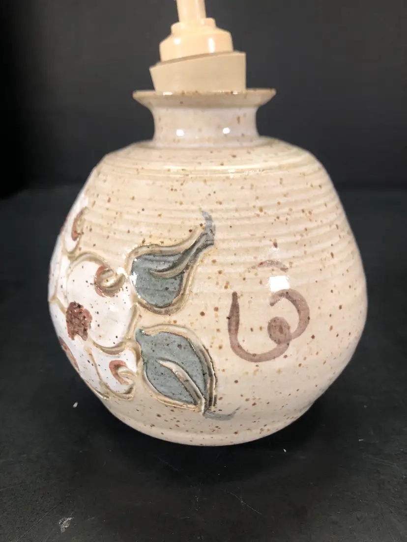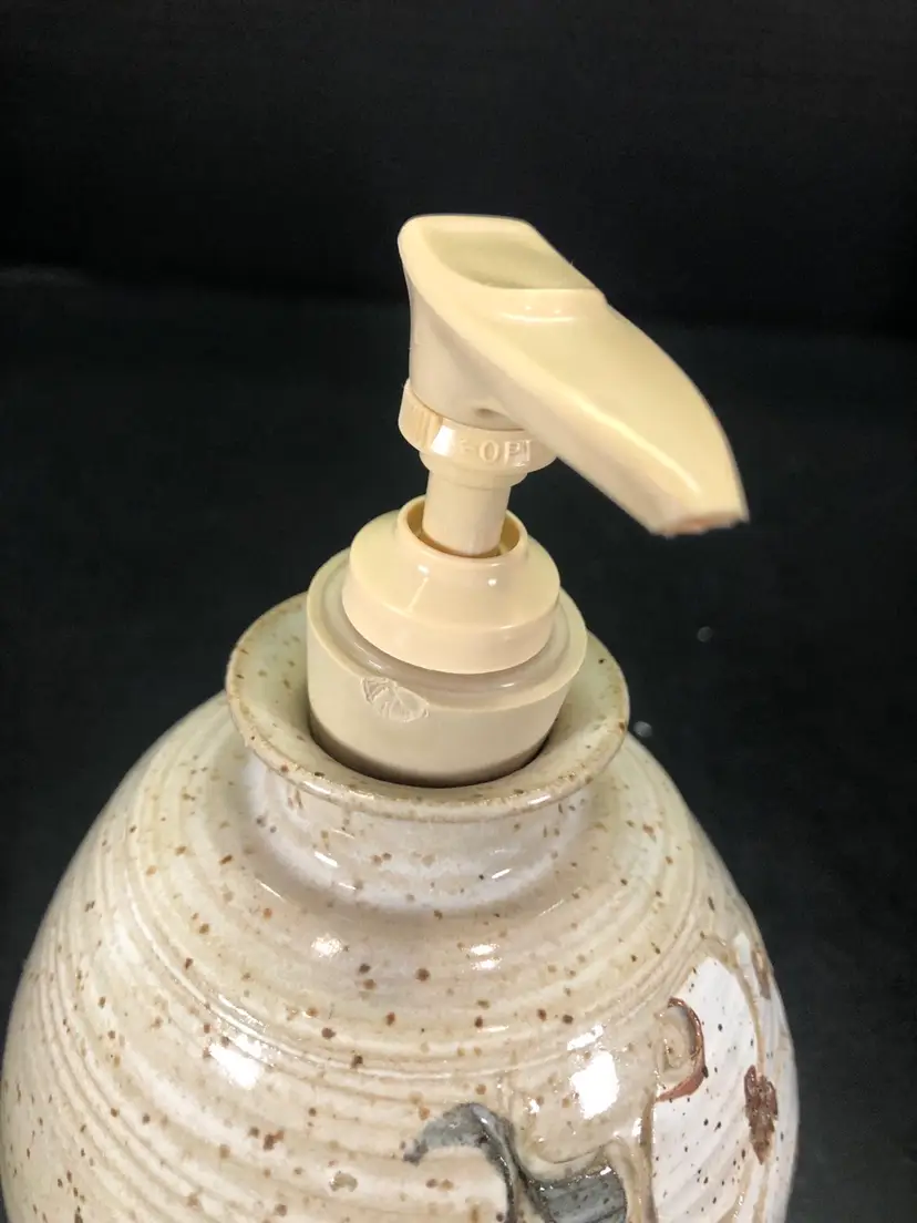 This is 6” tall and 4” across at widest part. It is signed but unsure of the mark. Possible IHT. The dispenser part has a chunk taken out. See photos.