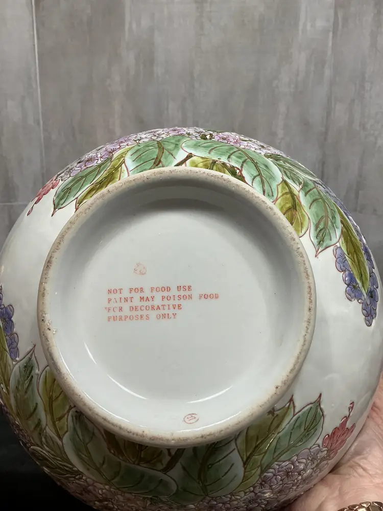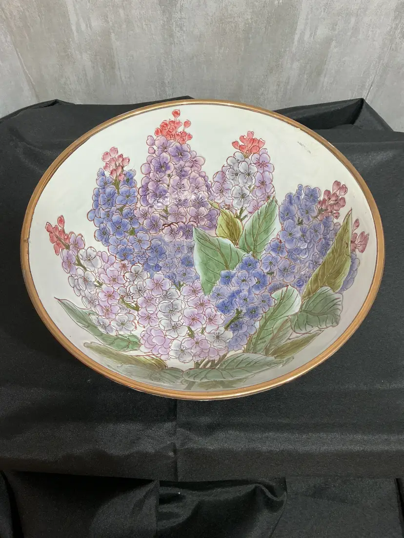 Hand painted Chinese Porcelain Floral Lilac Purple Pink with Gold Trim large Bowl 10โ€ diameter
