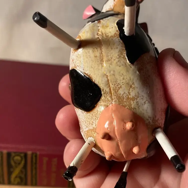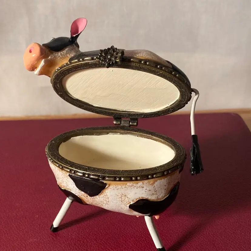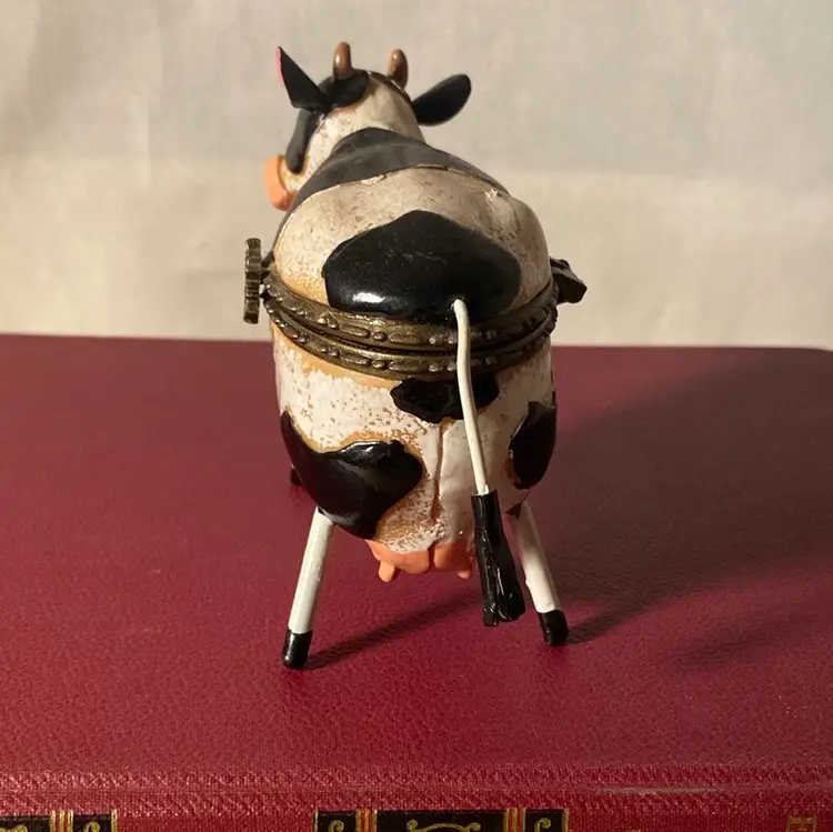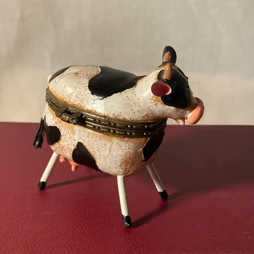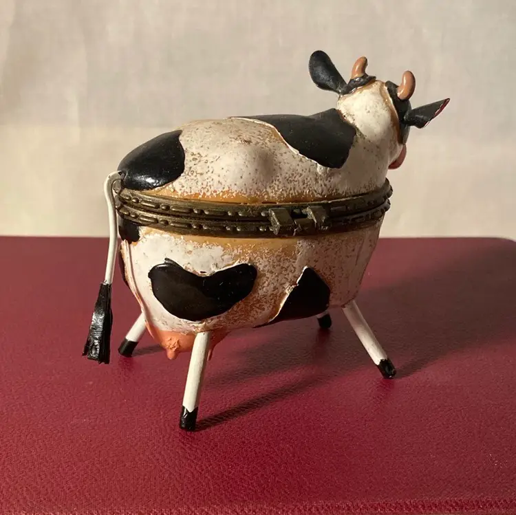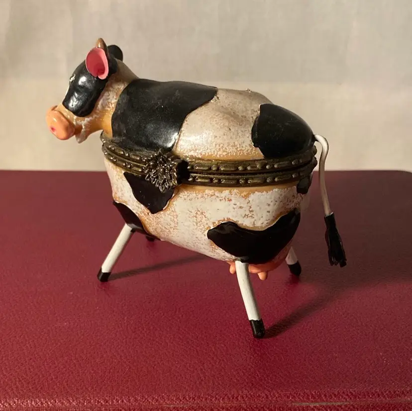 Black & white heifer trinket box hand painted with love, she measures 3 inches tall and 3 1// inches wide, there are no markings on her and no imperfections either.