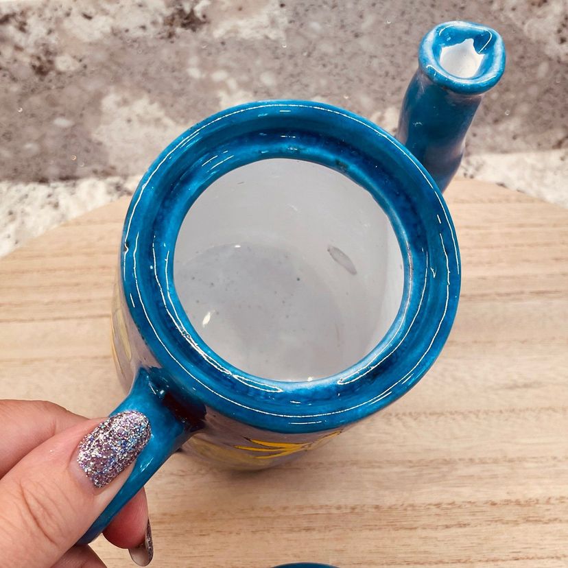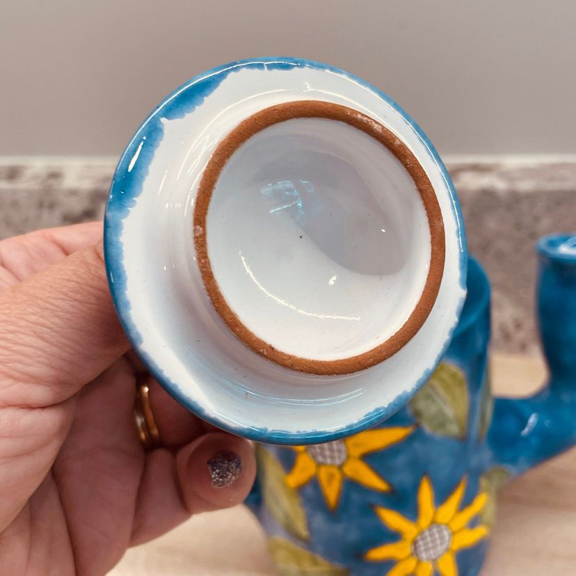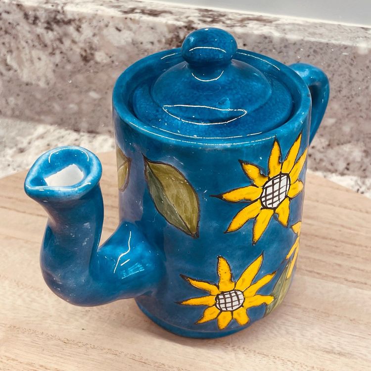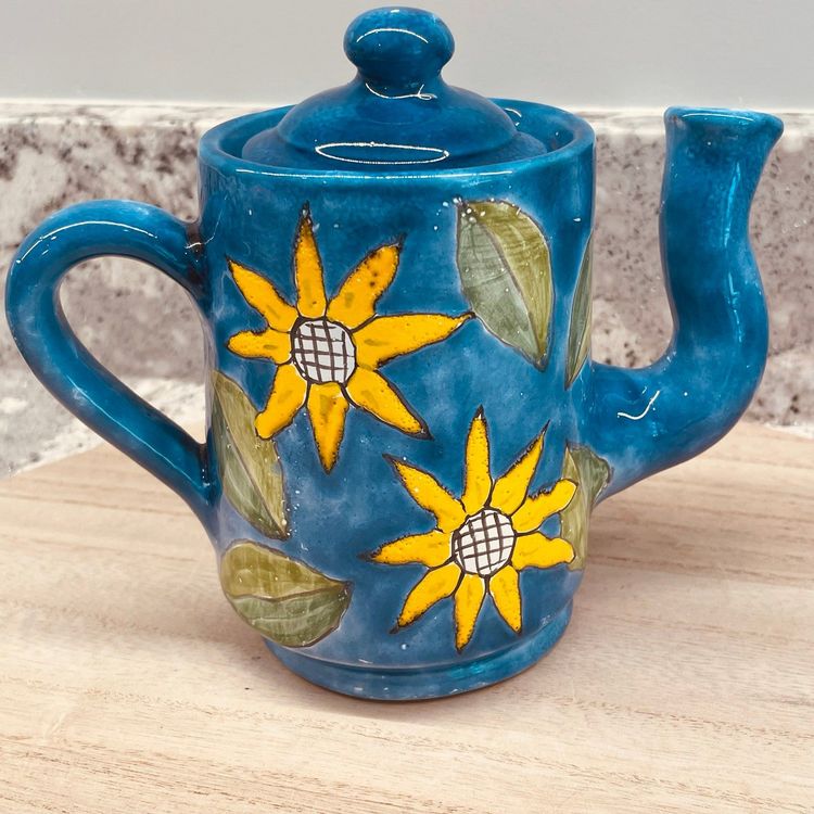 Beautiful and unique design on teapot along with the crooked spout. Nice preowned condition. Appears to be a redware pottery. See all images for full details.