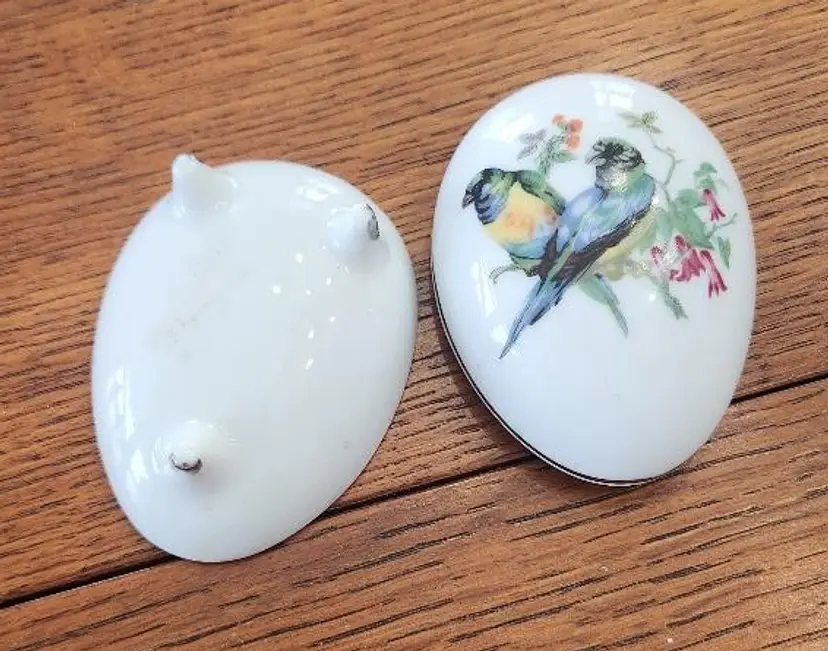 Hand painted Porcelain Egg shaped Trinket Box possibly Limoges, no markings, birds on branch motif 3 1/2"