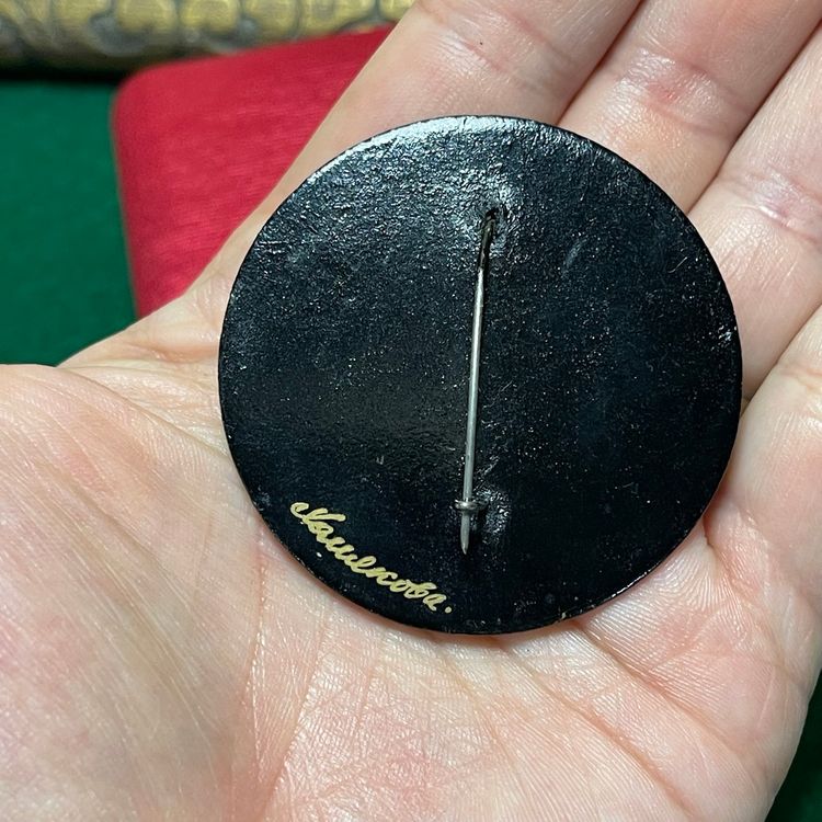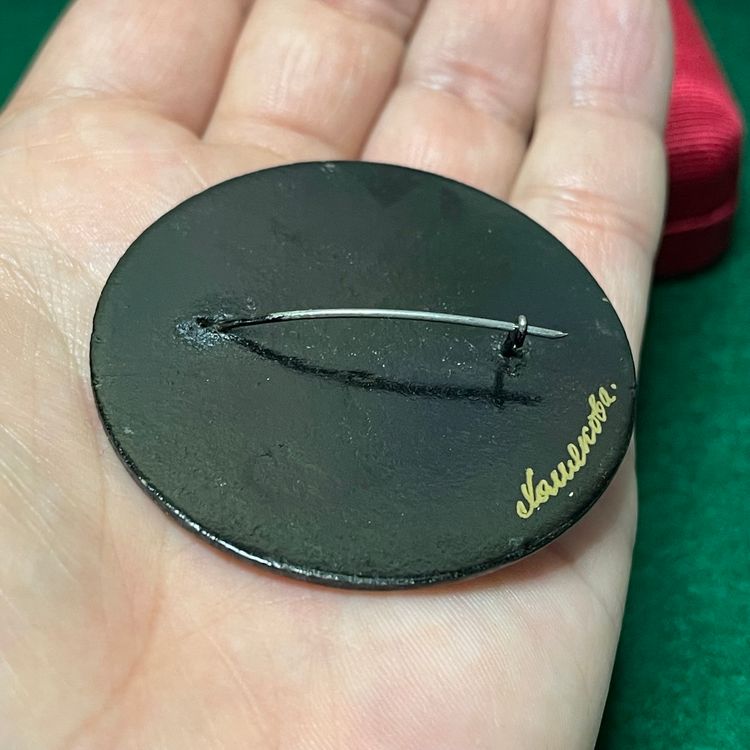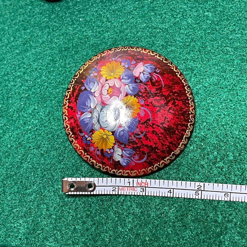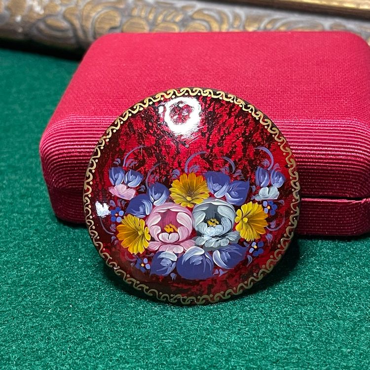This beautiful round brooch is hand painted with lovely pink, blue and yellow flowers with a deep mottled red background and gold toned border. This is approximately 1-7/8 inches across.