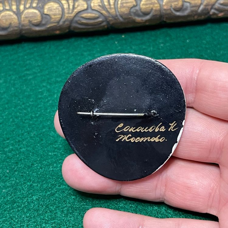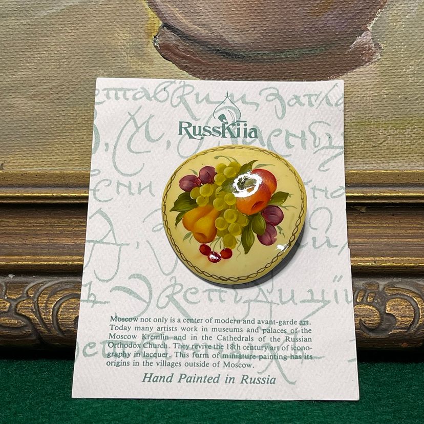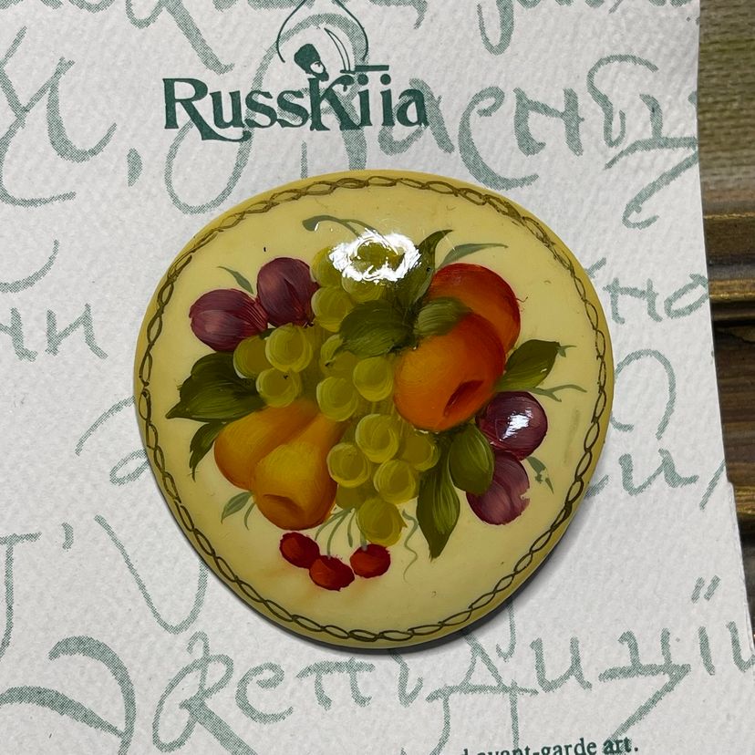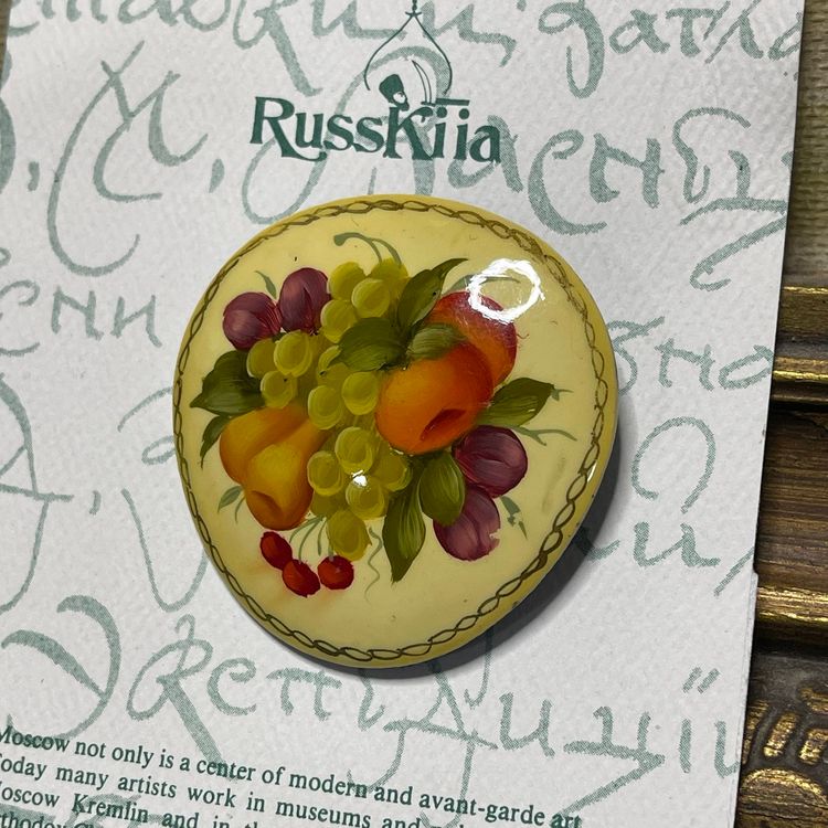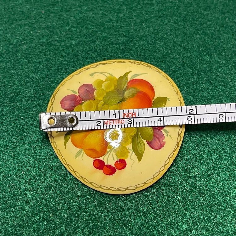 This lovely brooch is in great condition, still on its original card which is also in good condition. It is made of a lacquered wood and is about 1-7/8 inches across.