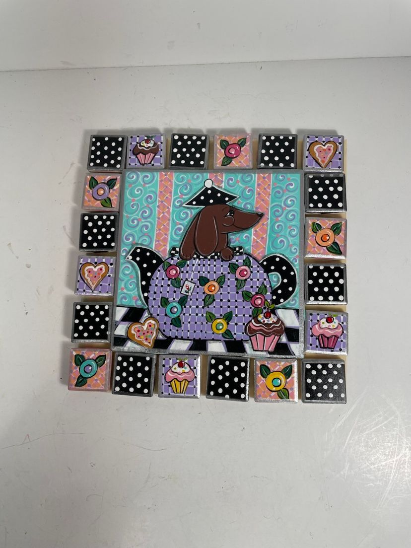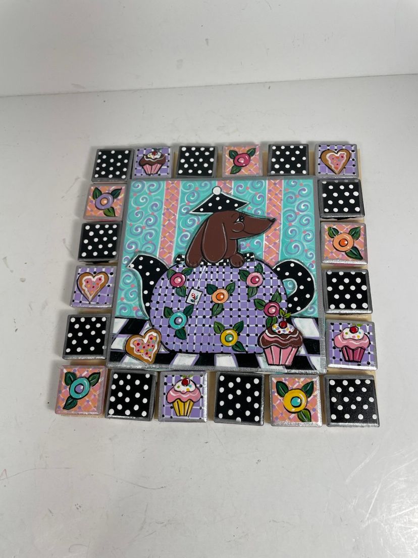 21 tiles. Mounted on sticky backed cardboard. Large tile 4” x 4.25”, small tiles .75” x .75”.