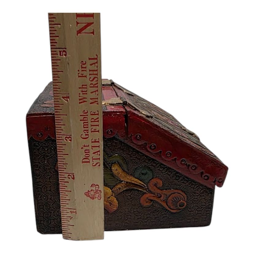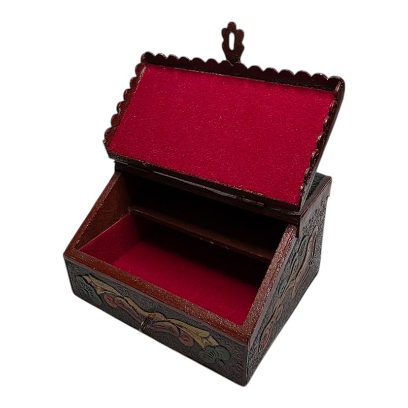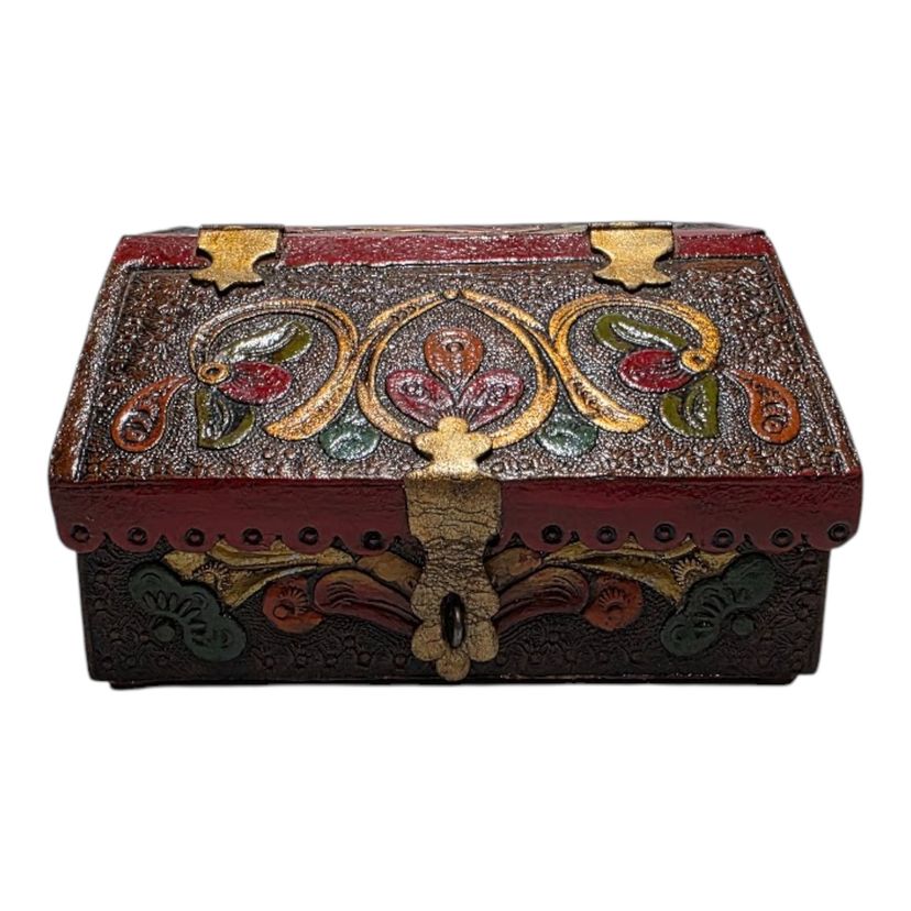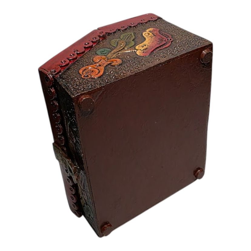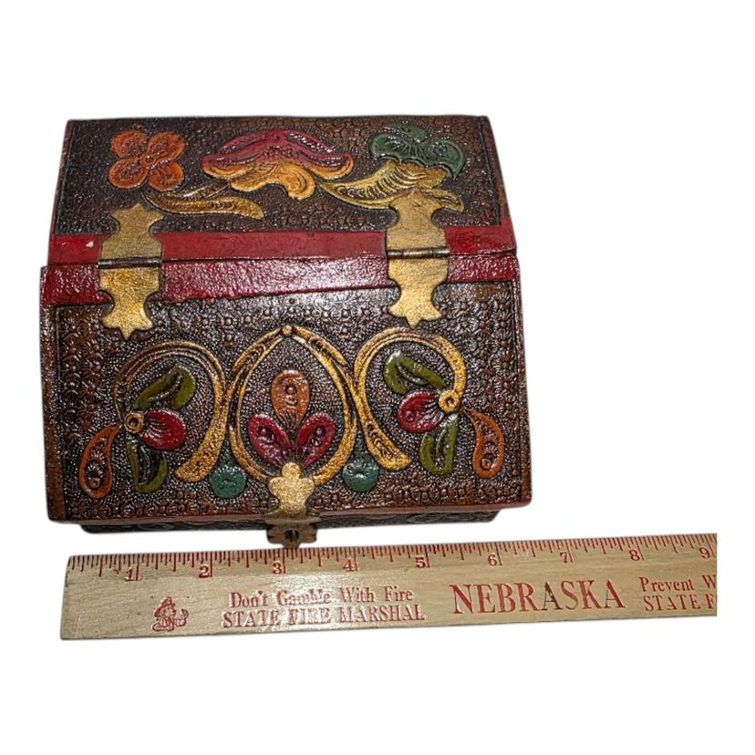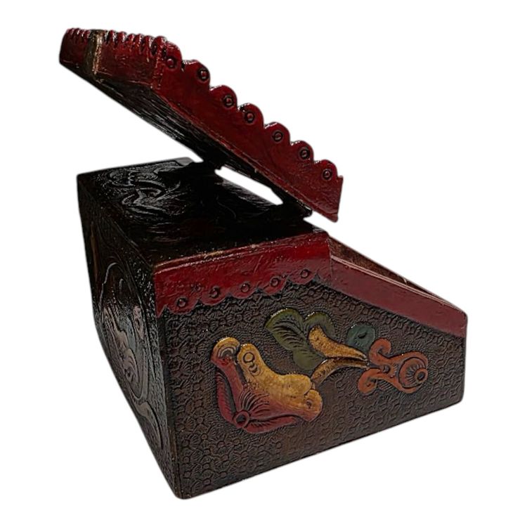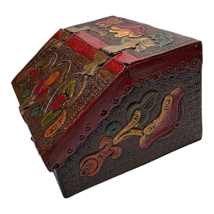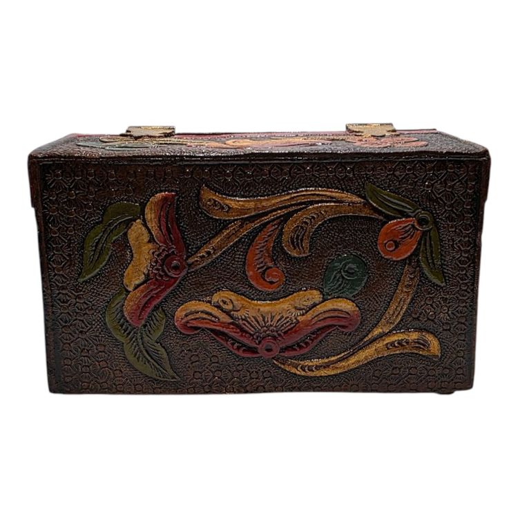 This antique leather-wrapped wooden box showcases exquisite hand-tooled floral patterns. The red fabric lining enhances its vintage aesthetic and functional appeal.