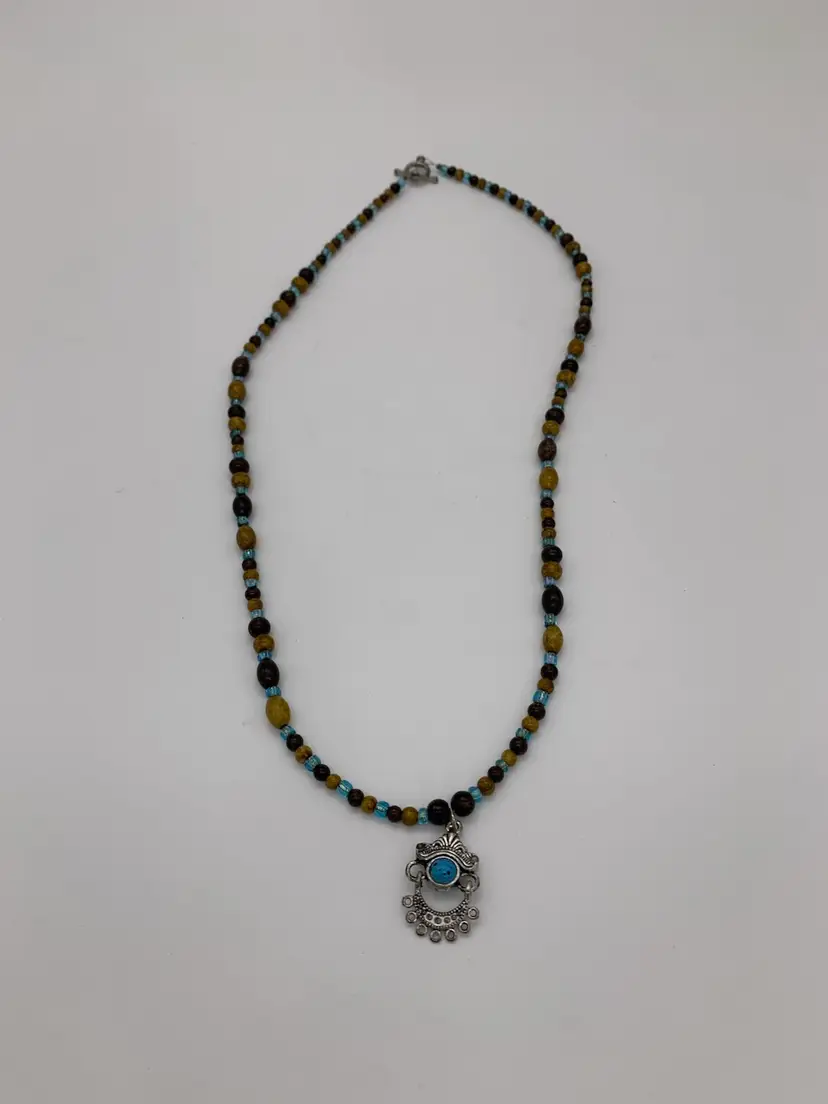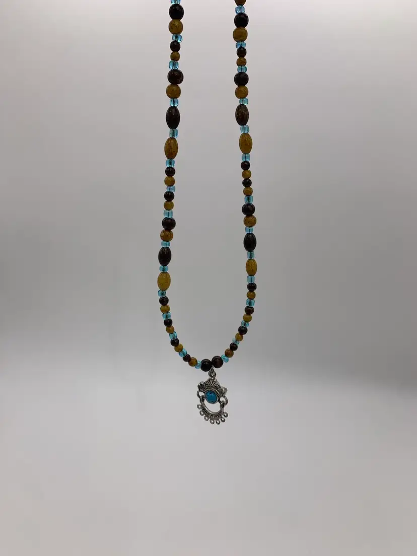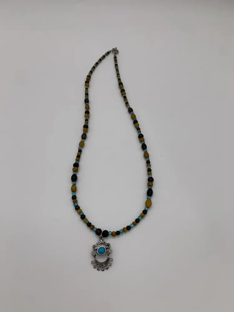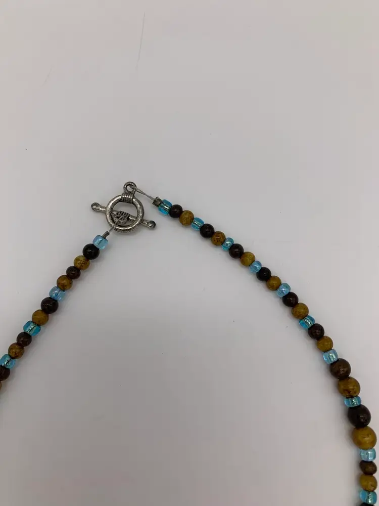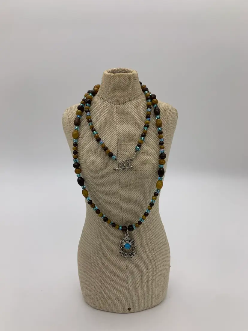 This handcrafted Bohemian Navajo necklace features a 24" length with brown and tan turquoise colored beads and double sided silver tone pendant, showcasing a natural woodstone main stone in a round barrel shape. The multicolor piece is made of gemstones, metal, and acrylic materials with a flush setting style and toggle closure. The vintage necklace exudes beauty, nature, art, and bohemian flair, making it a unique and stylish choice for women looking for handmade jewelry with a contemporary touch.