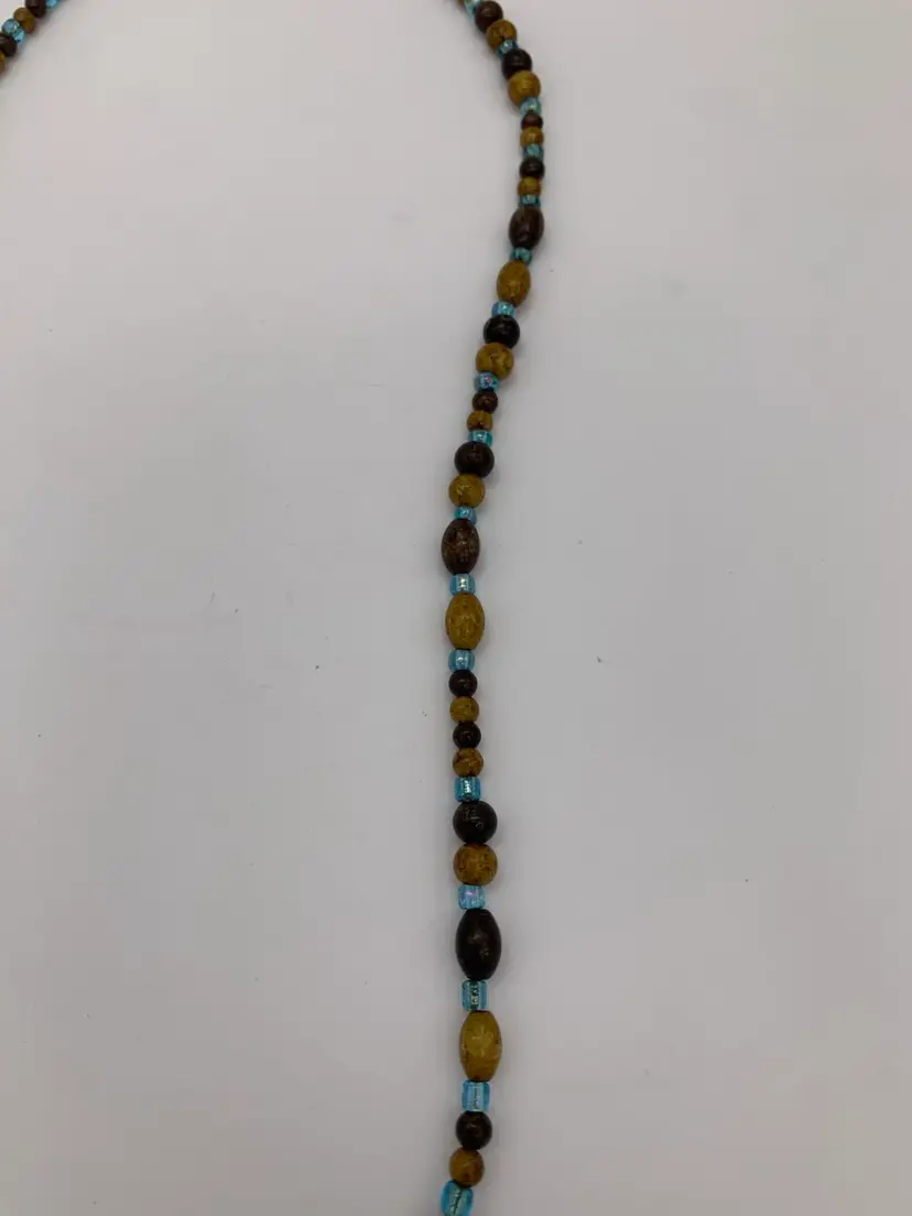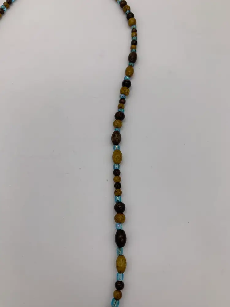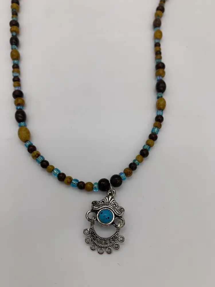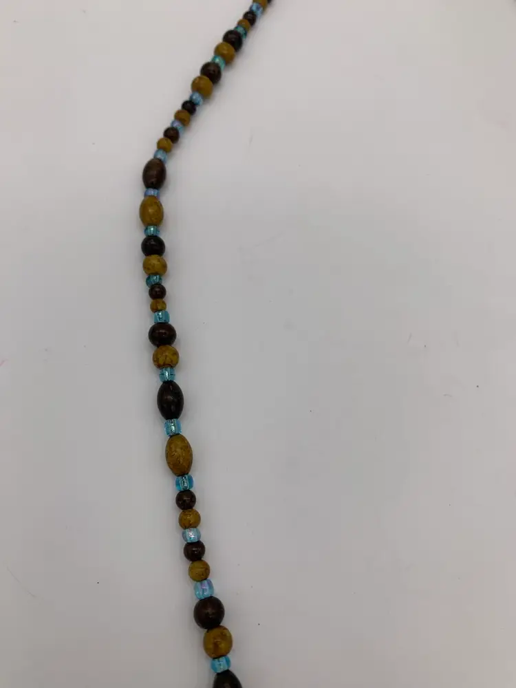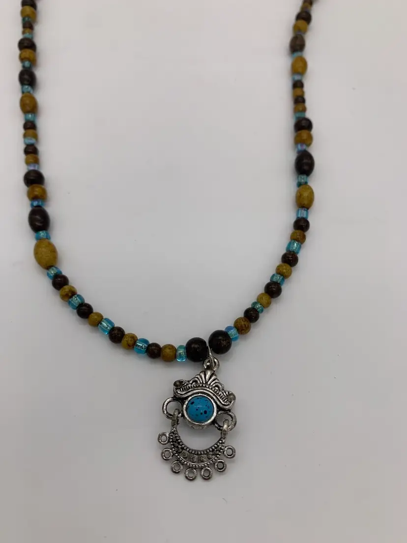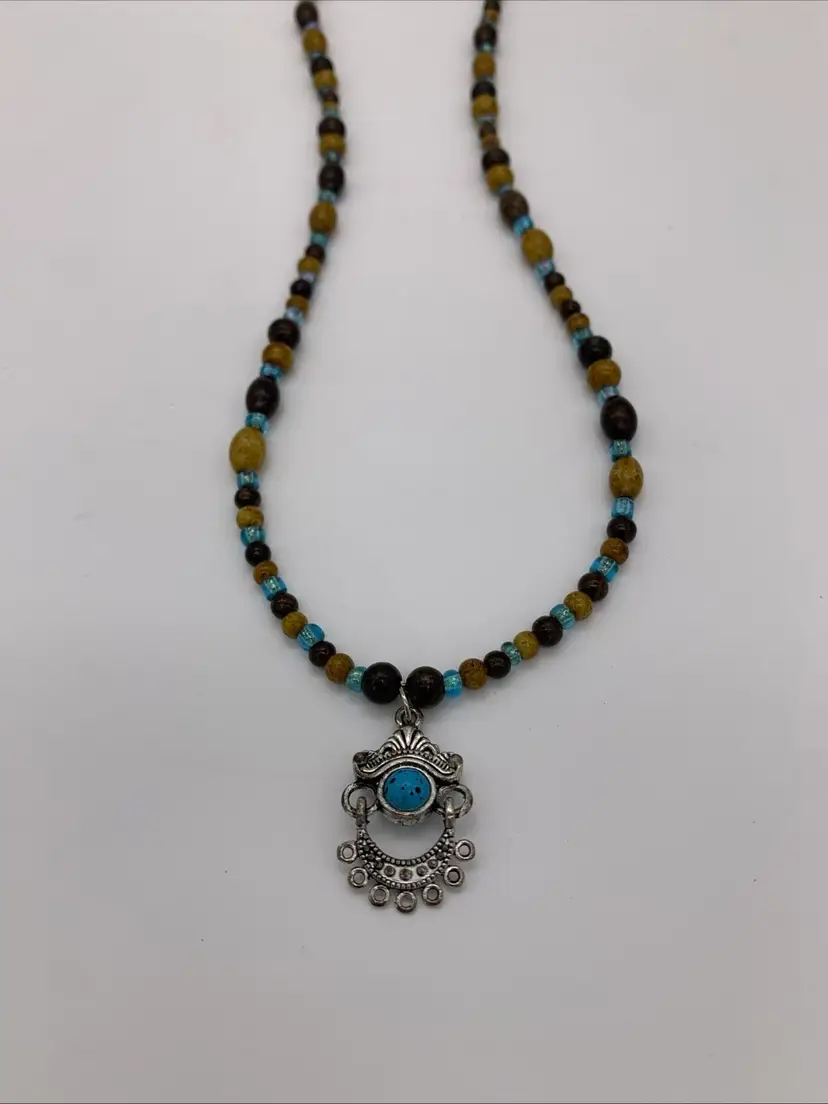 This handcrafted Bohemian Navajo necklace features a 24" length with brown and tan turquoise colored beads and double sided silver tone pendant, showcasing a natural woodstone main stone in a round barrel shape. The multicolor piece is made of gemstones, metal, and acrylic materials with a flush setting style and toggle closure. The vintage necklace exudes beauty, nature, art, and bohemian flair, making it a unique and stylish choice for women looking for handmade jewelry with a contemporary touch.