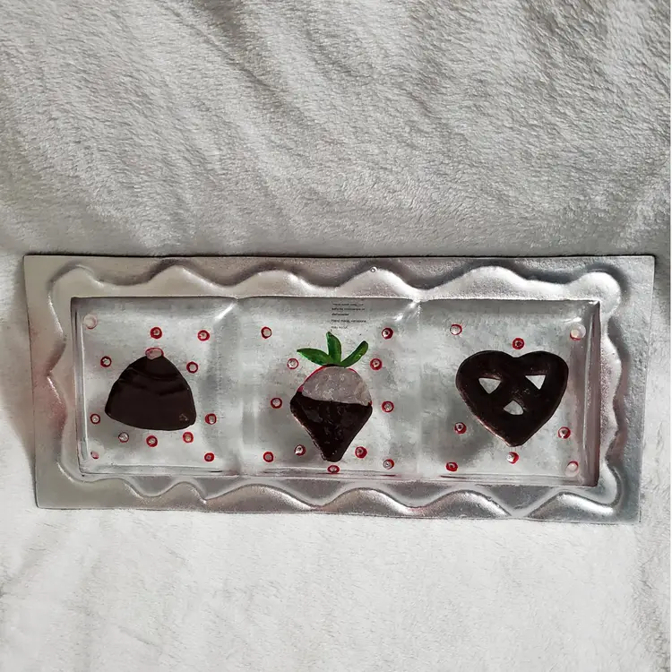 Sweeten up your decor with this handcrafted divided glass dish featuring delightful chocolate-themed designs. Perfect for Valentine's Day or any day. In excellent pre-owned condition with vibrant colors and no visible flaws.