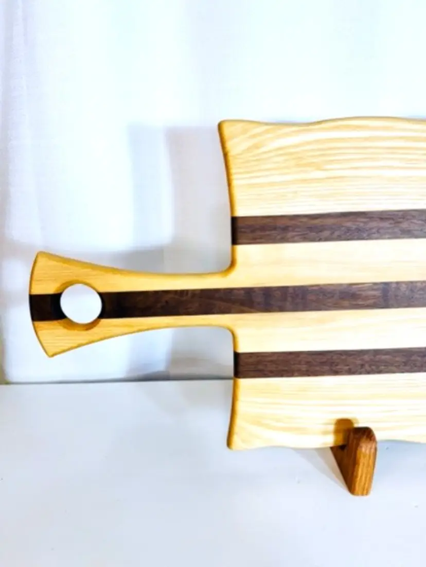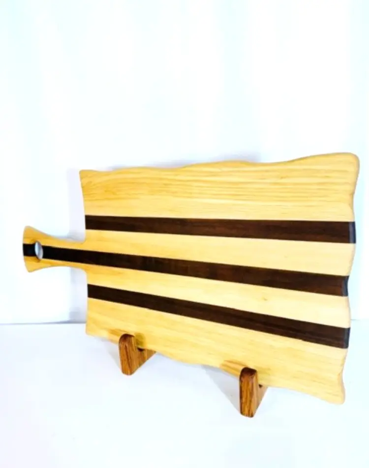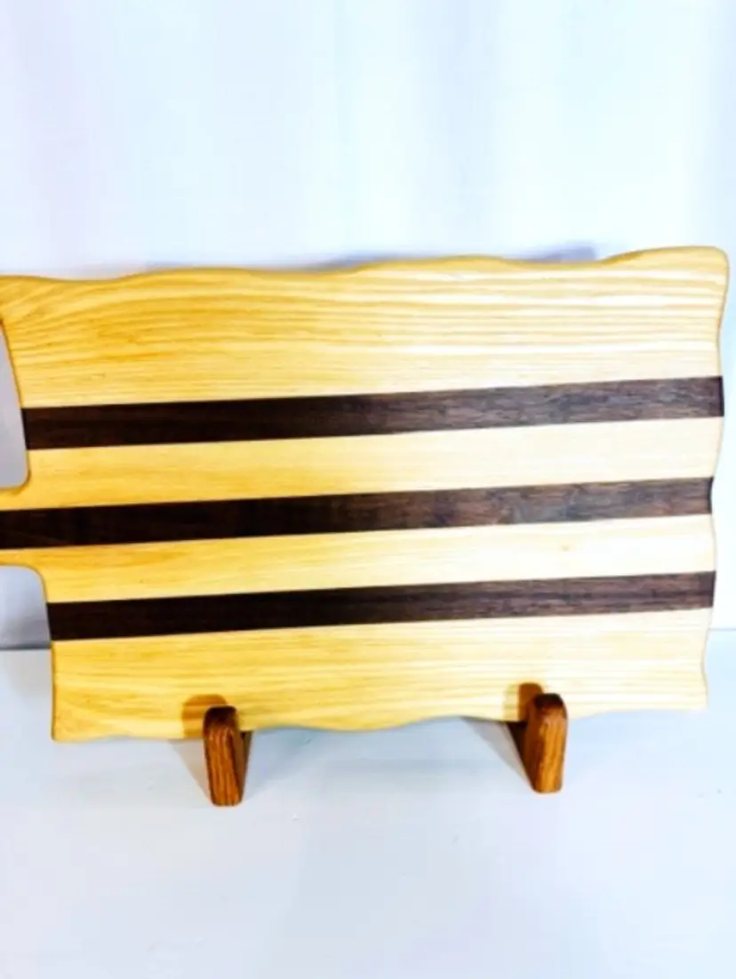 Expertly handcrafted cutting board! All boards are sanded to a 600-grit fine finish and come with a 2oz tin of board butter, which keeps your board beautiful all year long. Finished with a homemade blend of food safe mineral oil and beeswax. Form & function are carefully considered into each design to create an heirloom quality. Easy maintenance: Hand wash with warm soapy water and dry promptly. Do Not place in dishwasher. Excellent Brand-New Condition! Measures approximately: Long - 25 1/4" Wide - 12 1/2" Thick - 3/4"