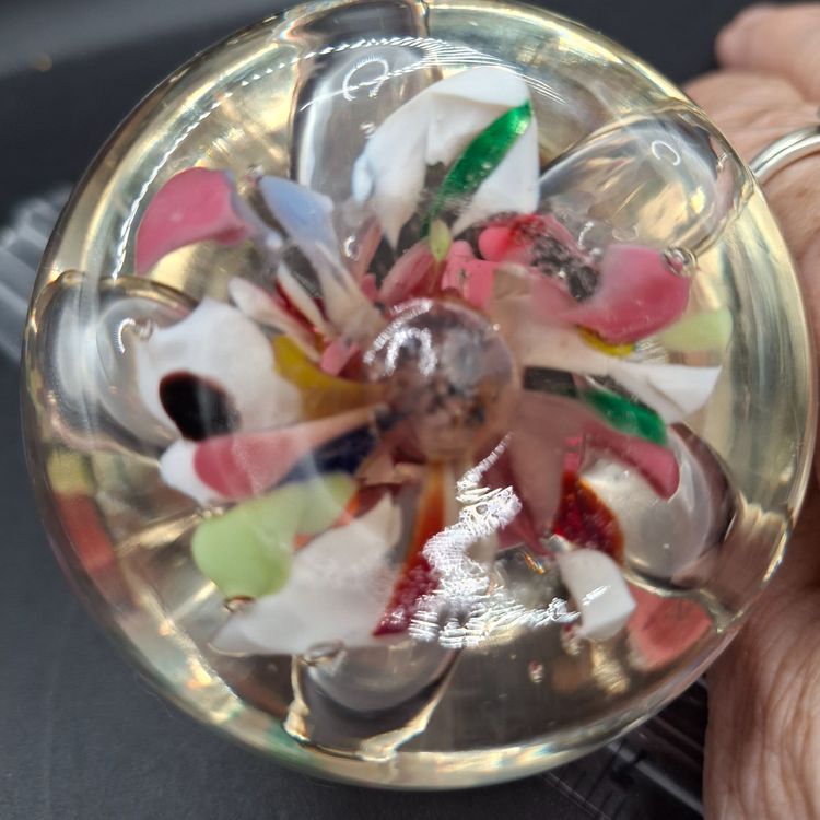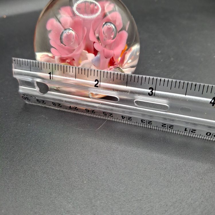 • Diameter: Approximately 2.5 inches • Intricate floral design • Clear glass encasement • Handcrafted with precision • Decorative and functional