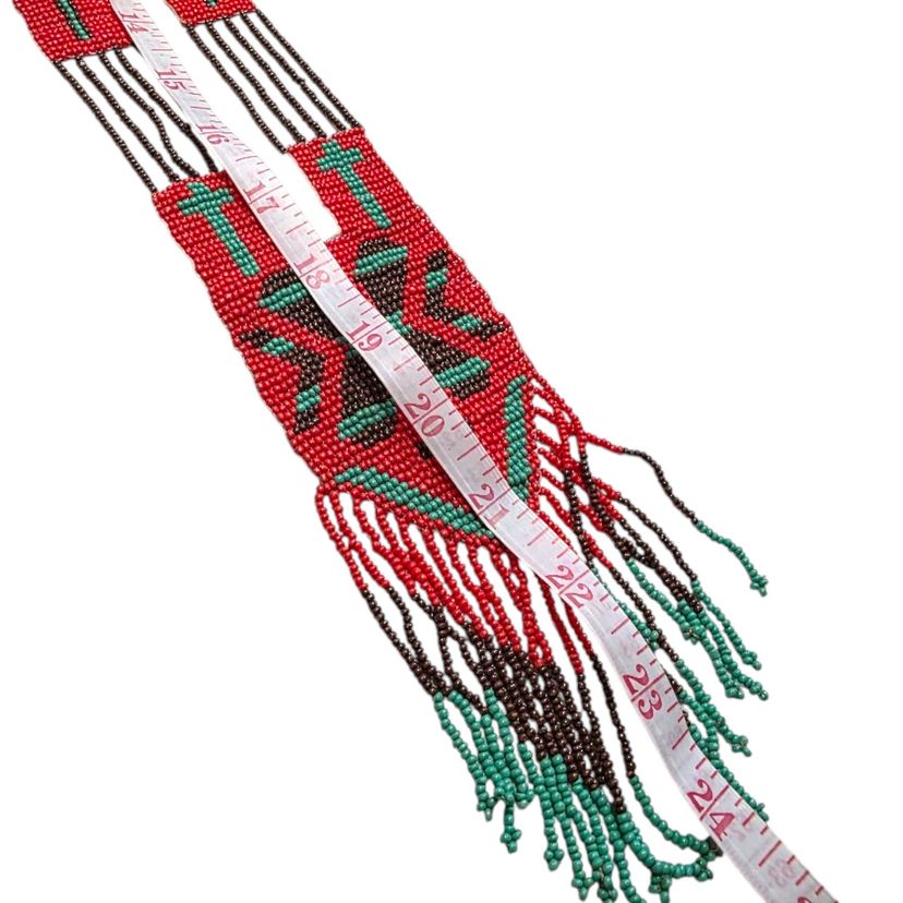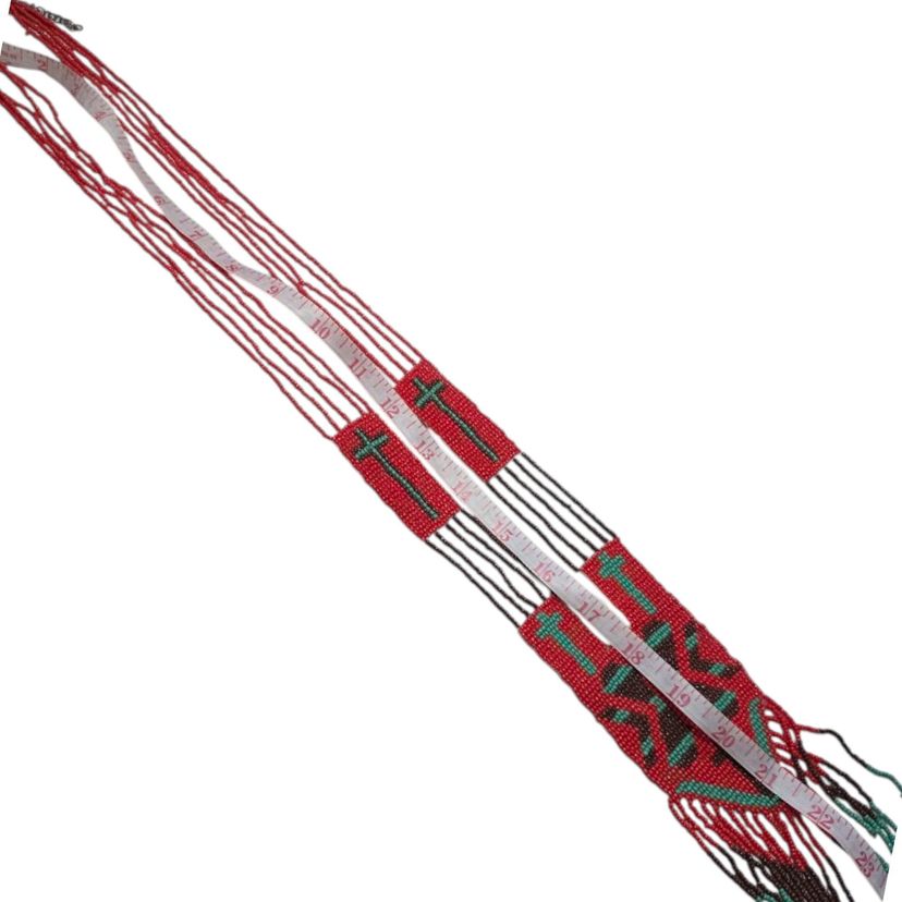 This vintage handcrafted beaded necklace features intricate red and green beadwork with a cross motif. The fringed ends and 24-inch length evoke a timeless charm, making it a delightful piece for collectors or admirers of traditional craftsmanship.
