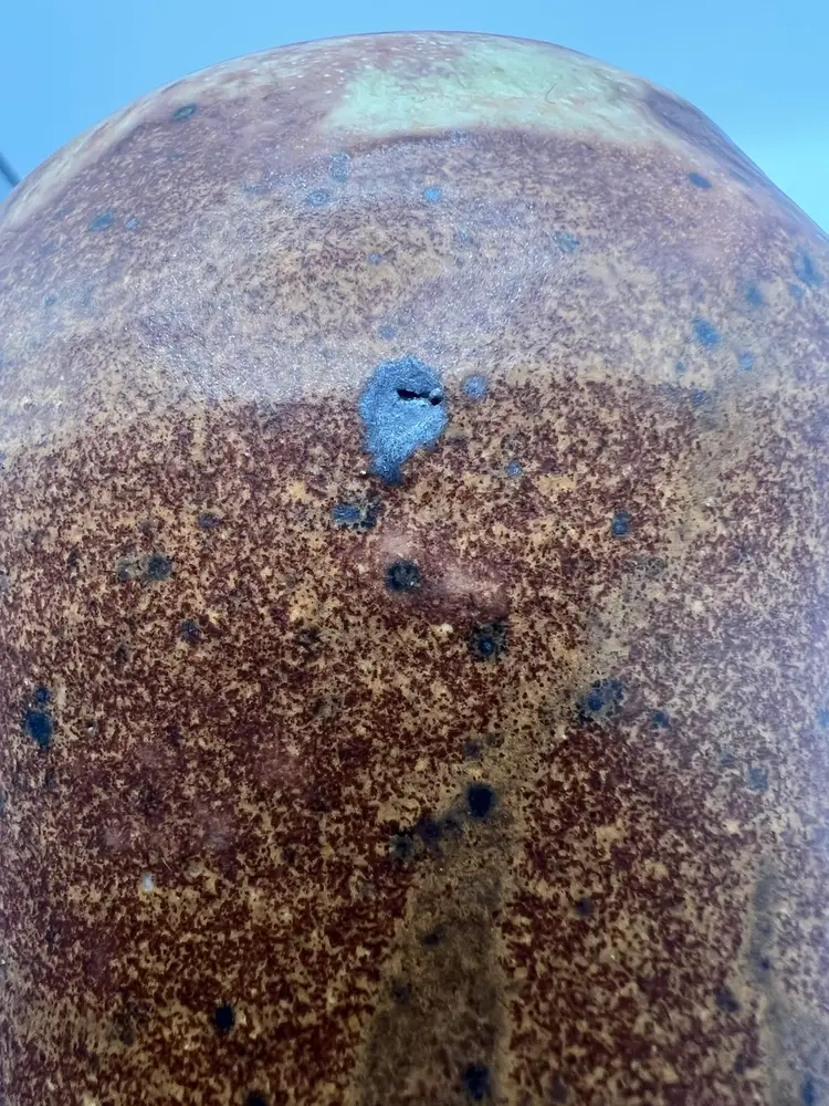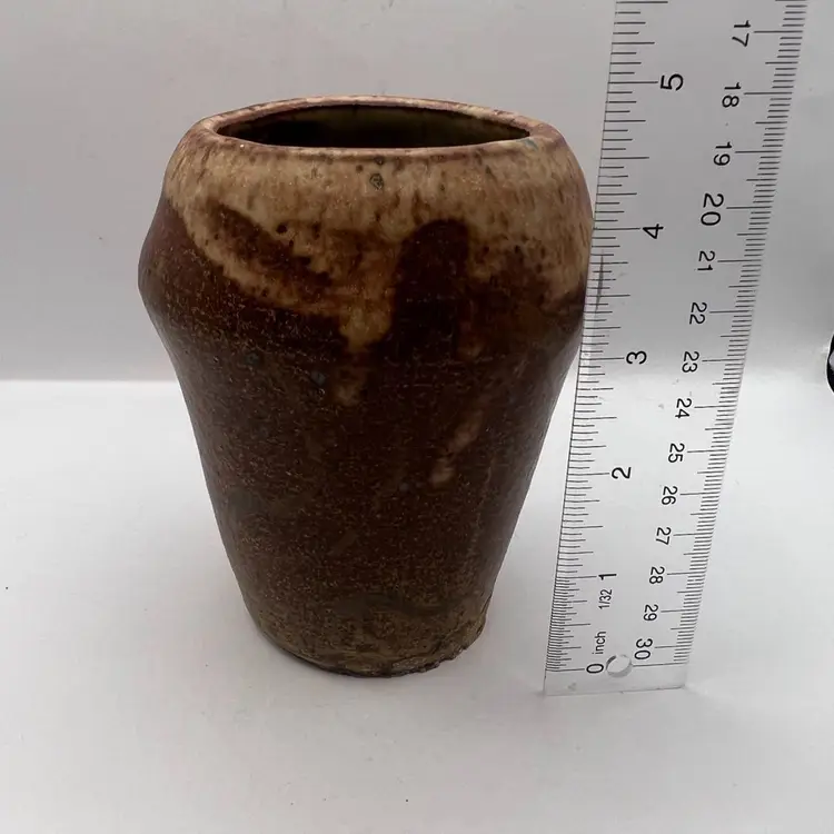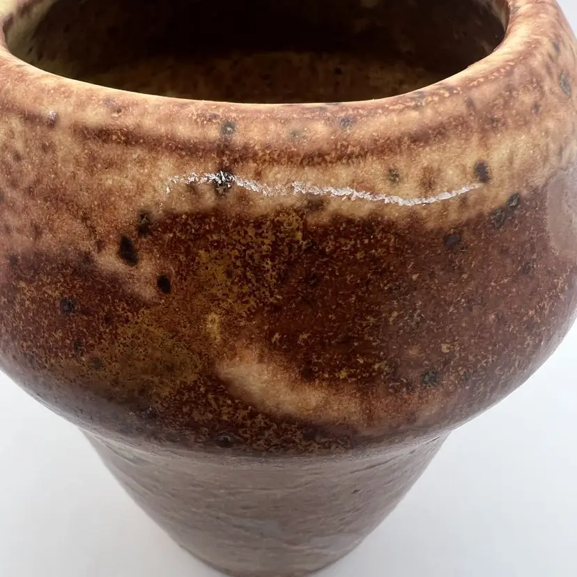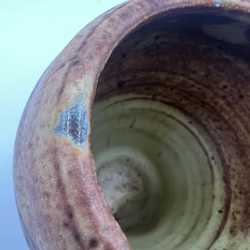 Has a few marks and small spots where the glaze didn’t cover. Not perfectly symmetrical in shape. Signed “W” or “M” on the bottom.