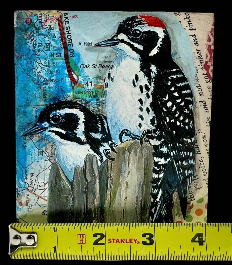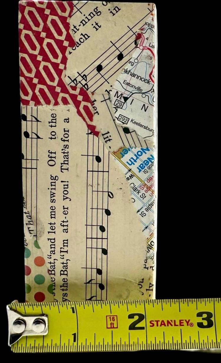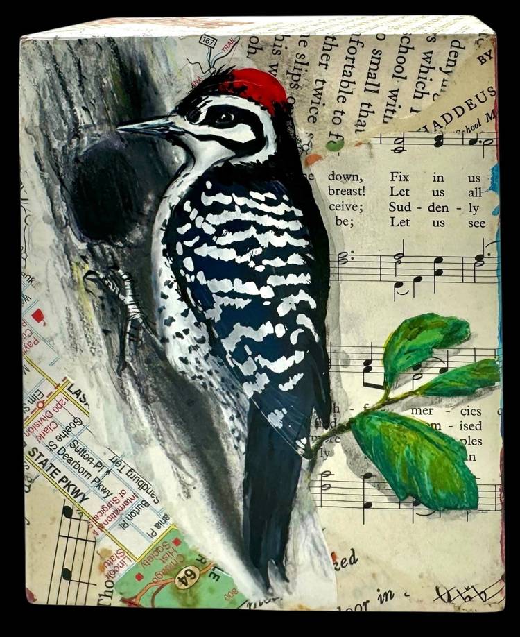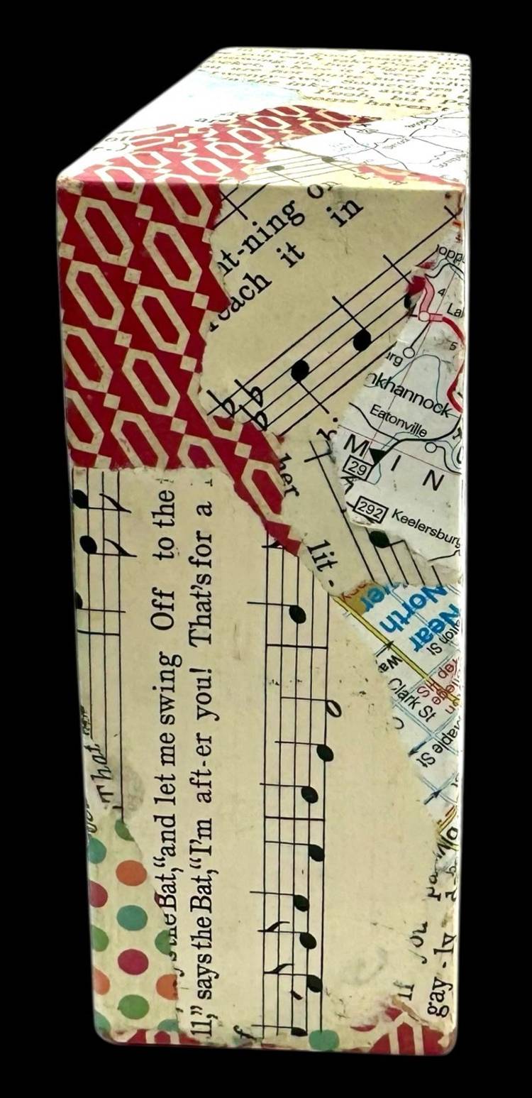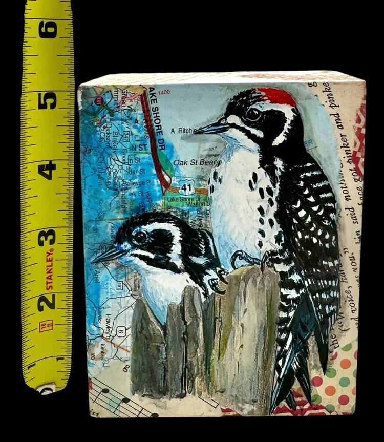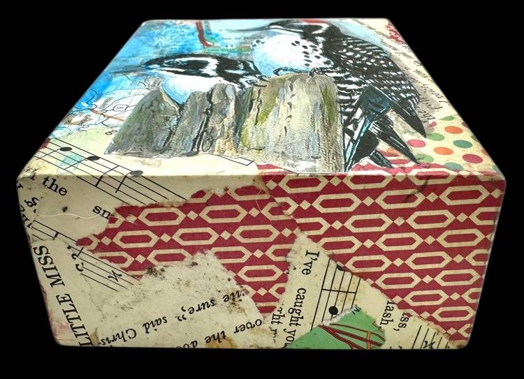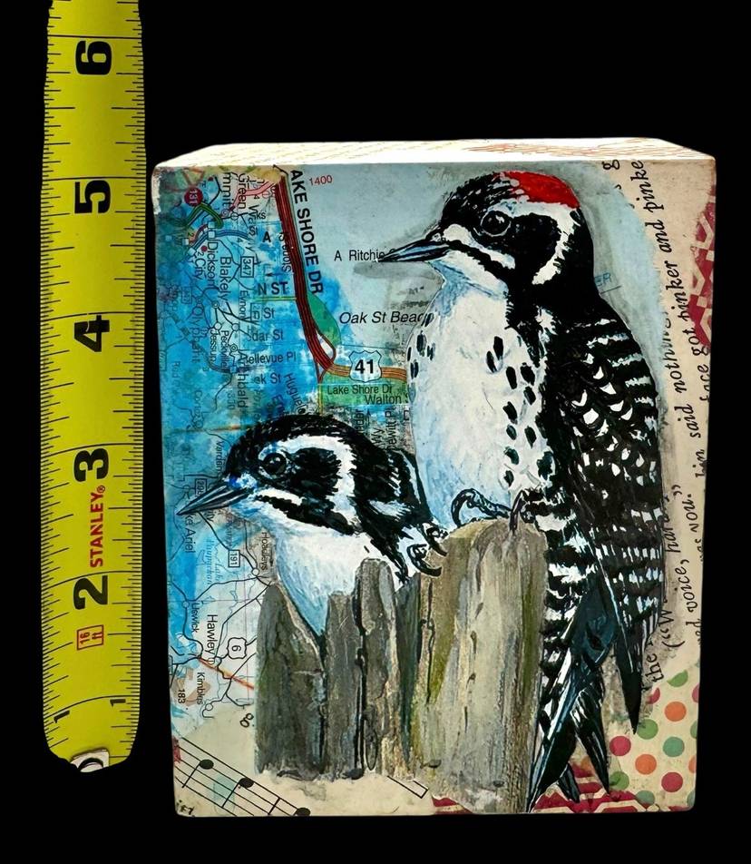 Unique collage piece made from a rectangular wood block.