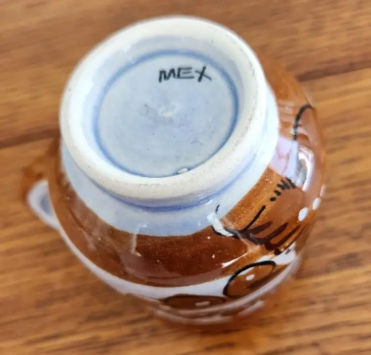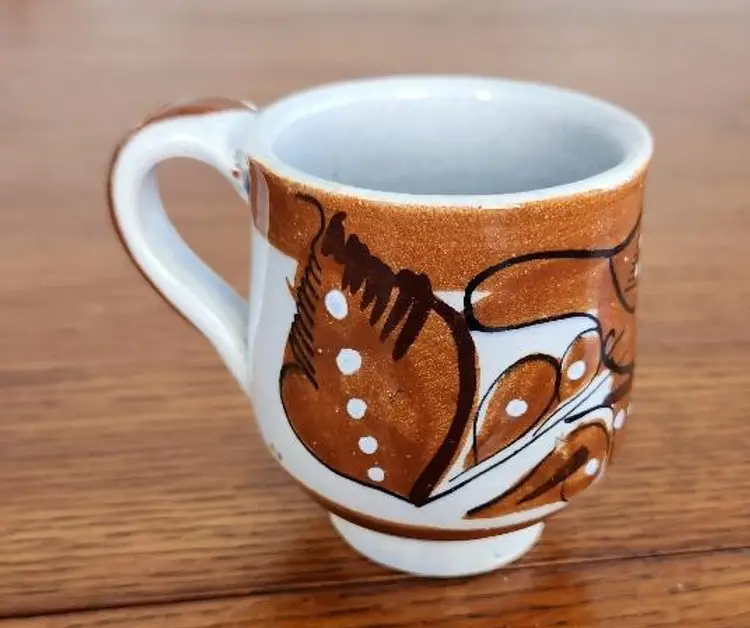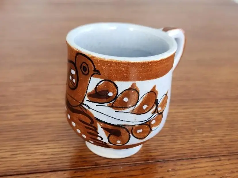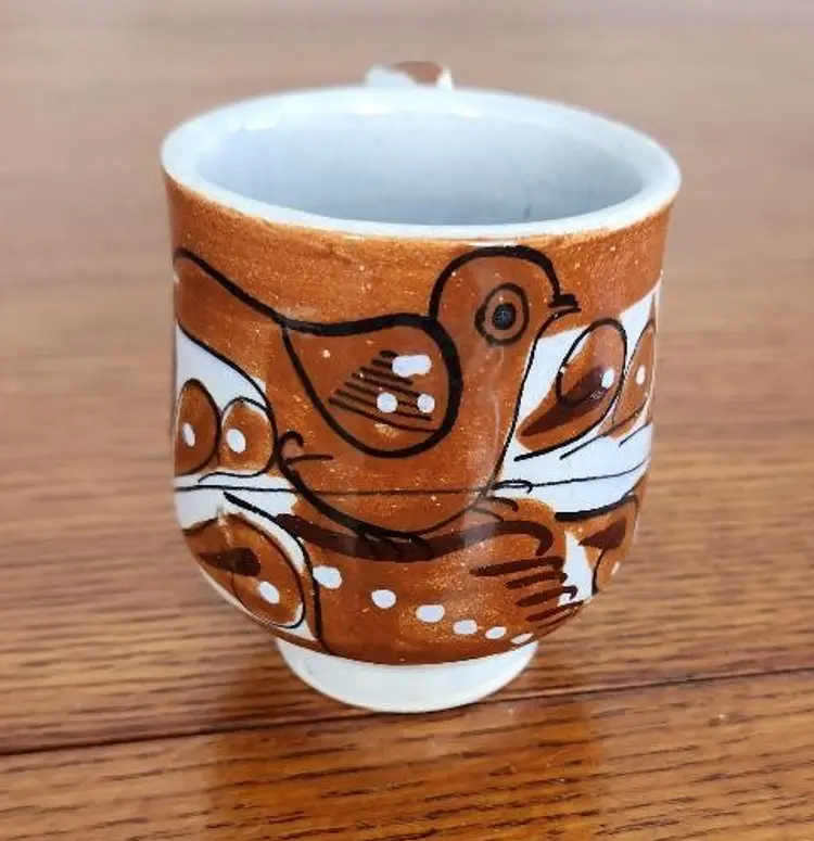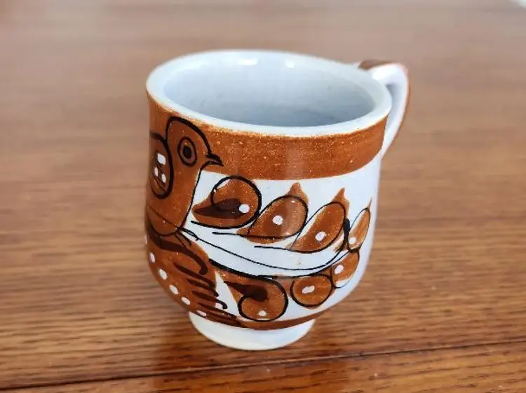 Handmade and painted Tonala Mexican Pottery Cup with Bird & Floral design Mexican folk art brown and white 3" tall, very pretty piece