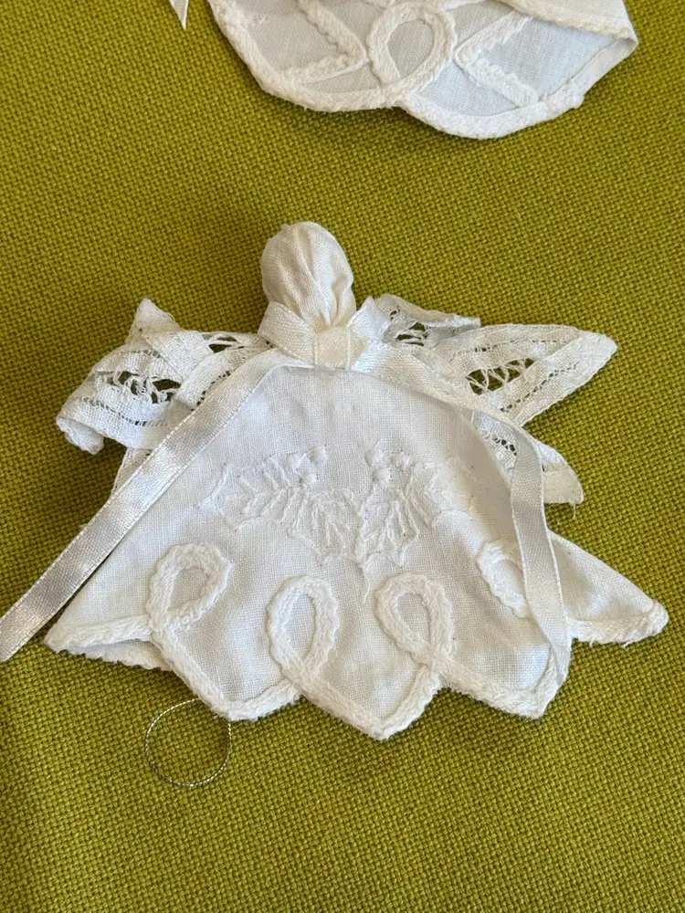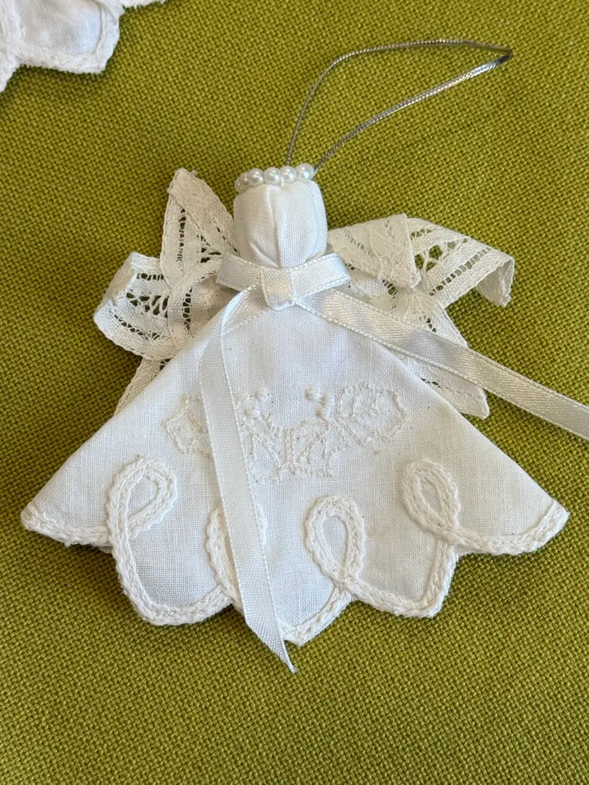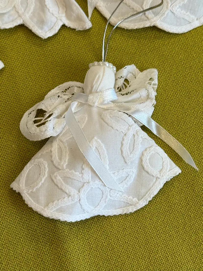 This product is a set of 12 handmade Battenburg lace pearl halo white linen doily angels, perfect for Christmas ornaments. Each ornament features a delicate lace and linen design in a classic angel shape. The vintage-inspired set includes 12 ornaments, each measuring 3.5 inches in height, making them a lovely addition to any holiday decor collection. The feminine and elegant design of these ornaments captures the essence of timeless Christmas traditions with a modern twist.