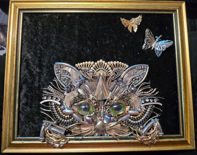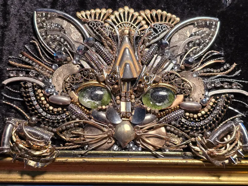 I made this shimmering cat from bits of vintage costume jewelry, rhinestones, beads, and little treasures I’ve collected over time. Each piece was placed by hand, building the whiskers, ears, and those bright green eyes that seem to follow the light.