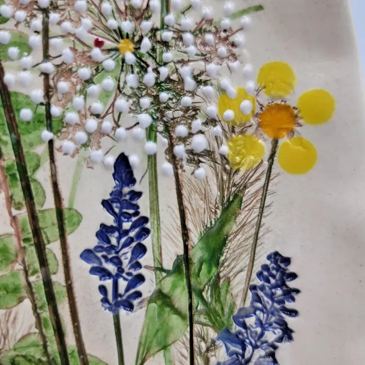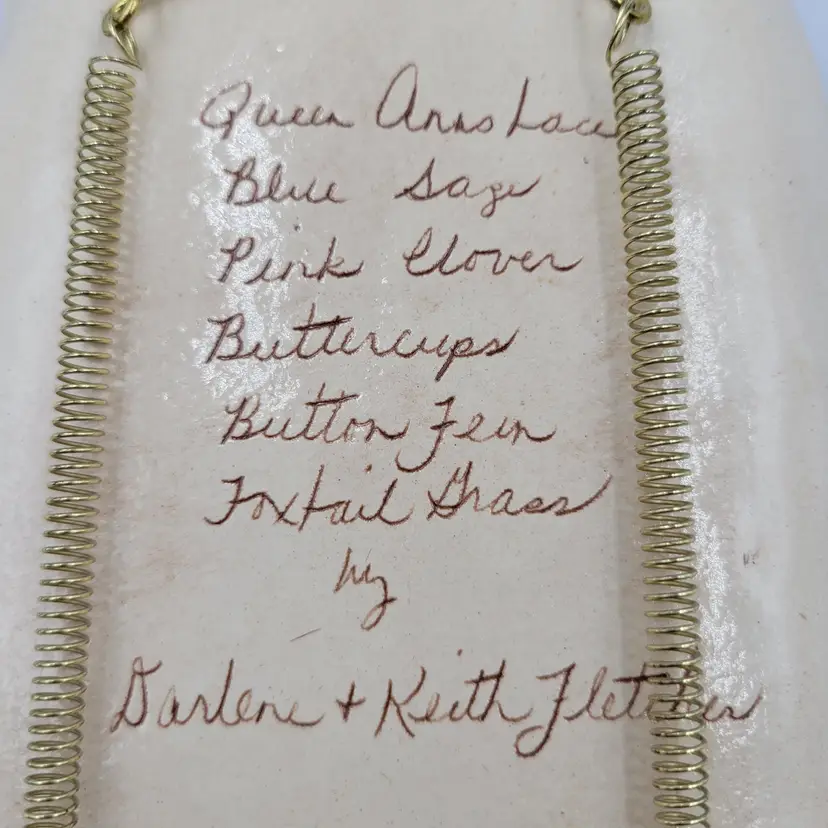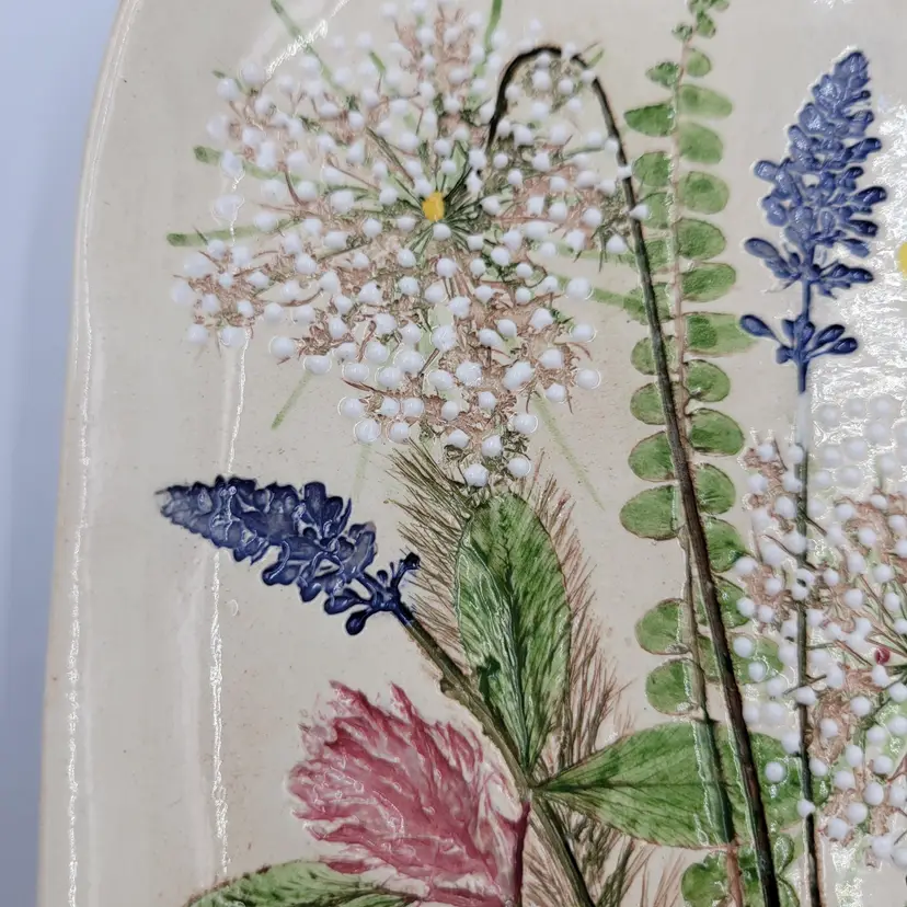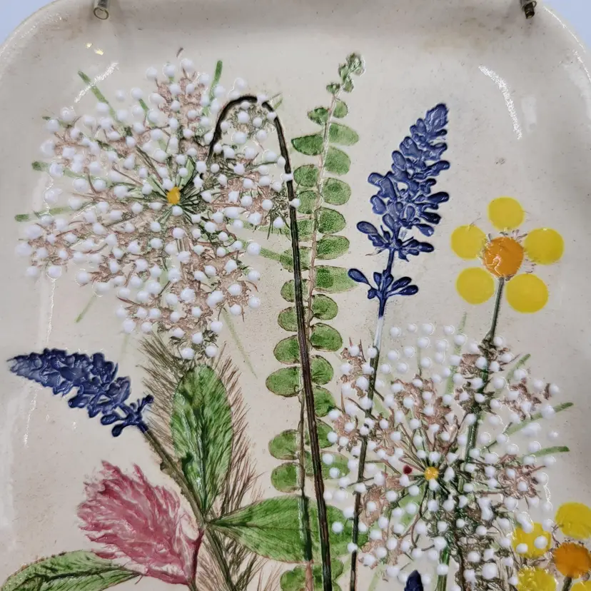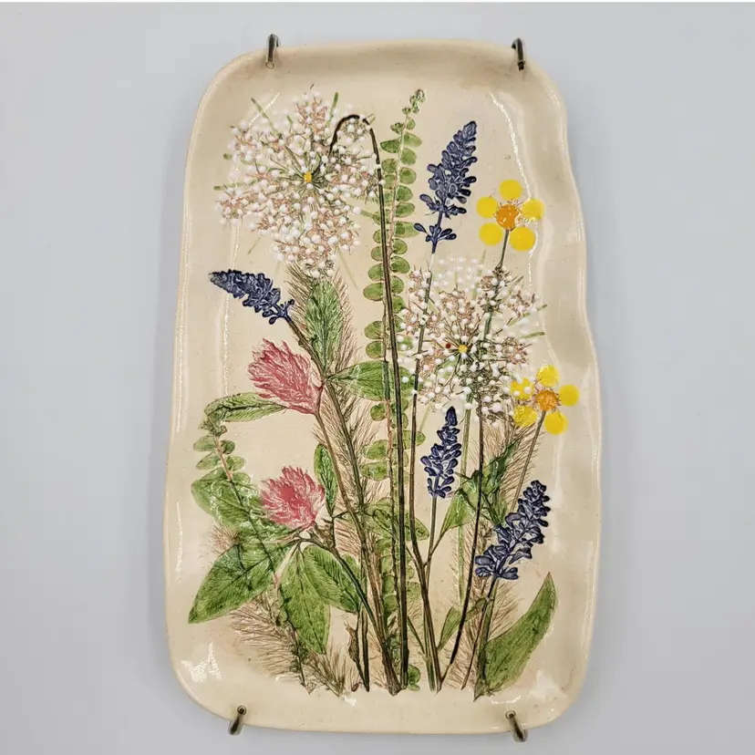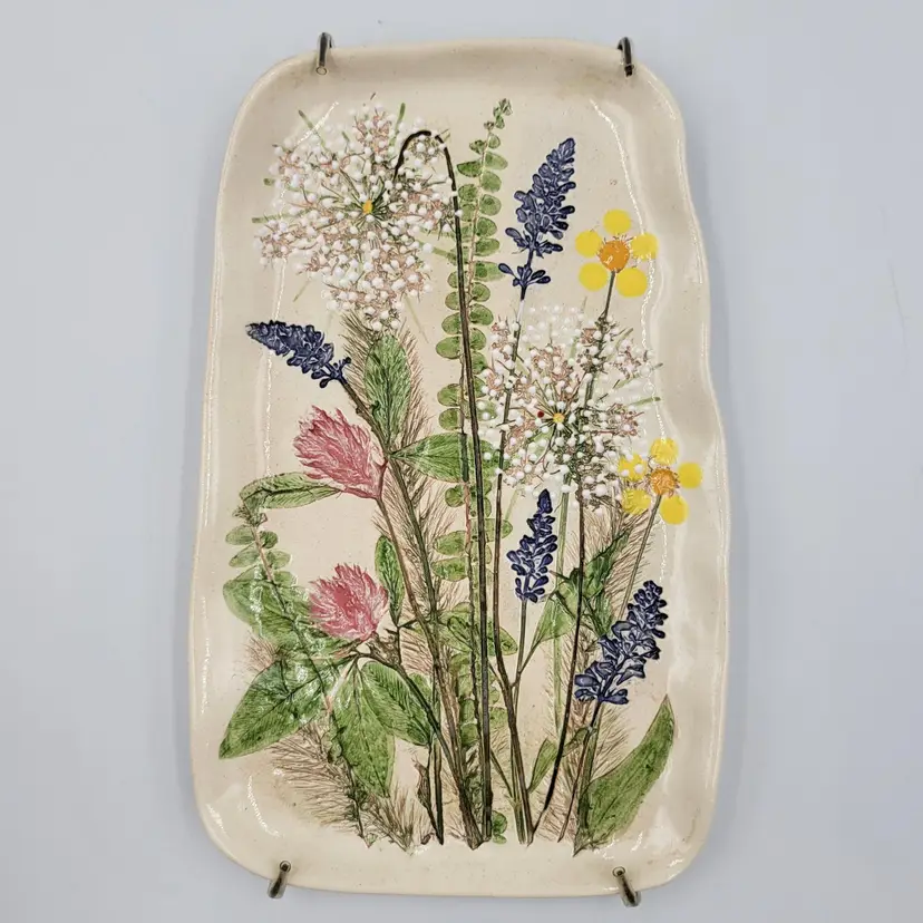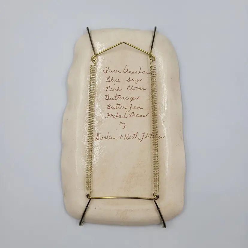 This lovely wall plaque is handmade using real flowers. Darlene and Keith Fletcher from Marion NC hand press these flowers into clay then paint and glaze each piece. This piece has Queen Ann's Lace, Blue Sage, Pink Clover, Buttercup, Button Fern and Foxtail Grass pressed onto it. This piece measures about 8 inches tall and is about 5 inches at it's widest part. It is signed on the back and comes with a card describing the piece. It comes with a metal plate hanger to hang it on the wall (see photos).