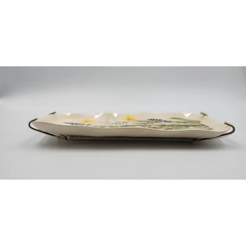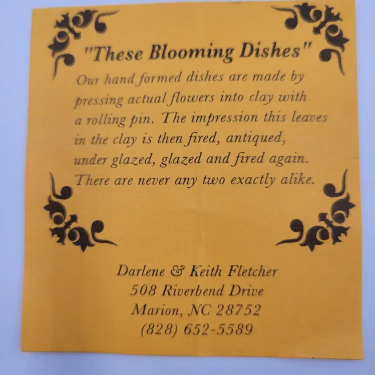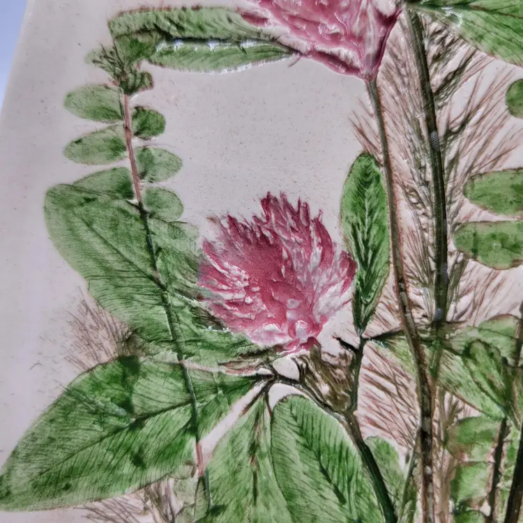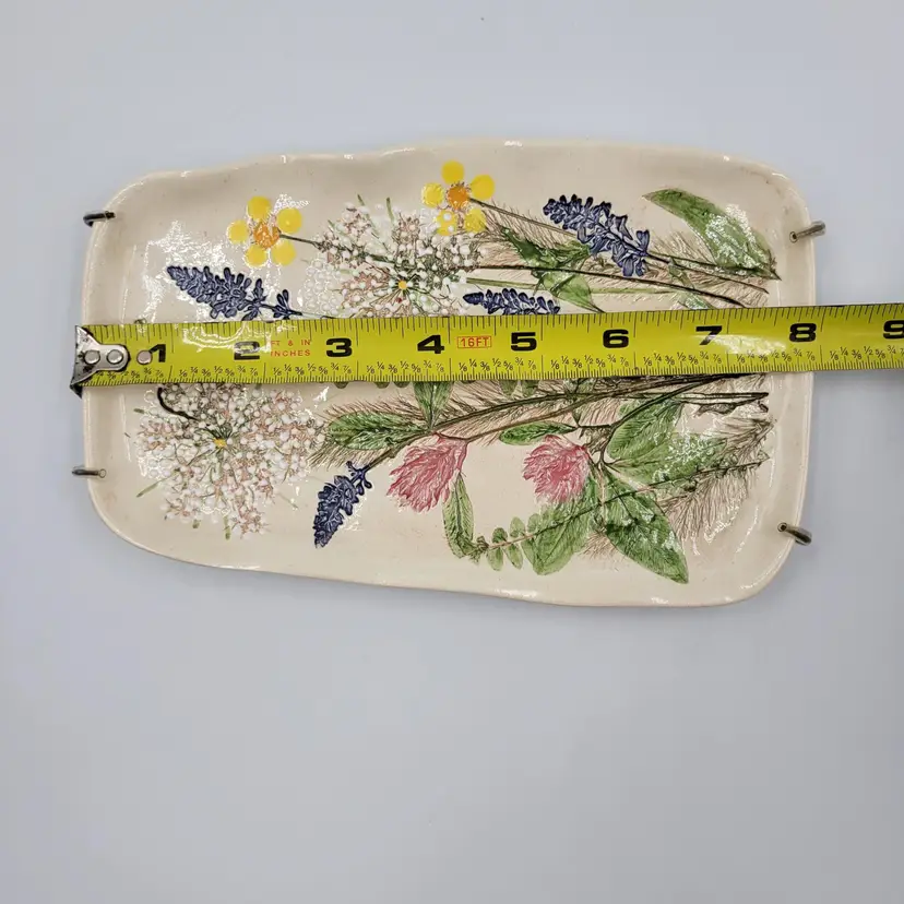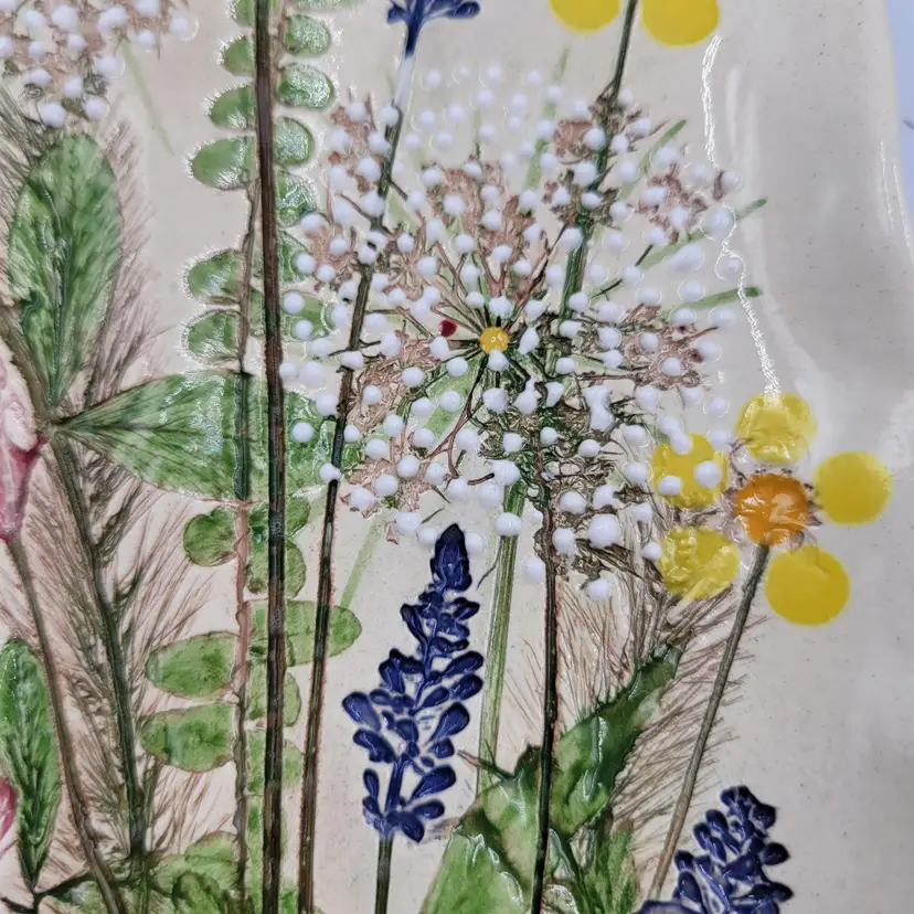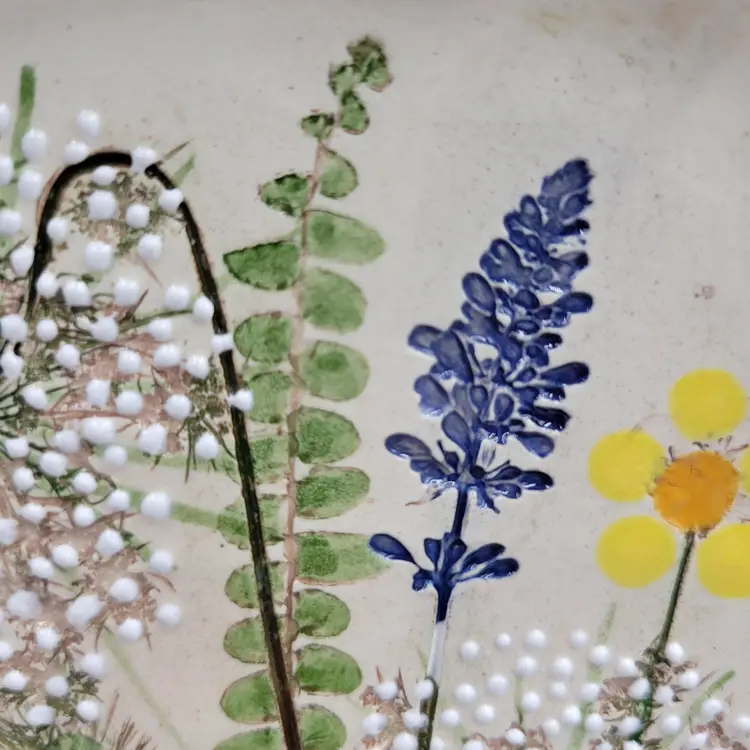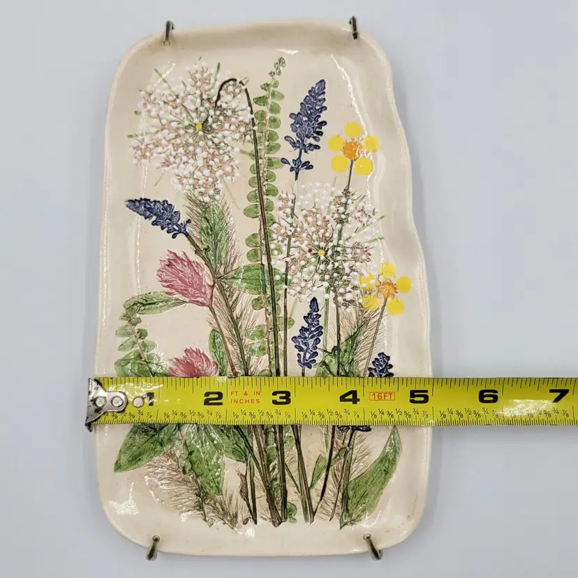This lovely wall plaque is handmade using real flowers. Darlene and Keith Fletcher from Marion NC hand press these flowers into clay then paint and glaze each piece. This piece has Queen Ann's Lace, Blue Sage, Pink Clover, Buttercup, Button Fern and Foxtail Grass pressed onto it. This piece measures about 8 inches tall and is about 5 inches at it's widest part. It is signed on the back and comes with a card describing the piece. It comes with a metal plate hanger to hang it on the wall (see photos).