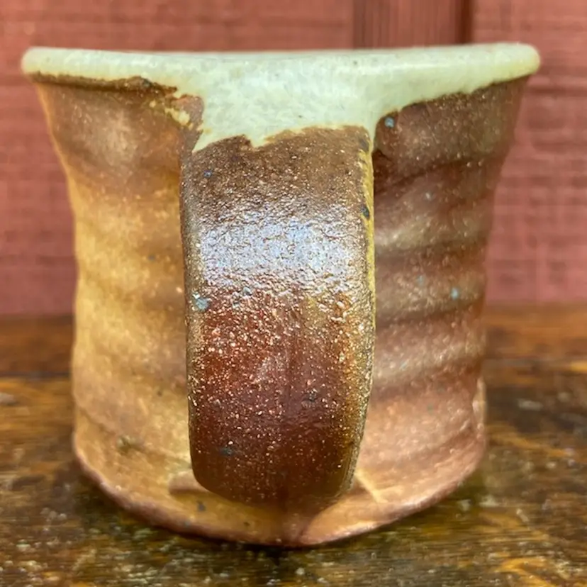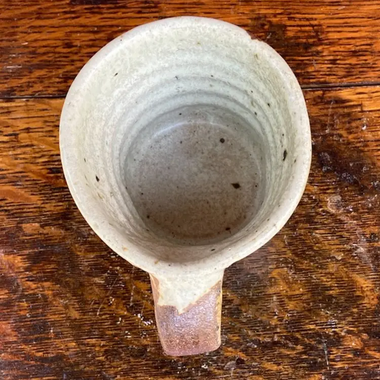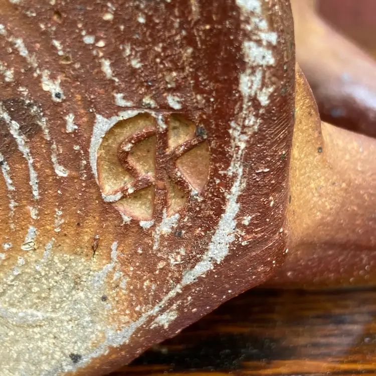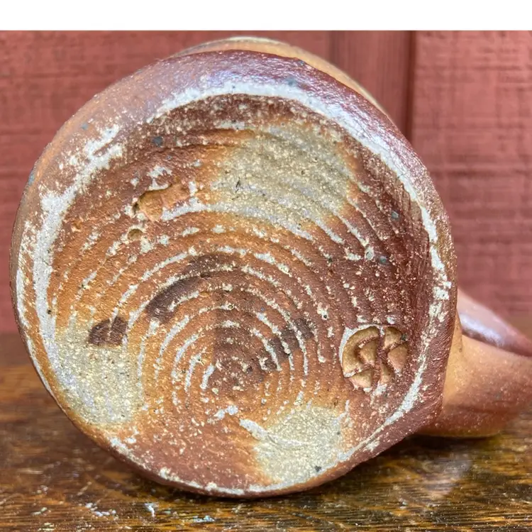 Approx 5”w (including handle) x 3”h, 8oz. Pre-owned condition. No chips or cracks. Artist stamped “SK”. Signature stamp is very similar to that of Taos potter, Stephen Kilborn.