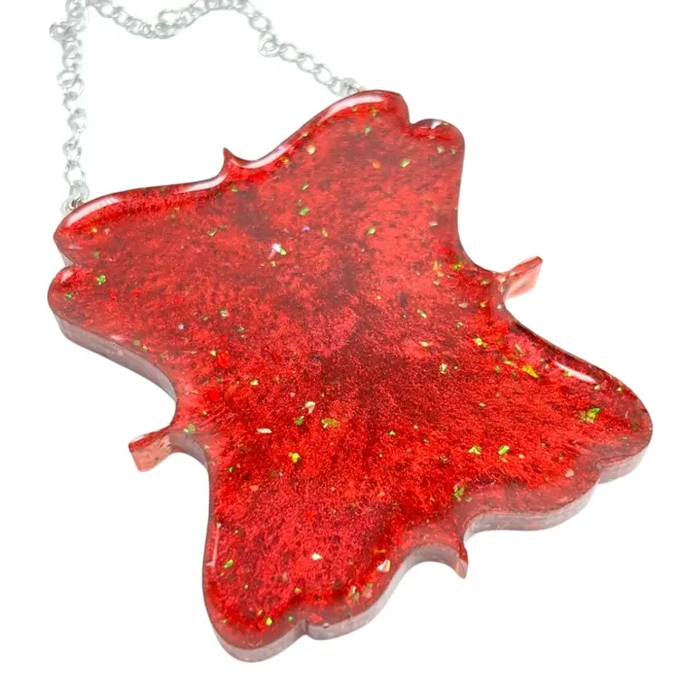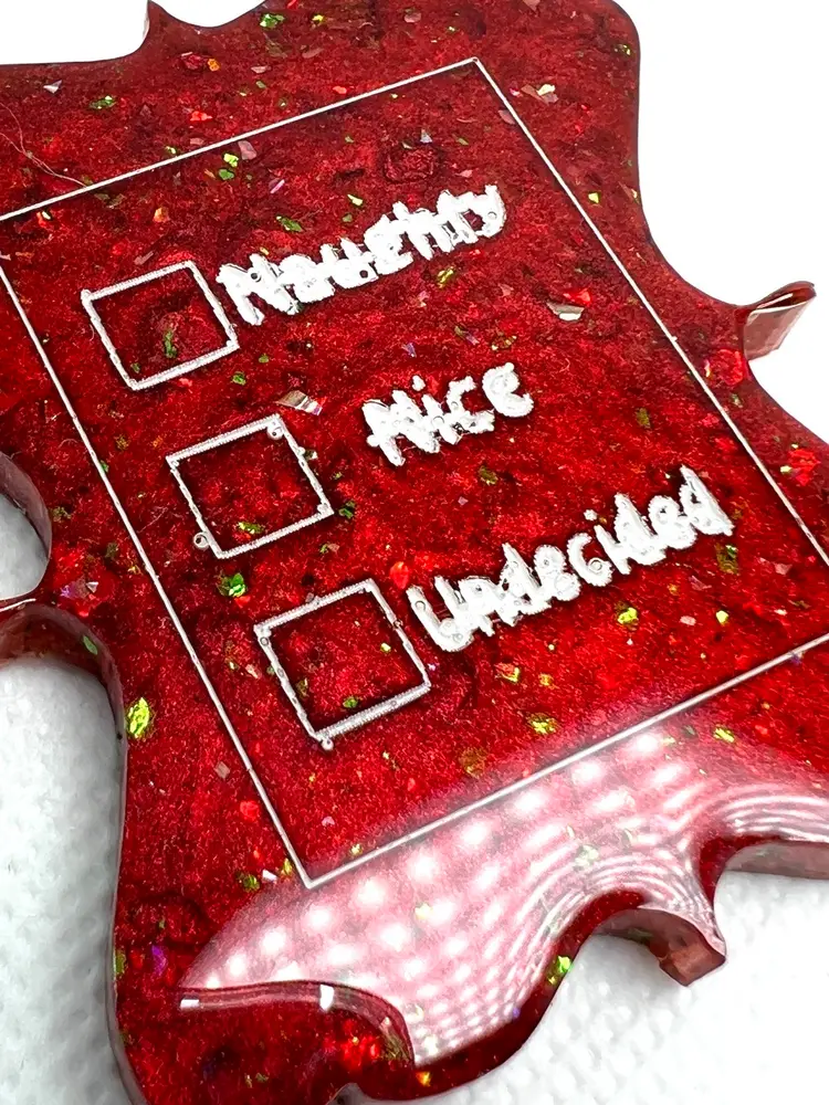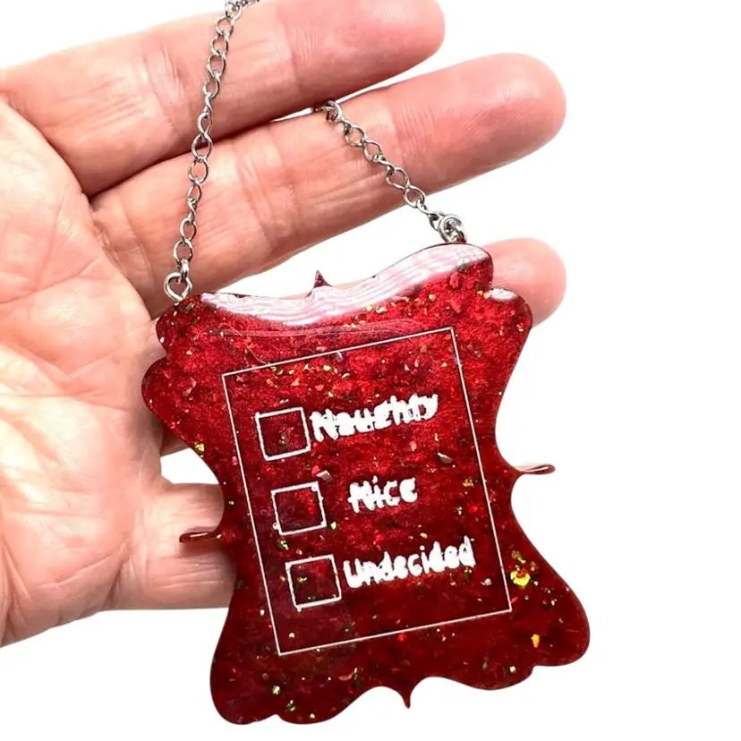 Handmade by me ๐ซถ ๐ Santa Naughty Nice Undecided Checklist. Red Glitter Resin Ornament. Comes with stainless steel chain. 2-3/8โ x 2โ x 3/16โ Total drop length 4-3/8โ
