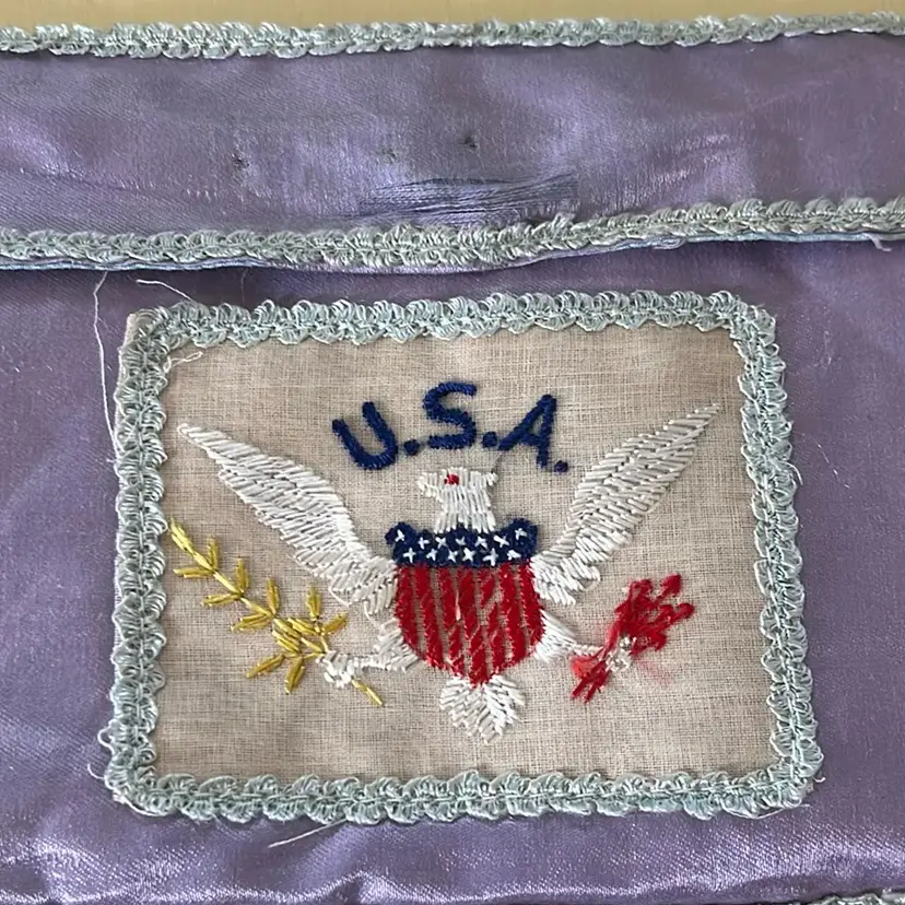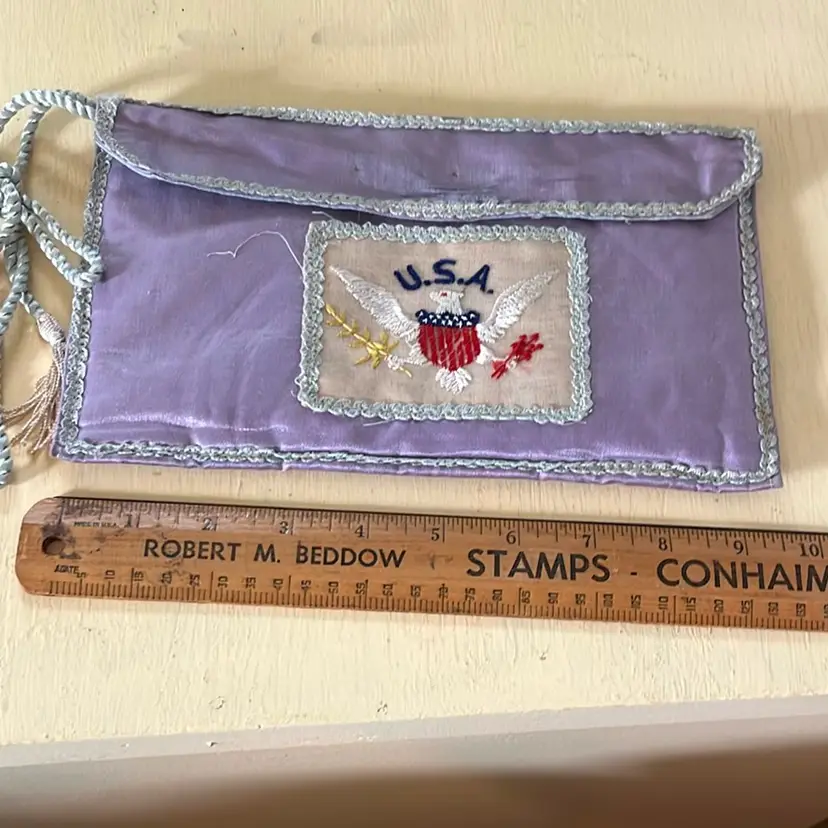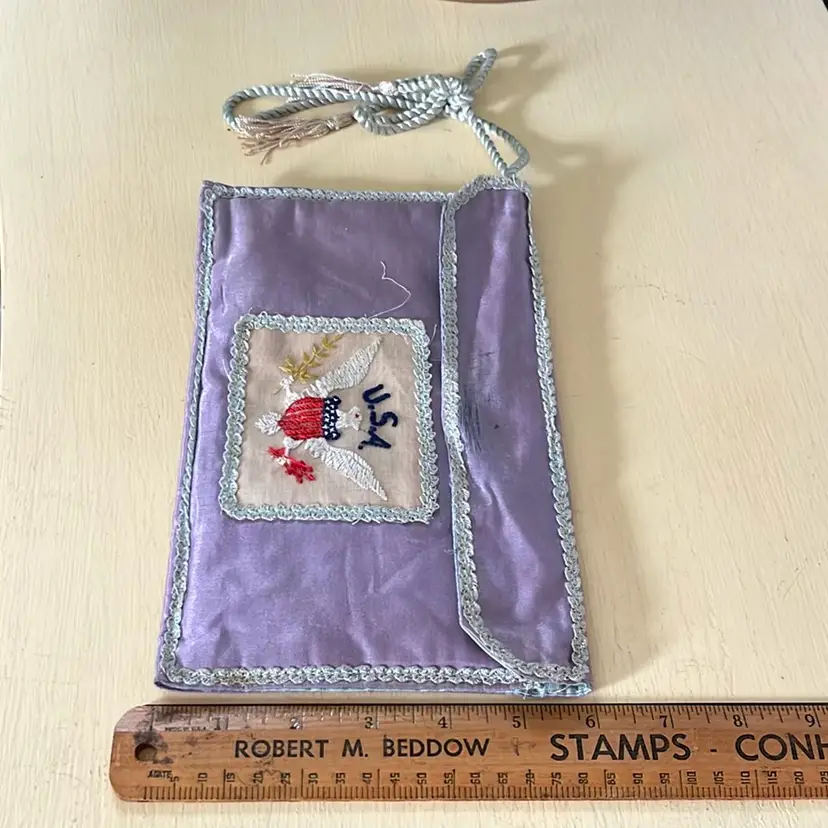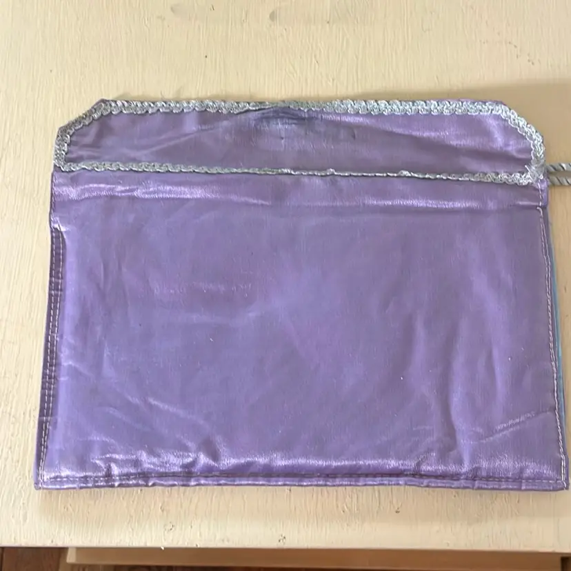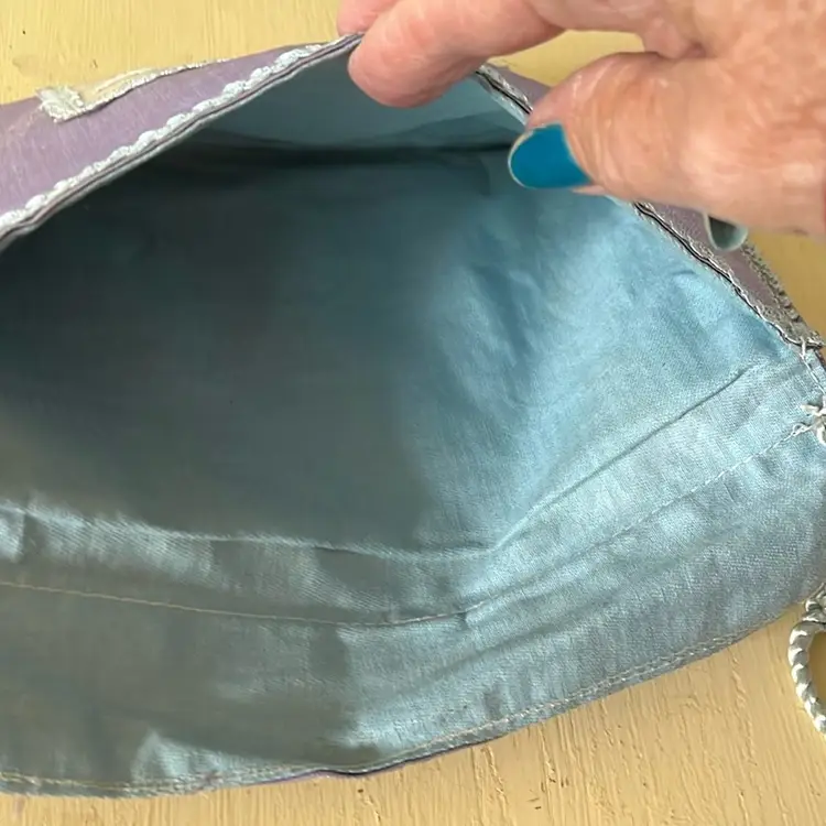 Not sure if silk but shiny lavender lined in blue with blue cord tassel handle. 9.5x6” . Wear and tear as shown at top middle flap