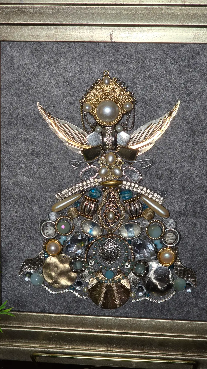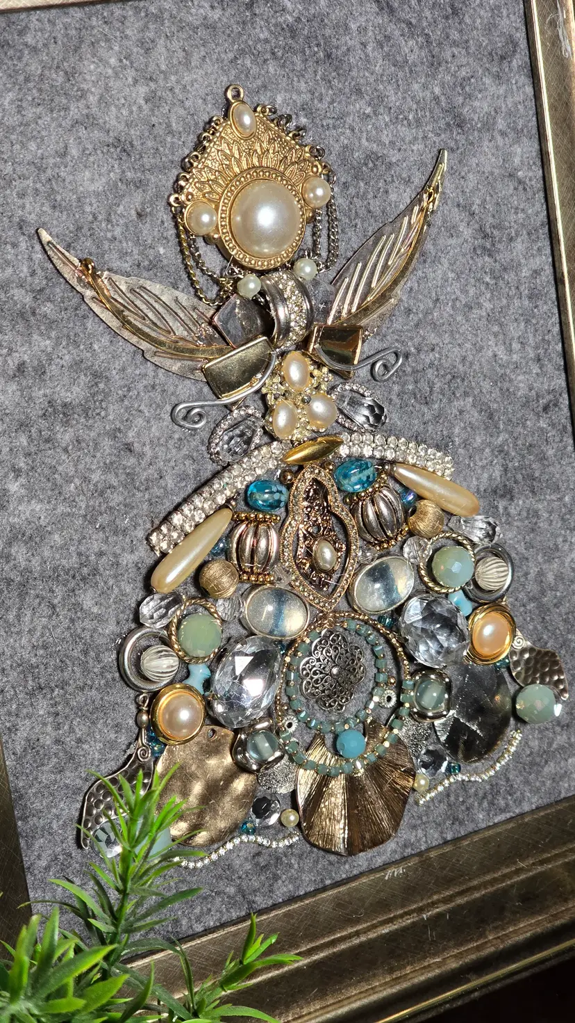 This exquisite angel artwork is crafted entirely from repurposed vintage jewelry pieces, giving it a stunning mix of sparkle, texture, and metallic shine. Each element was carefully selected and placed to form a beautifully layered angel with pearl accents, glass stones, rhinestones, and intricate metal details.