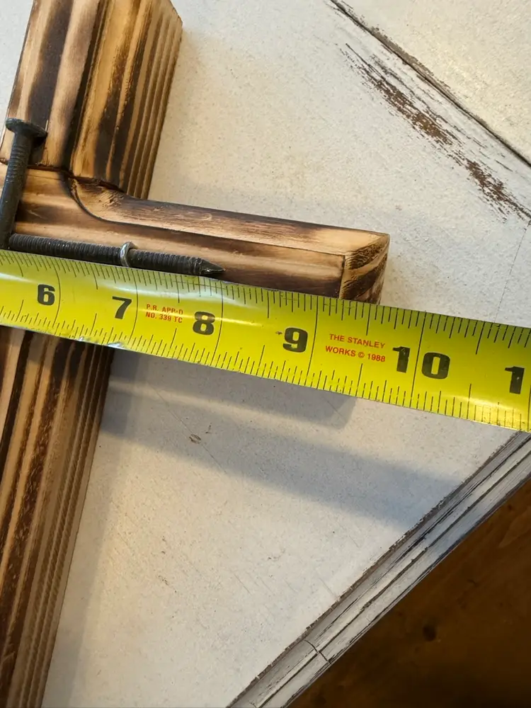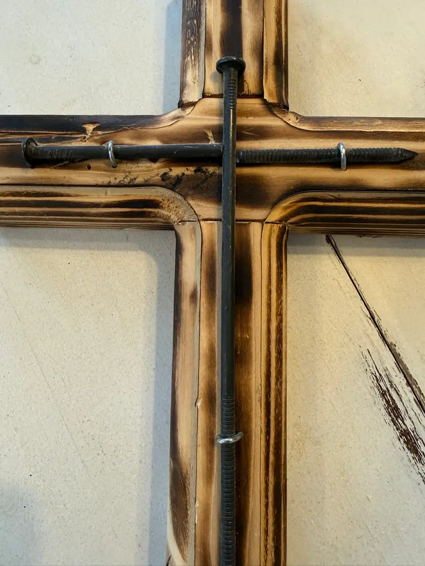 his product is a handmade wooden cross with three nails, measuring 10" x 14", designed as a religious wall hanging. Made from wood and metal materials, this piece is a symbol of Christianity and is crafted with care and attention to detail. It would make a meaningful addition to any collection or as a thoughtful gift for someone who appreciates religious decor.