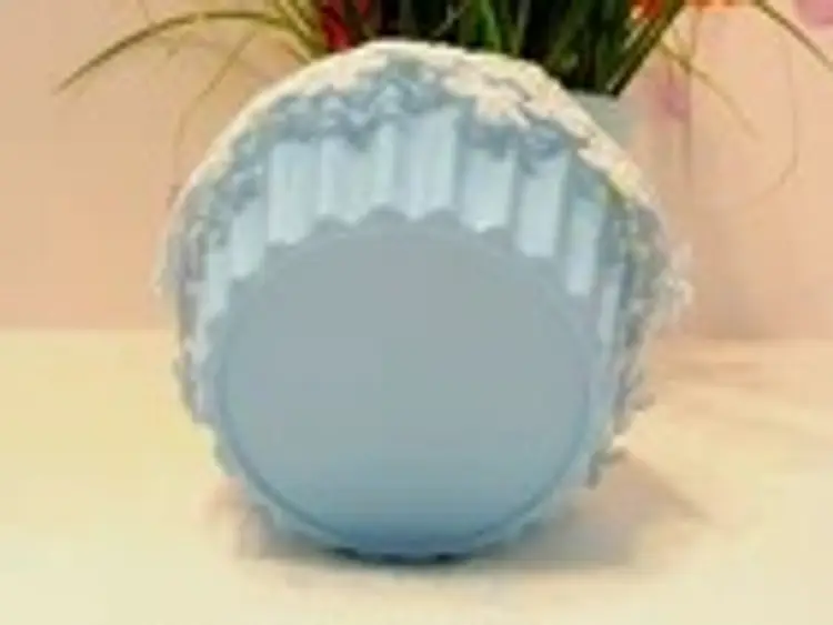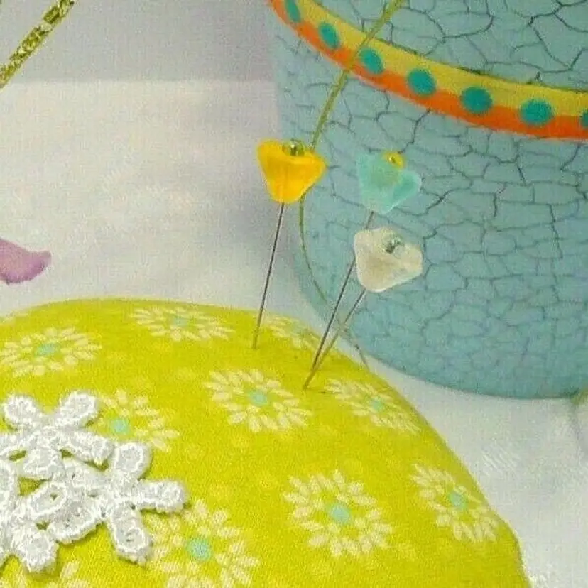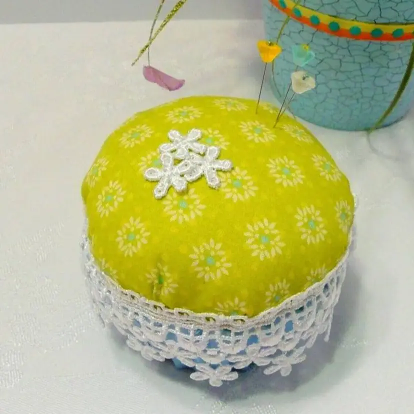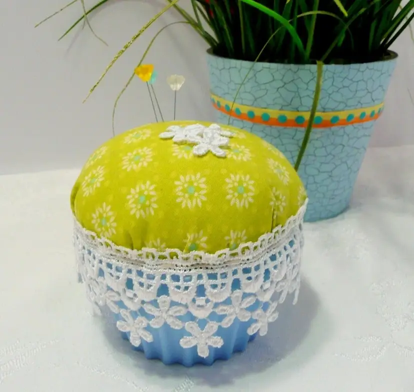 A really cute cupcake style handmade pincushion Blue plastic cupcake holder yellow green floral fabric top white flower appliques on top White floral lace accent 3 x 4" wide decorative flower/bead straight pins 3" tall