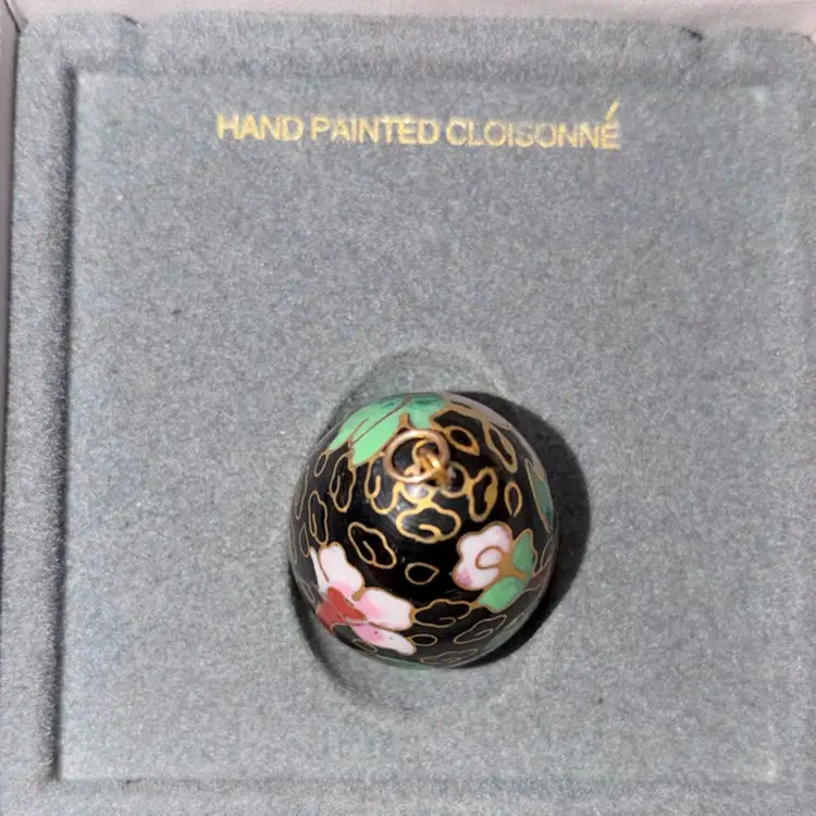 Beautiful vintage cloisonne egg pendant. Pink, white and reddish flowers with light and dark green leaves on black with gold outlines and touches. 2”L x 1.5”W