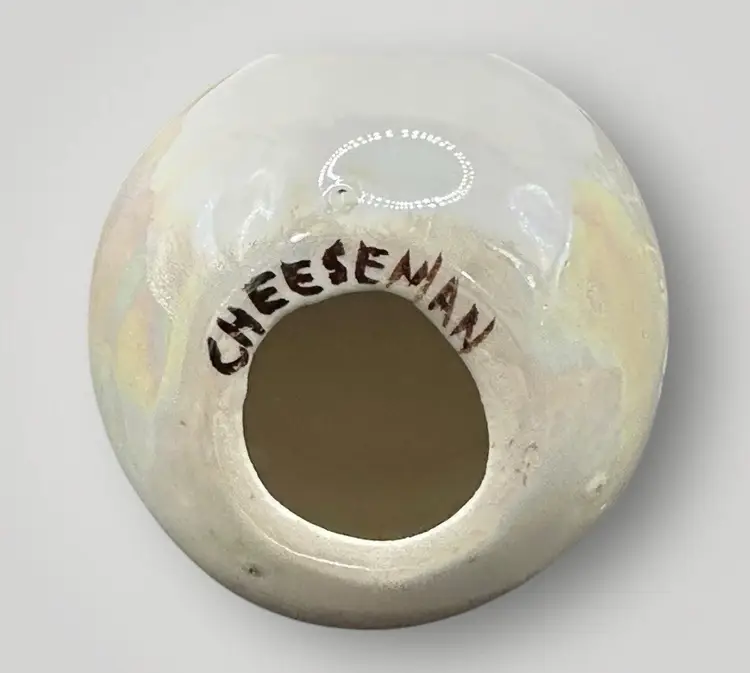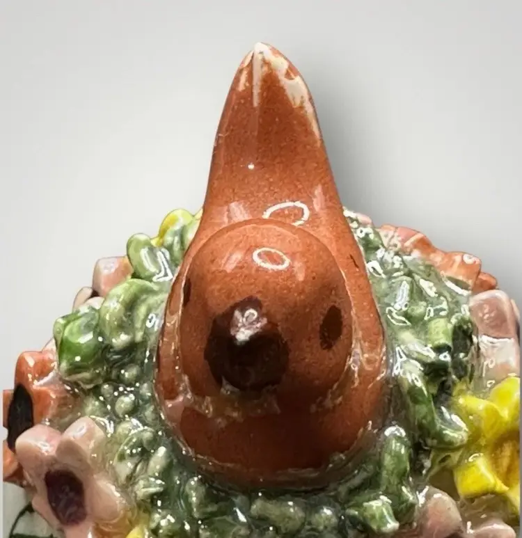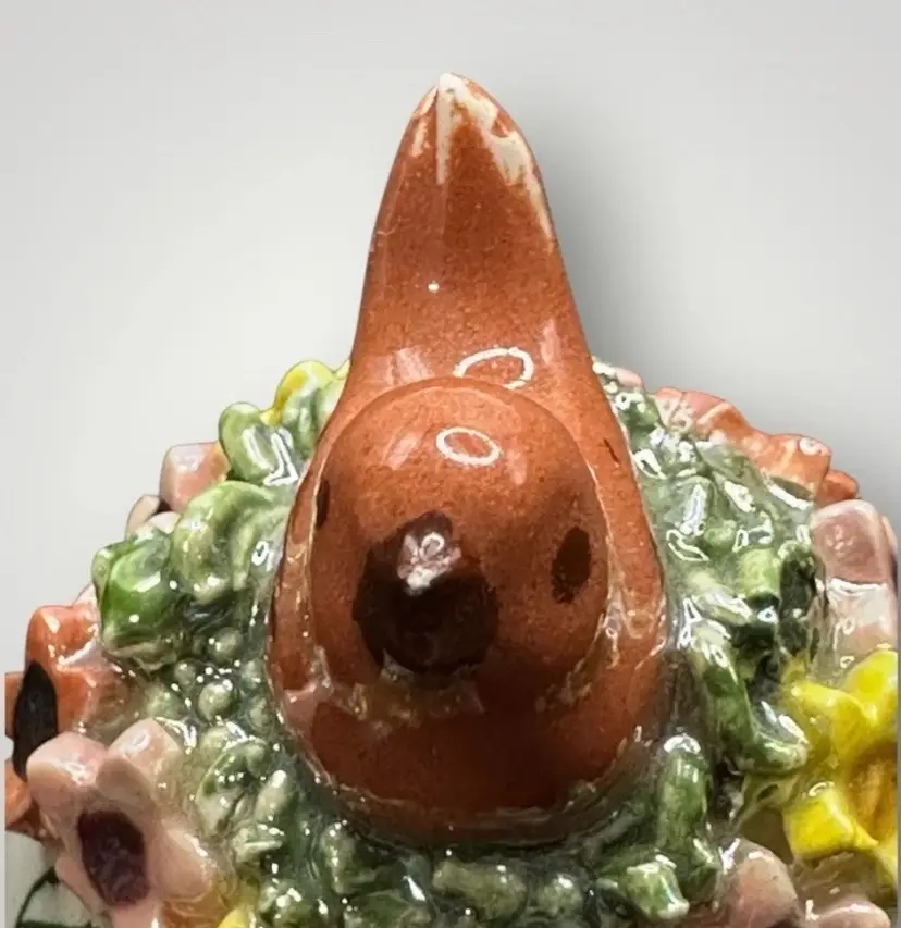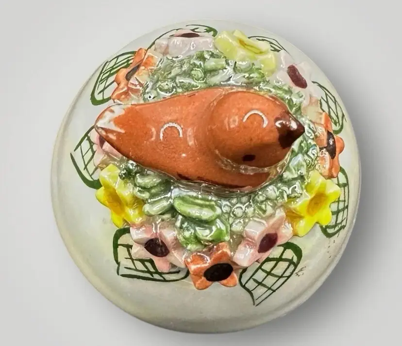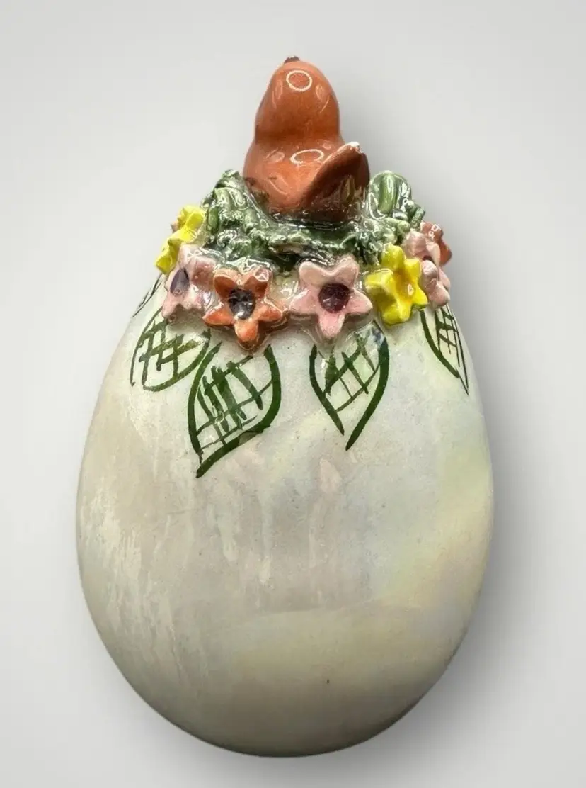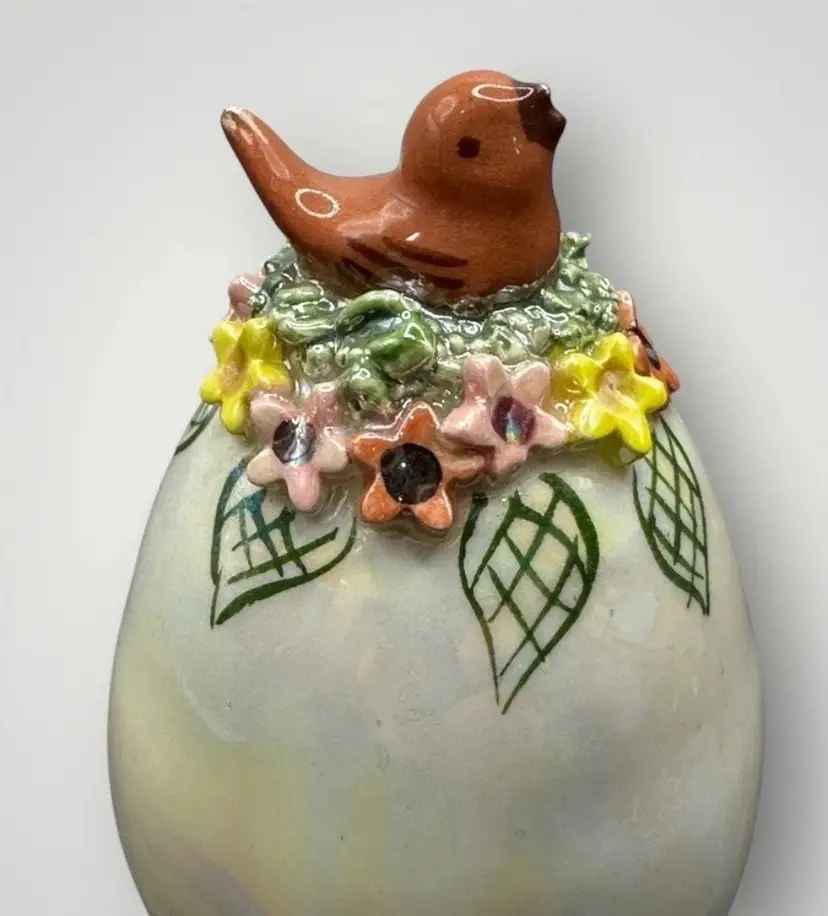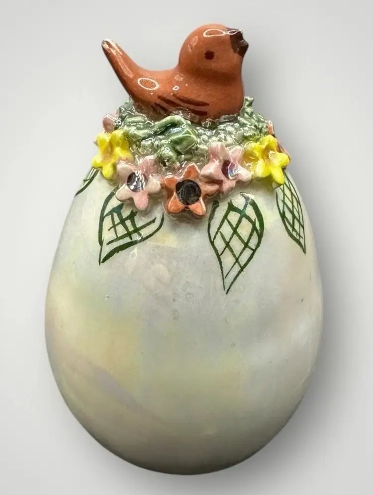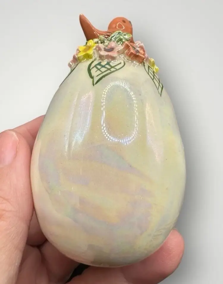Very delicate porcelain egg, handpainted. Has a little bird on the top and a ring of flowers. Iridescent glaze. Signed “Cheeseman”. Tips of beak and tail have some paint loss, or were just missed during painting.