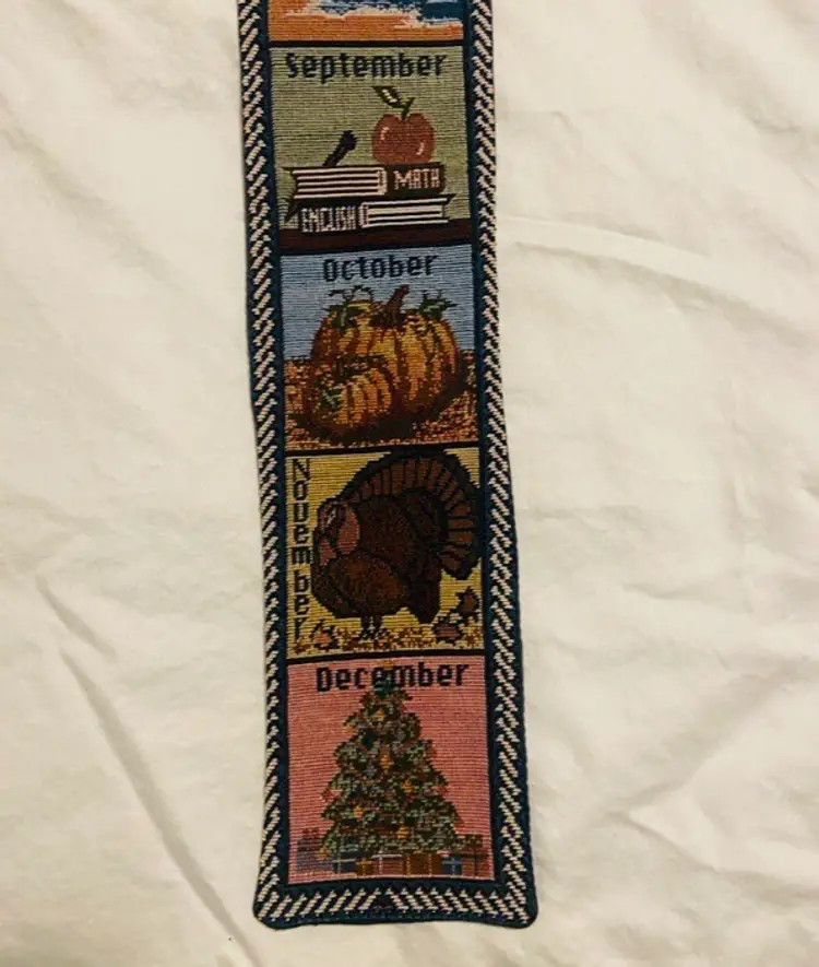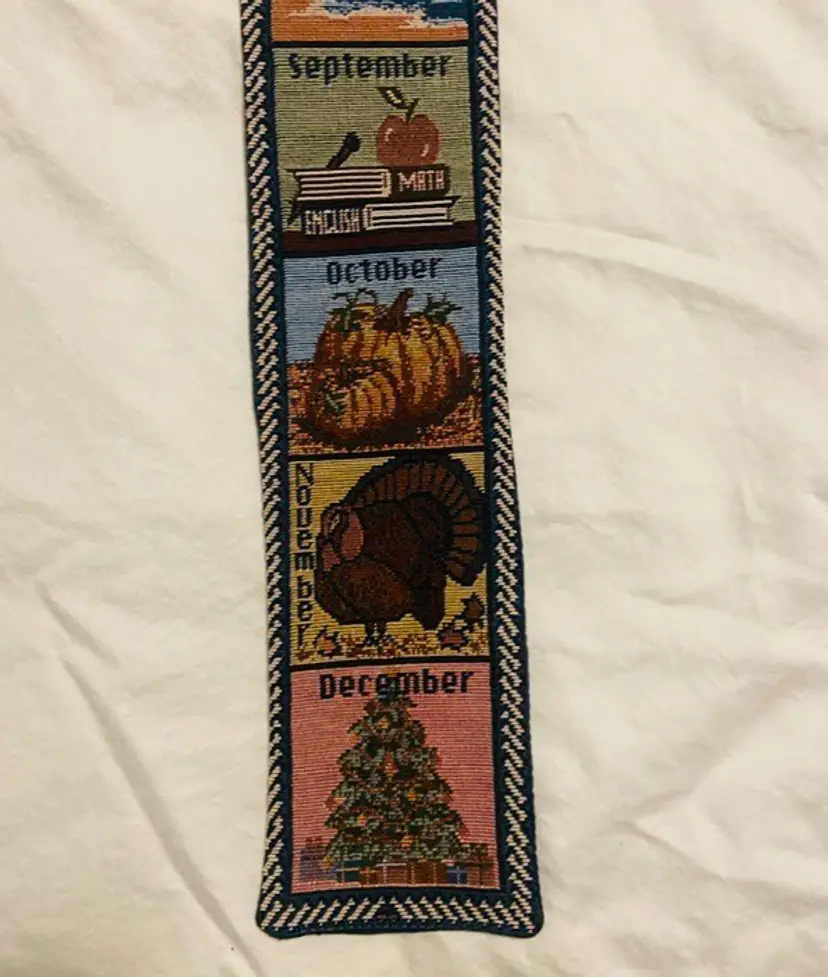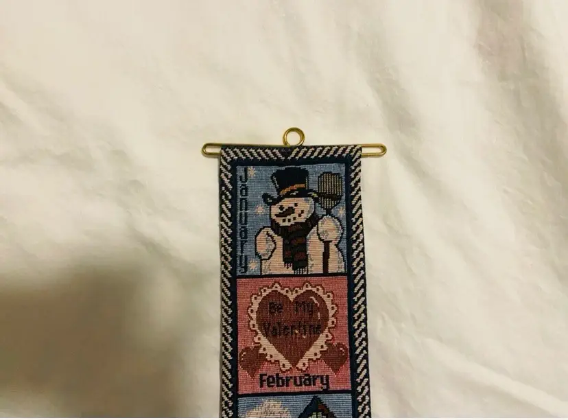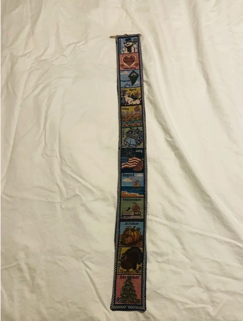 This beautifully detailed hanging tapestry featuring the months of the year and their holidays. Perfect for bringing warmth, color, and a touch of whimsy to any wall, this textile piece blends art and function — making it a delightful addition to your home all year round. Has a brass hanger. In good used condition. No rips or tears.