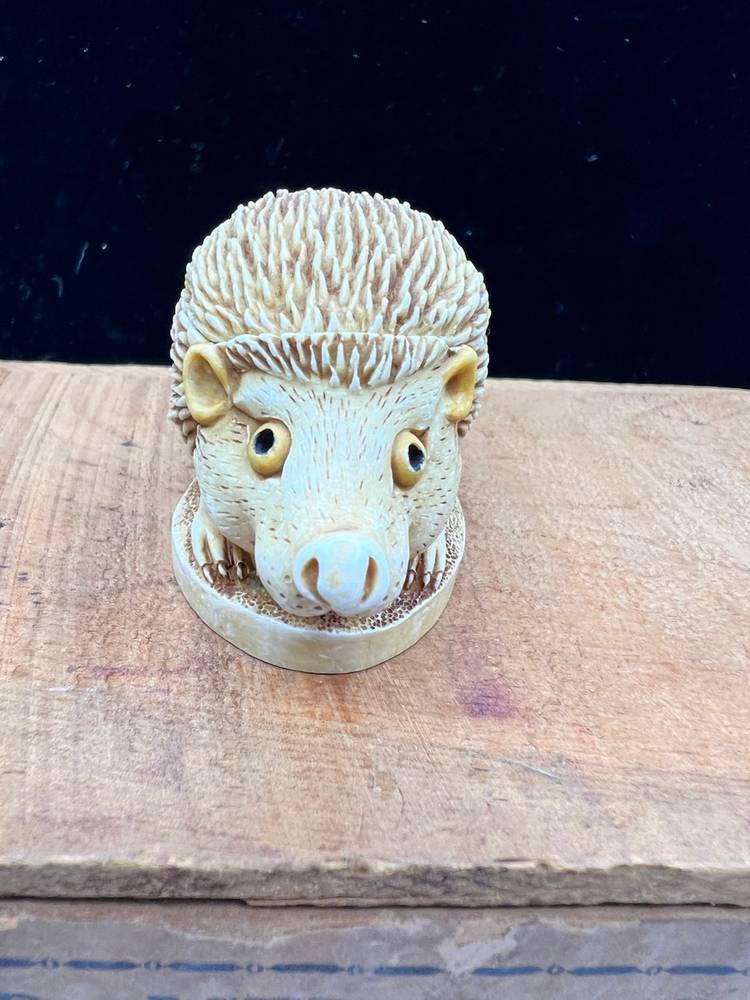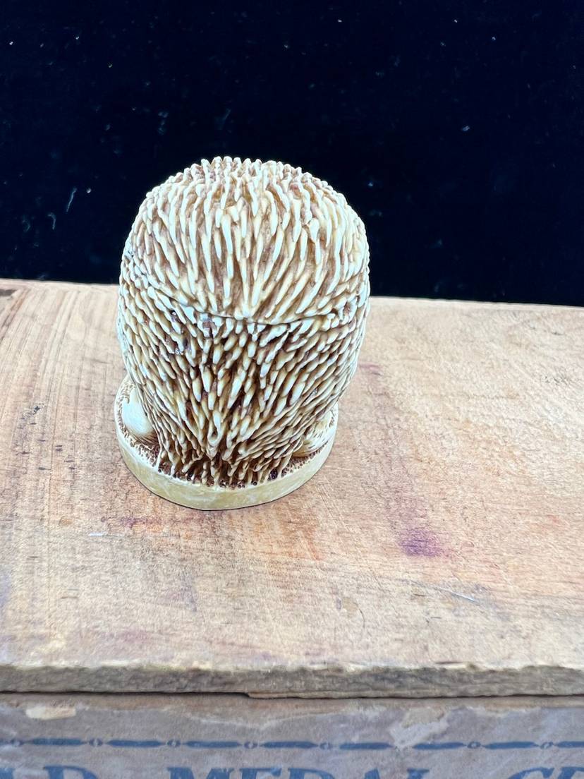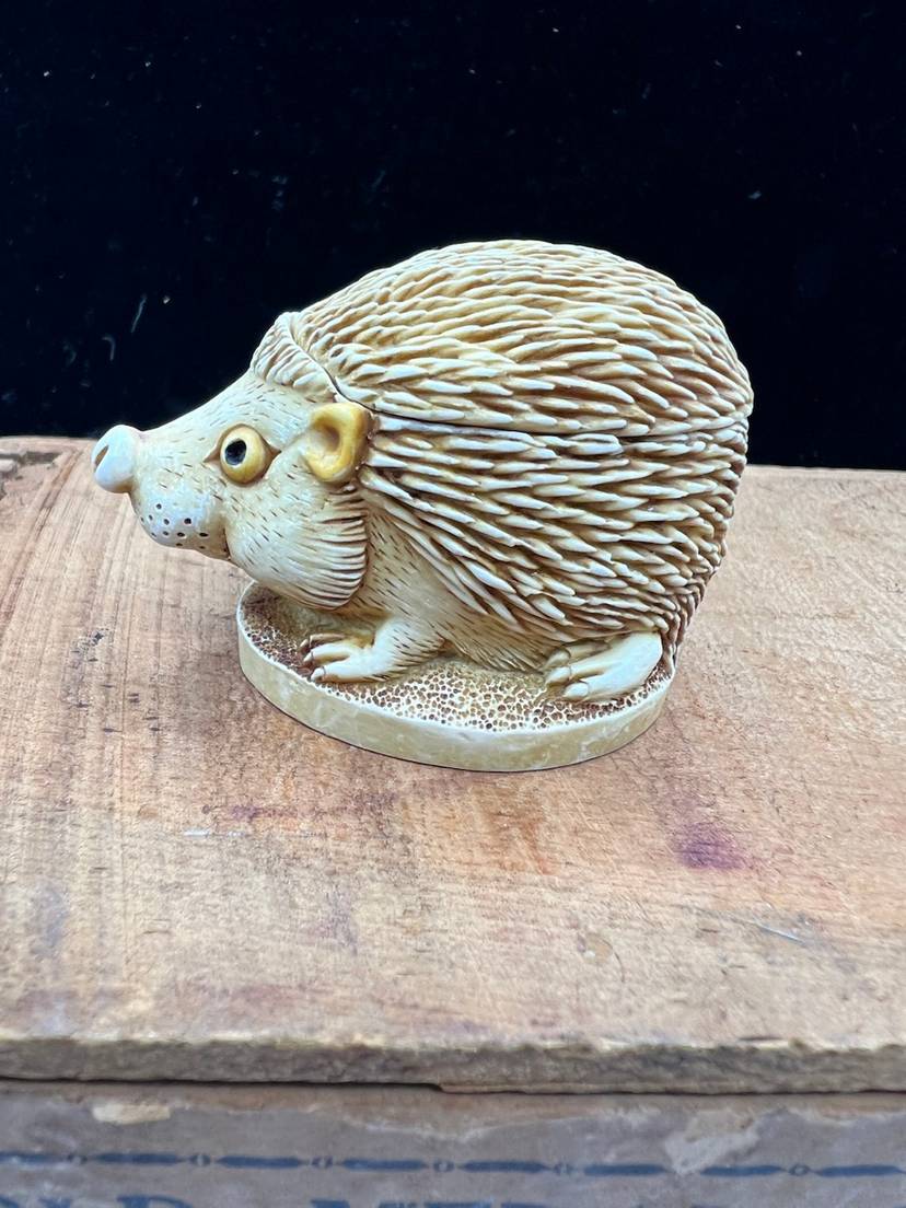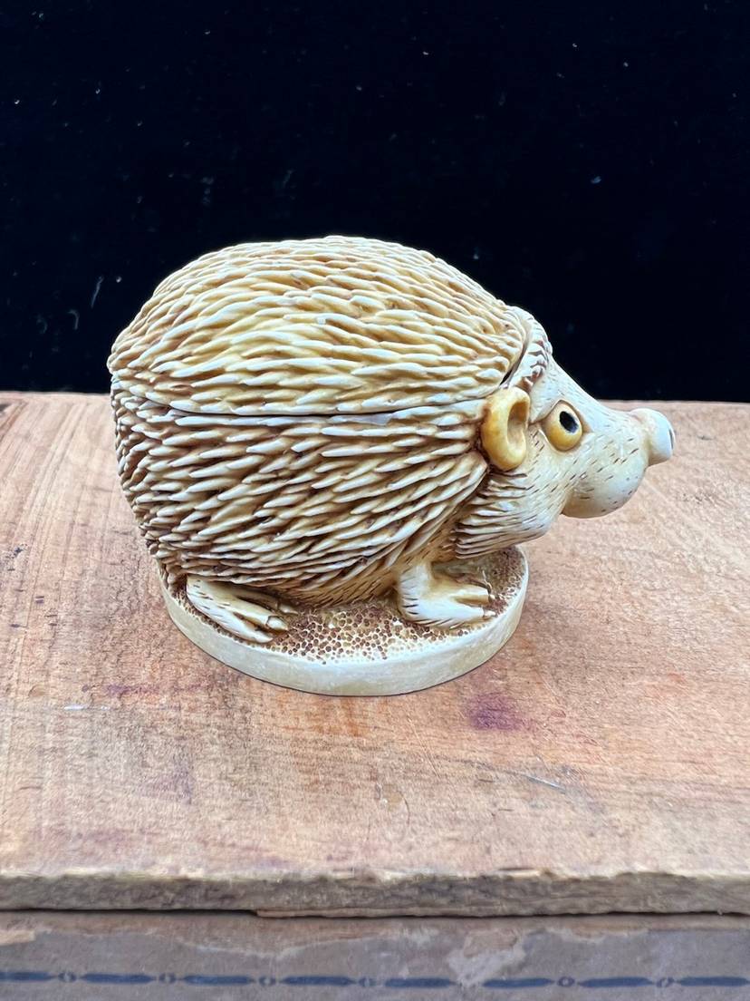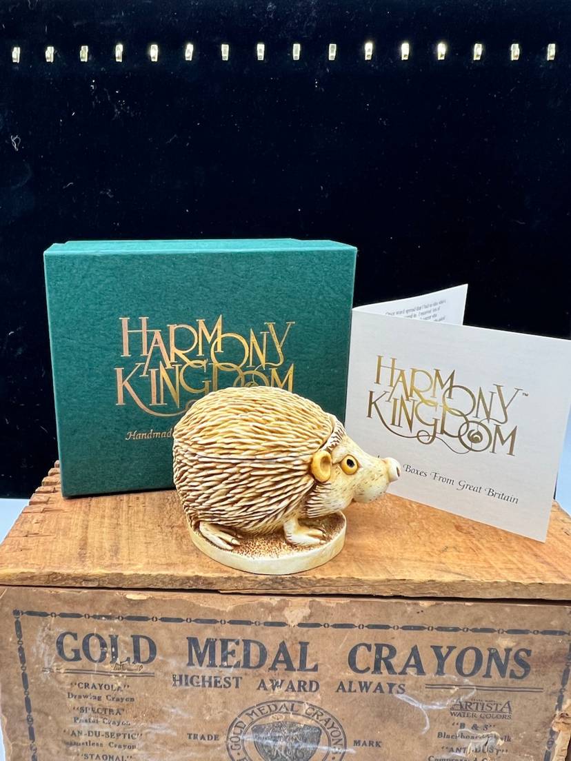 HARMONY KINGDOM-TREASURE JEST “UNTOUCHABLE” HEDGEHOG FIGURINE. ONLY 1889 MADE AND IT IS ONE OF THE FIRST AND HAS NO HIDDEN MOUSE, INSCRIPTIONS OR INNER CARVINGS. IT IS MADE OF CRUSHED MARBLE AND RESIN. PETER CALVESBERT WAS THE ARTIST OF THIS DEVINE PIECE. THIS HAS THE ORIGINAL BOX AND INFORMATION CARD ABOUT THE ARTIST AND THE VILLAGE PEOPLE THAT HELP PUT ON THE COLOR AND HIGHLIGHTS. WAS CARVED IN 1994 RELEASE DATE WAS 9/1/1994 AND RETIREMENT DATE WAS 1/1/1995