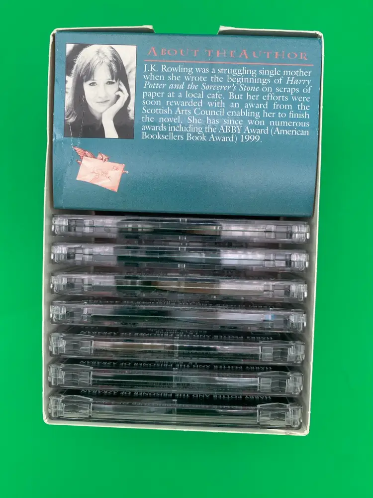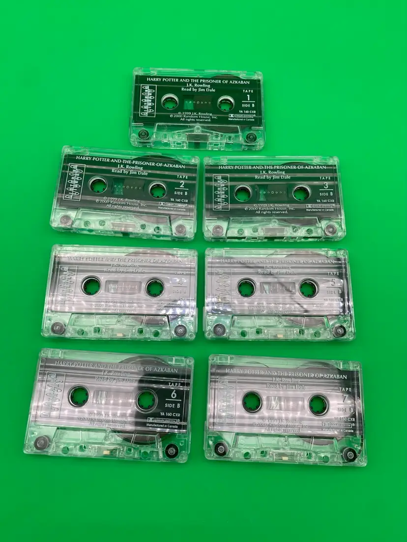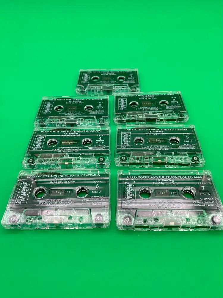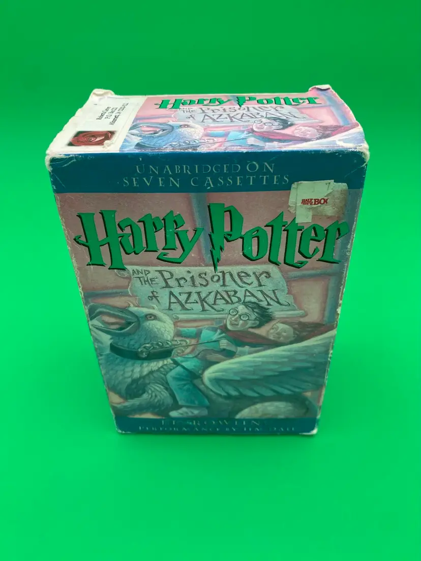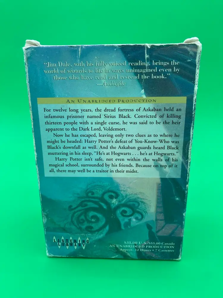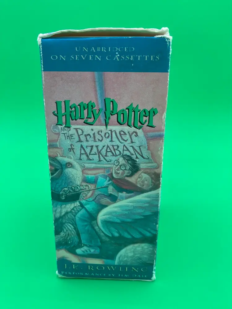 You are purchasing one Harry Potter and the Prisoner of Azkaban Unabridged 7-Cassette Audiobook by J.K. Rowling, Jim Dale and Listening library from 2000. This Set is in overall great condition. Exterior packaging has some wear that can be seen in the images, including sticker on the top shown in the final image. Interior Packaging is good, and Tapes are in great, clean condition with no cracks or splits.