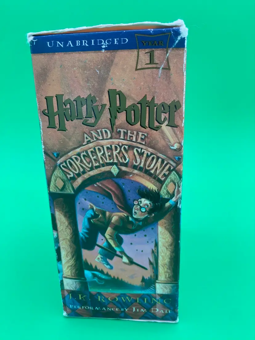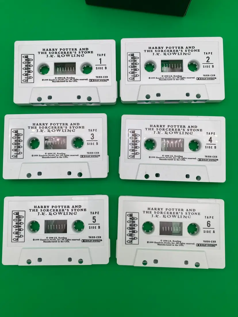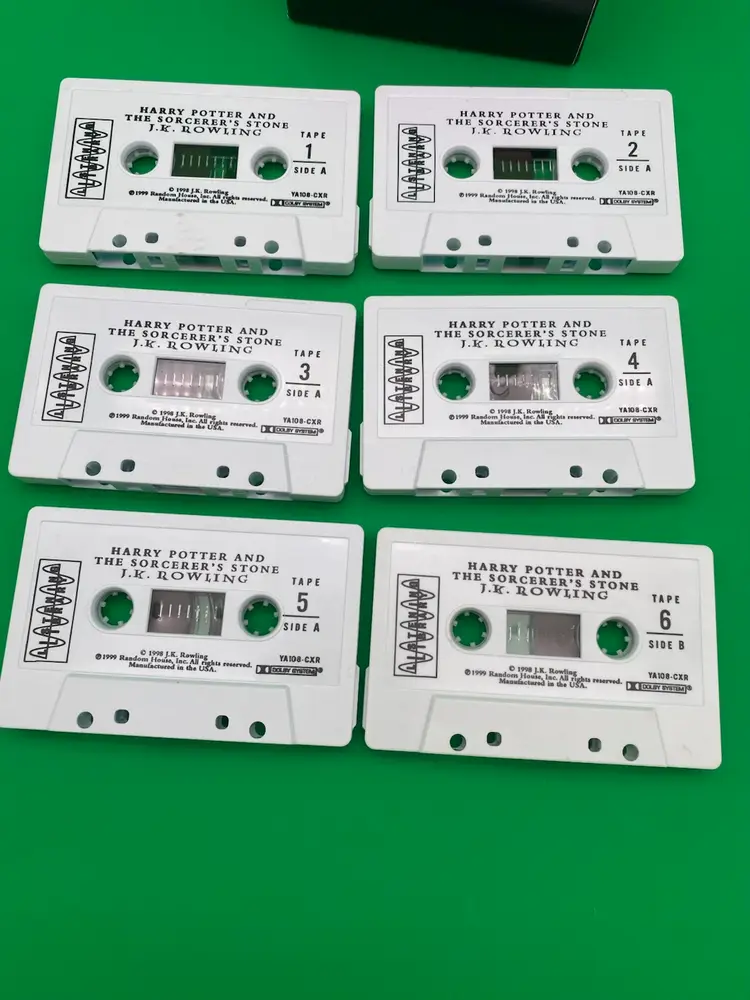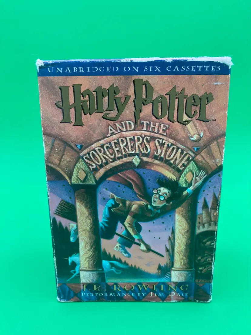 You are purchasing one Harry Potter and the Sorcerer's Stone Unabridged 6-Cassette Audiobook by J.K. Rowling, Jim Dale and Listening Library from 1999. This Set is in overall good condition. Exterior packaging has signs of wear that can be seen in the images. Interior packaging is in great condition. Tapes are all in great and clean condition with no cracking, only flaw of the Tapes can be seen in the final image of a couple marker markings on the top of Tape #4.