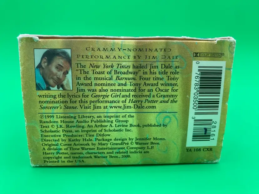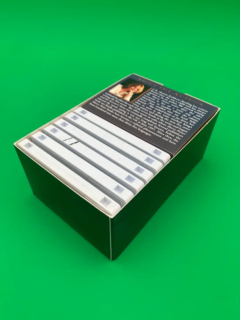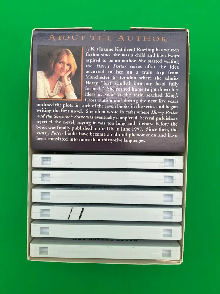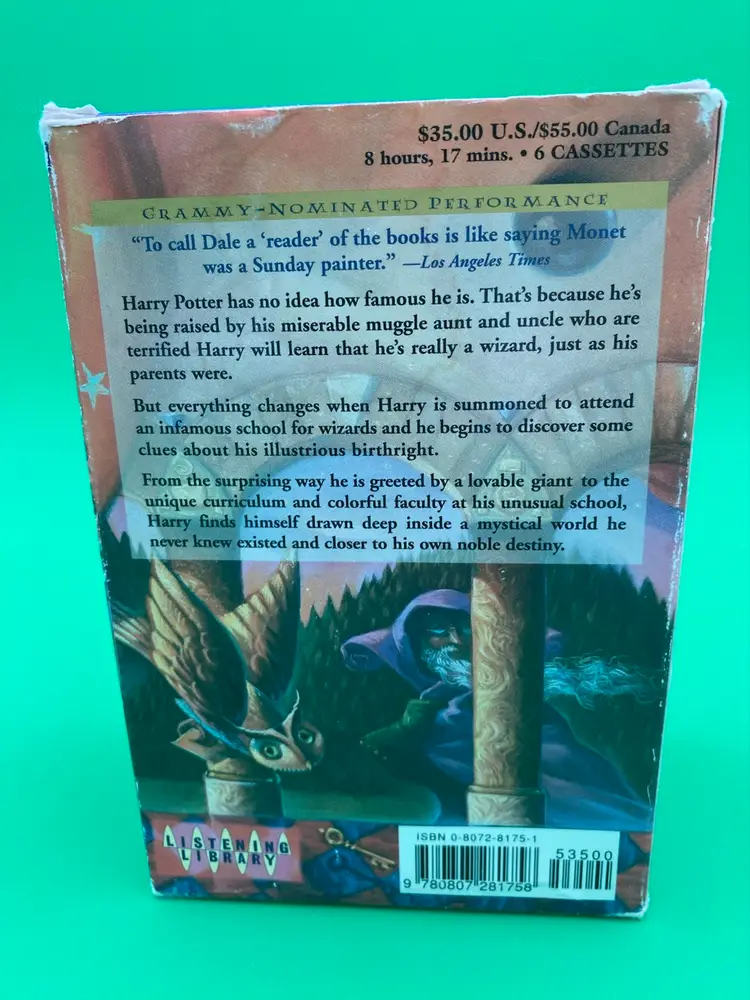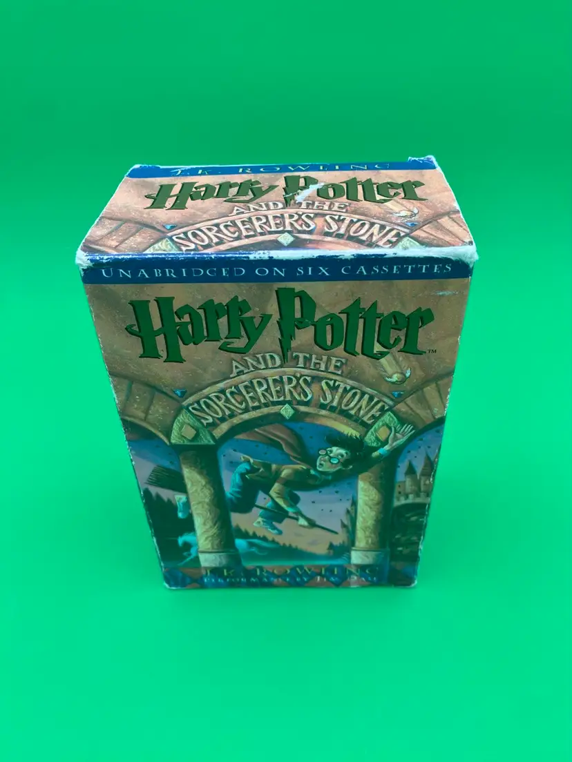 You are purchasing one Harry Potter and the Sorcerer's Stone Unabridged 6-Cassette Audiobook by J.K. Rowling, Jim Dale and Listening Library from 1999. This Set is in overall good condition. Exterior packaging has signs of wear that can be seen in the images. Interior packaging is in great condition. Tapes are all in great and clean condition with no cracking, only flaw of the Tapes can be seen in the final image of a couple marker markings on the top of Tape #4.